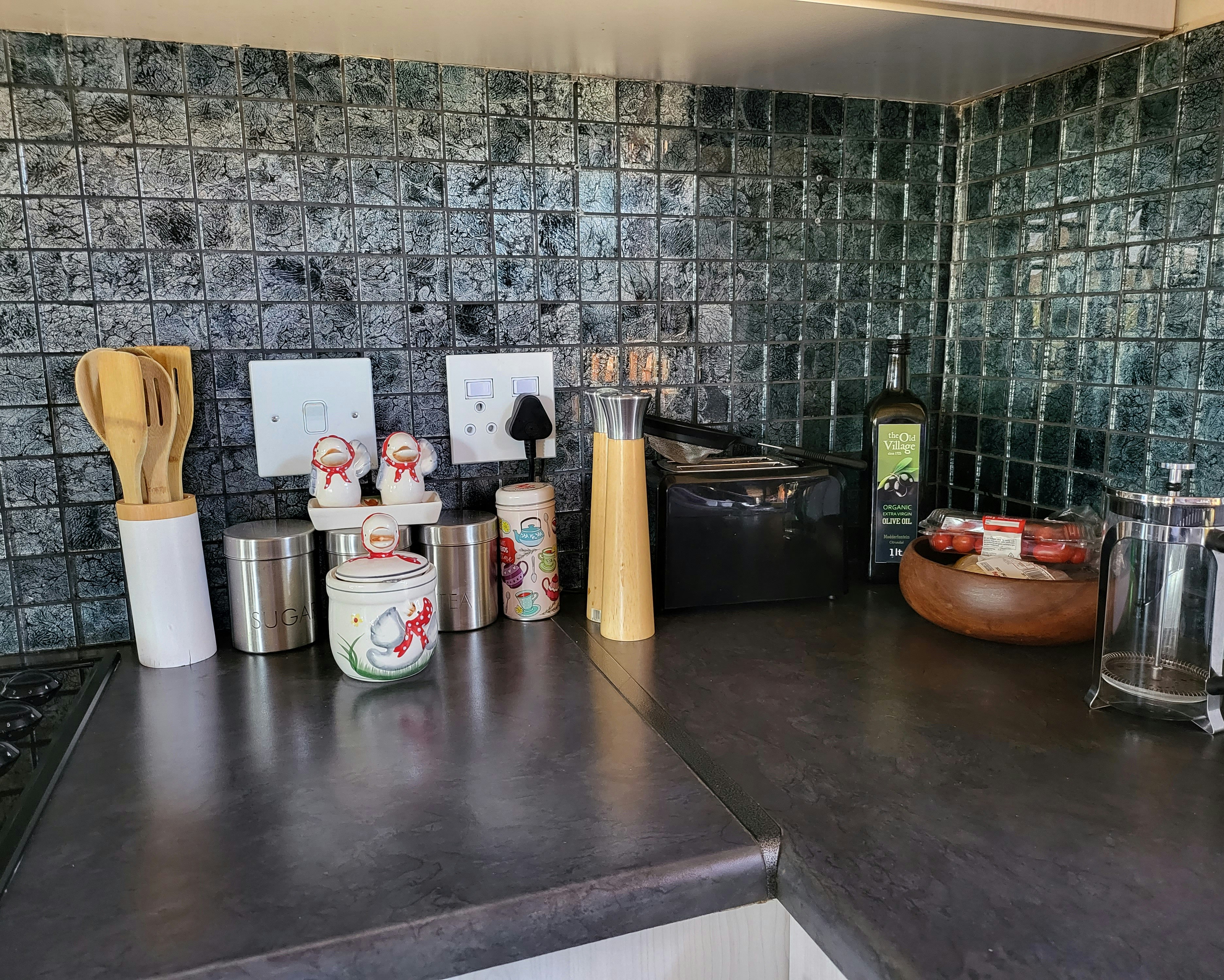 The open-plan kitchen downstairs is equipped with a fridge-freezer, stove, oven, microwave, dishwasher, washing machine, basic cutlery, crockery, and tea- and coffee-making facilities. This area further extends into the second living area with extra seating and a single sleeper couch.