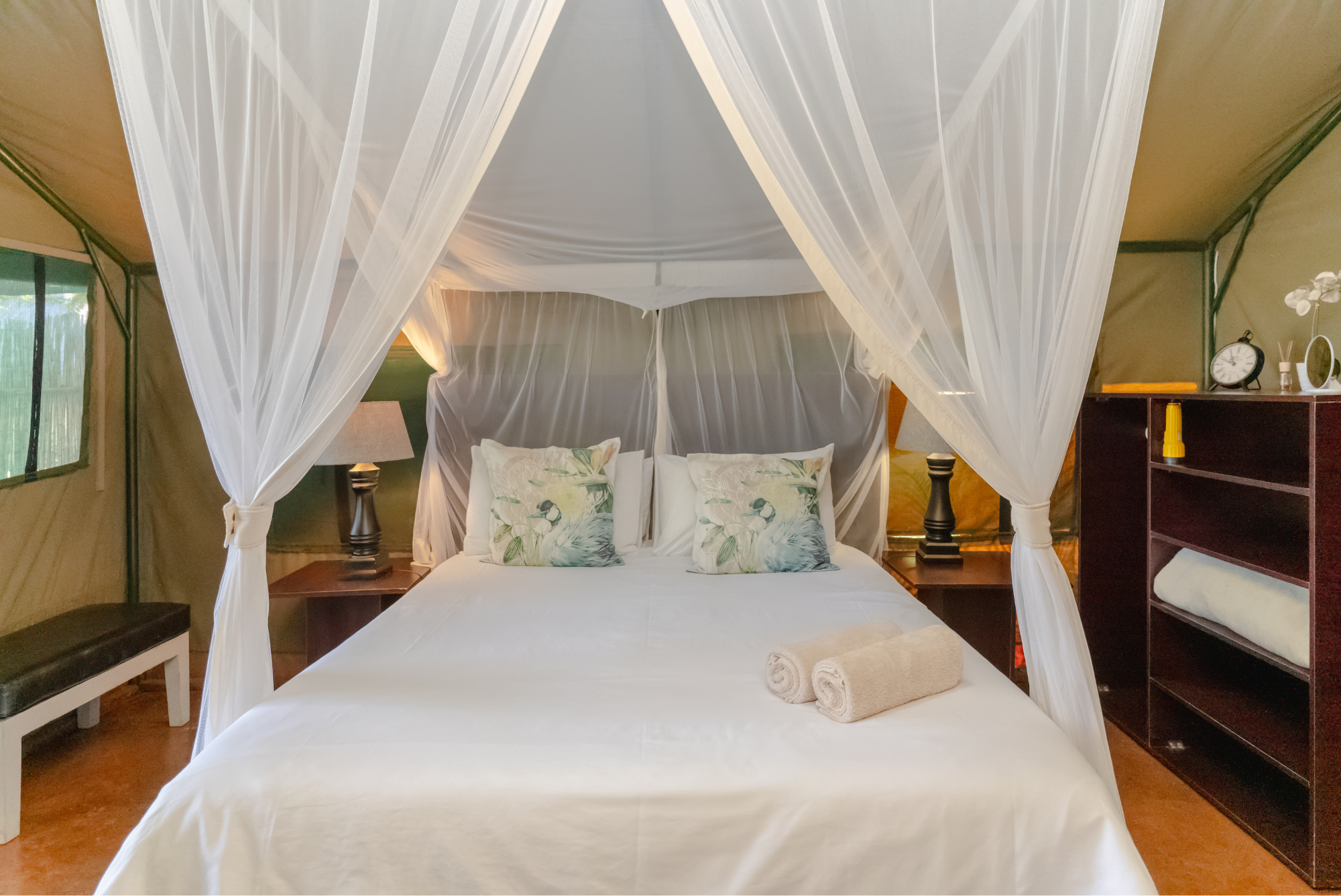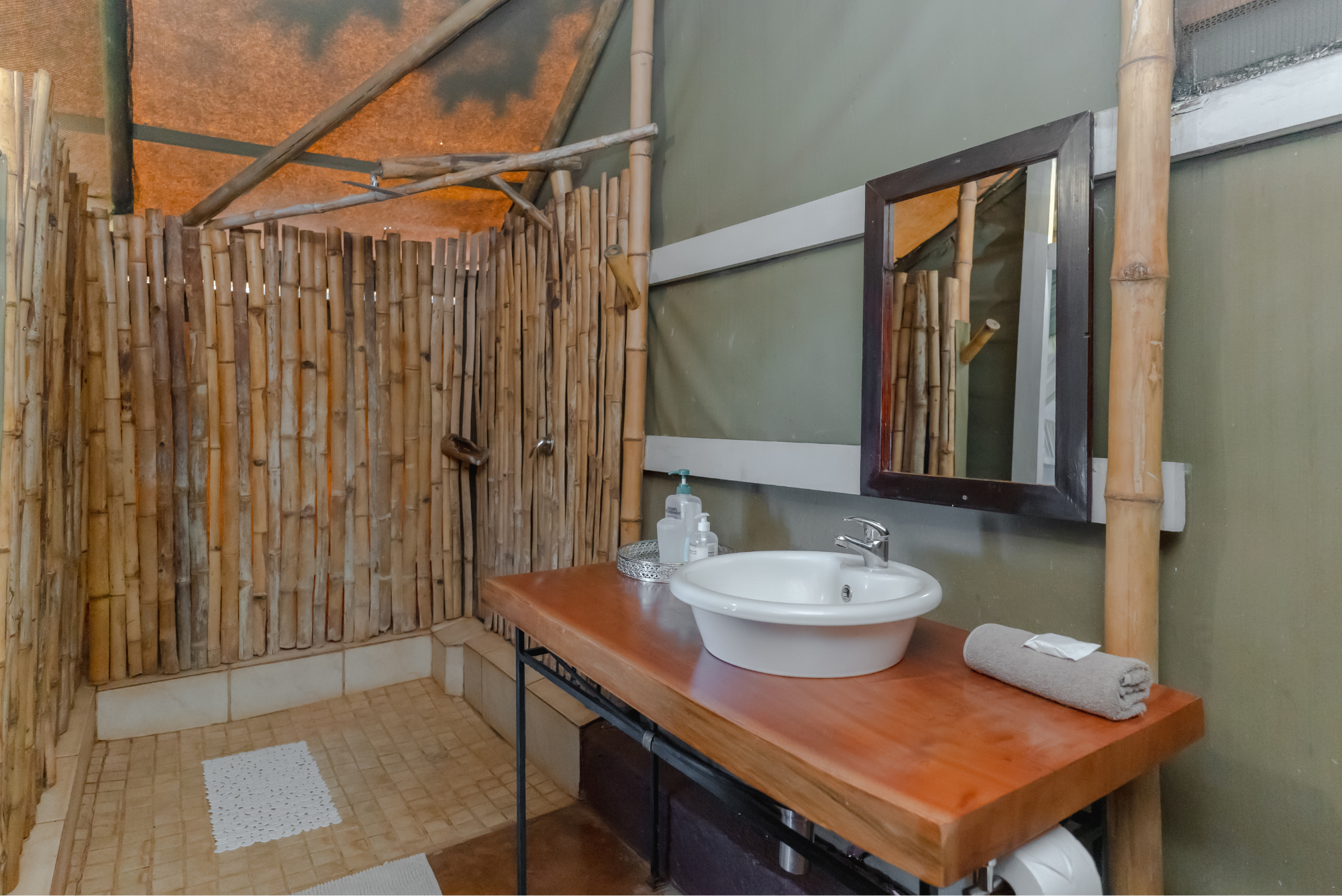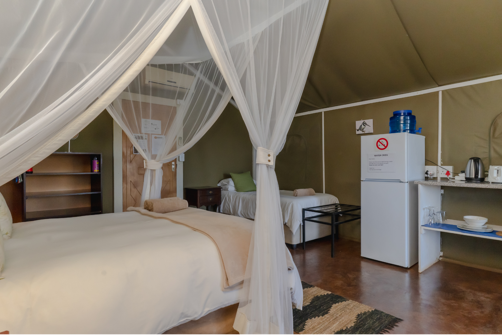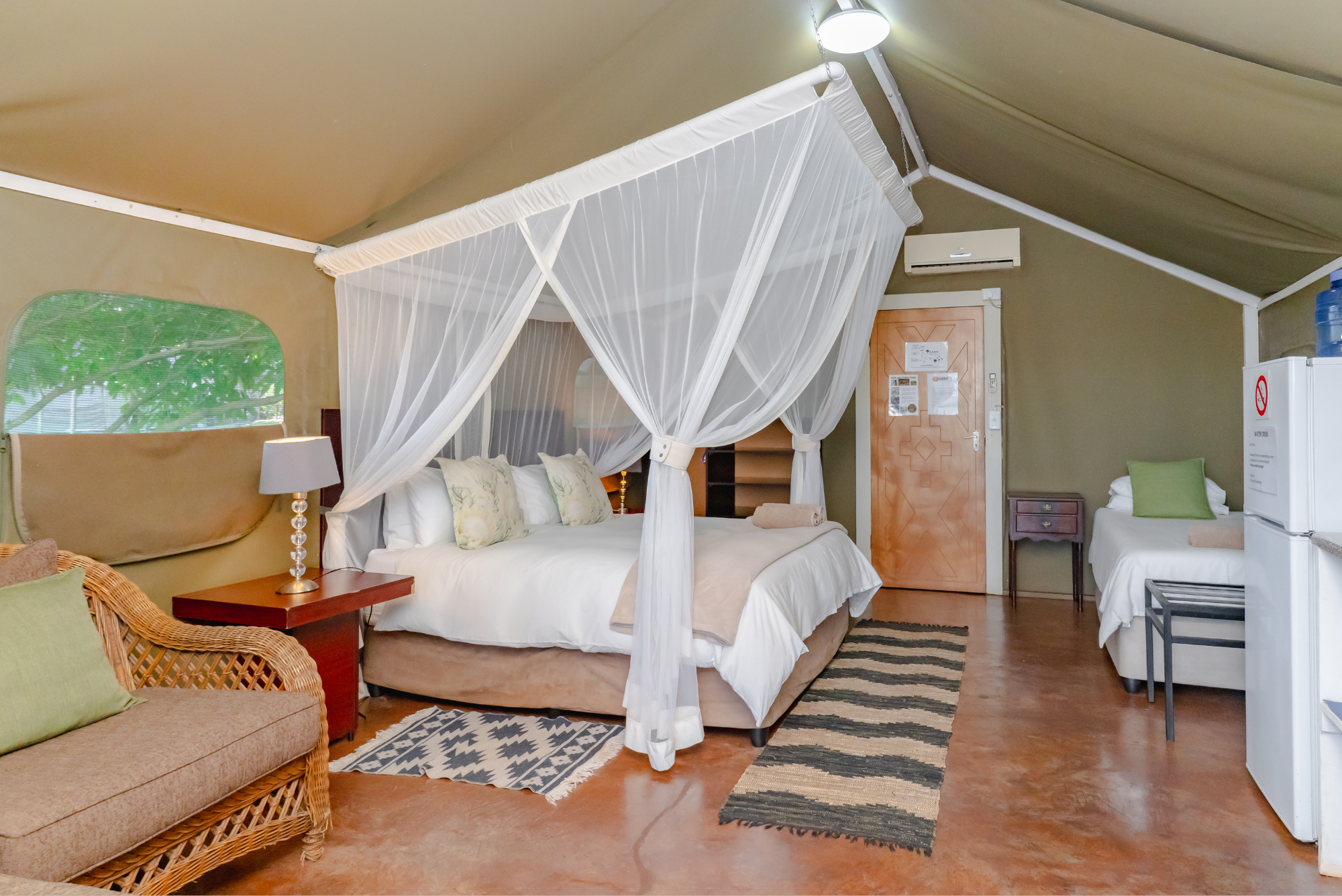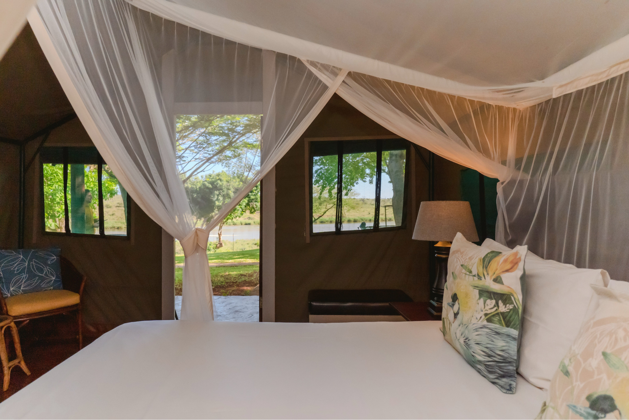 Verblyf is beskibaar in 10 tente en chalets wat geskik is vir 20 gaste. Die eenhede sluit die Luukse Rivierfront-dubbeltent met 'n privaat dek, Luukse Dubbelbedtente, en 4 Rivierfront-kamers met stoep in, net 4 m van die Krugerwildtuin se heining af. Alle kamers en eenhede het gemaklike beddens, en suite-badkamers met stort, lugversorging en koffie- en teemaakgeriewe. Van die eenhede het kombuisies.