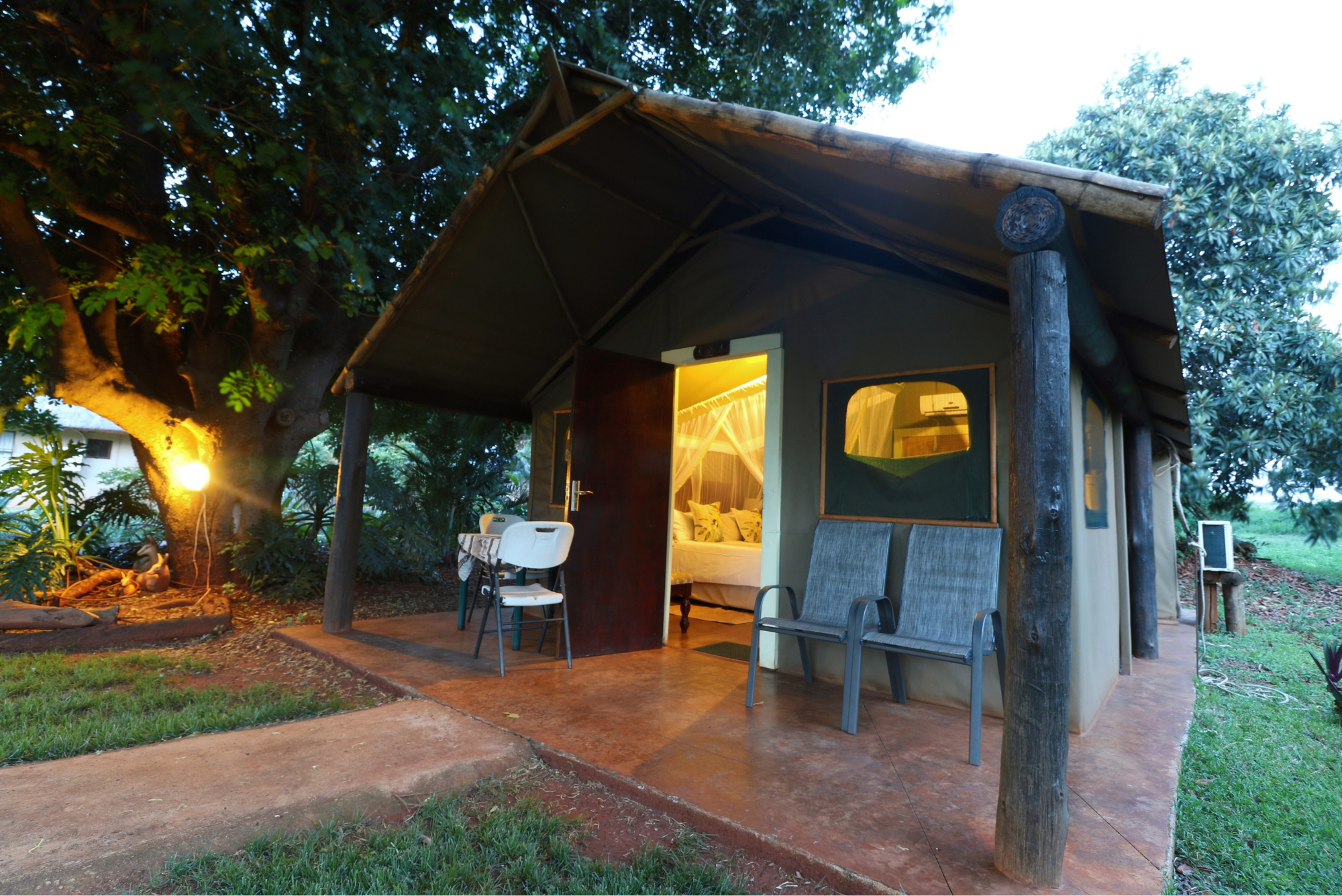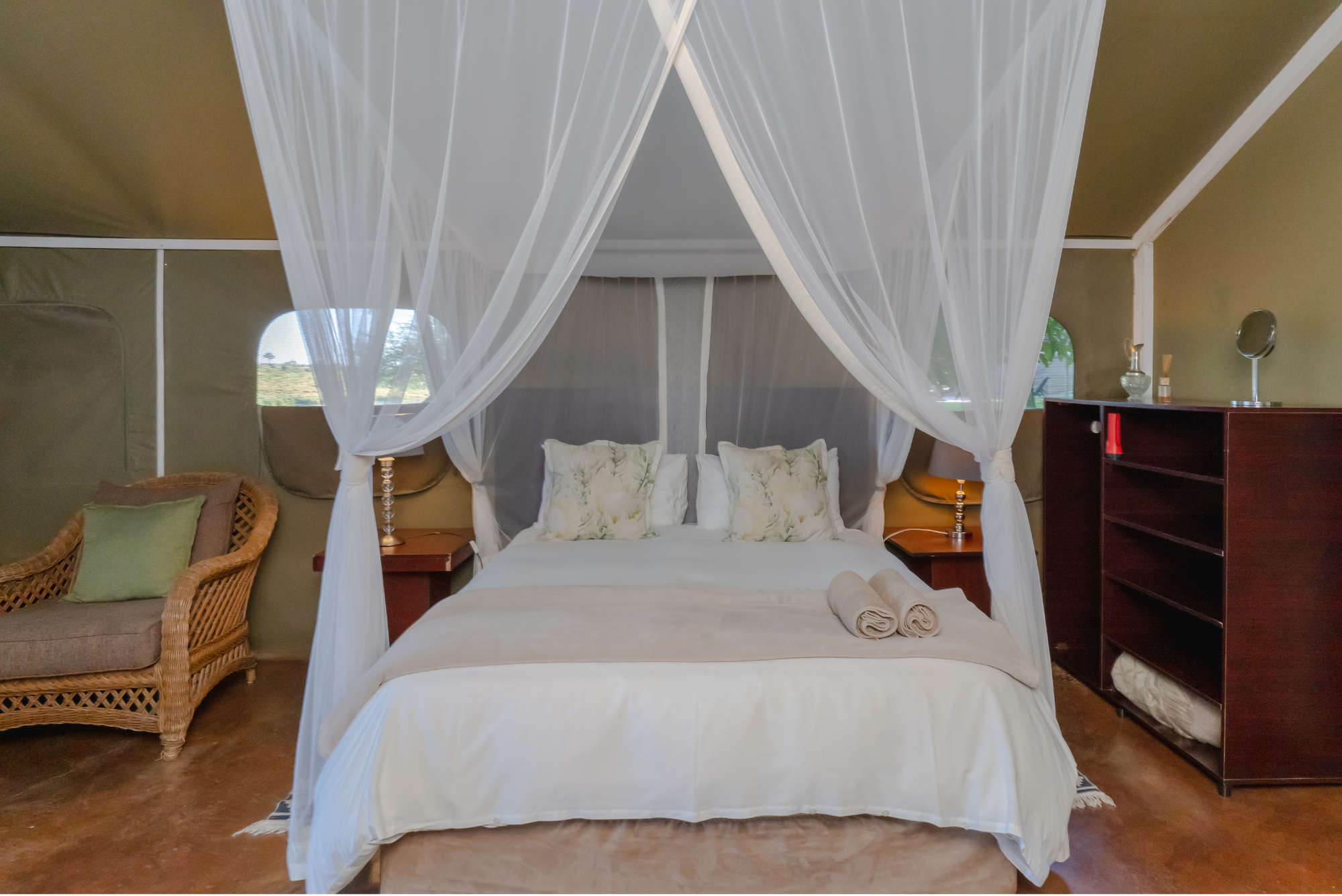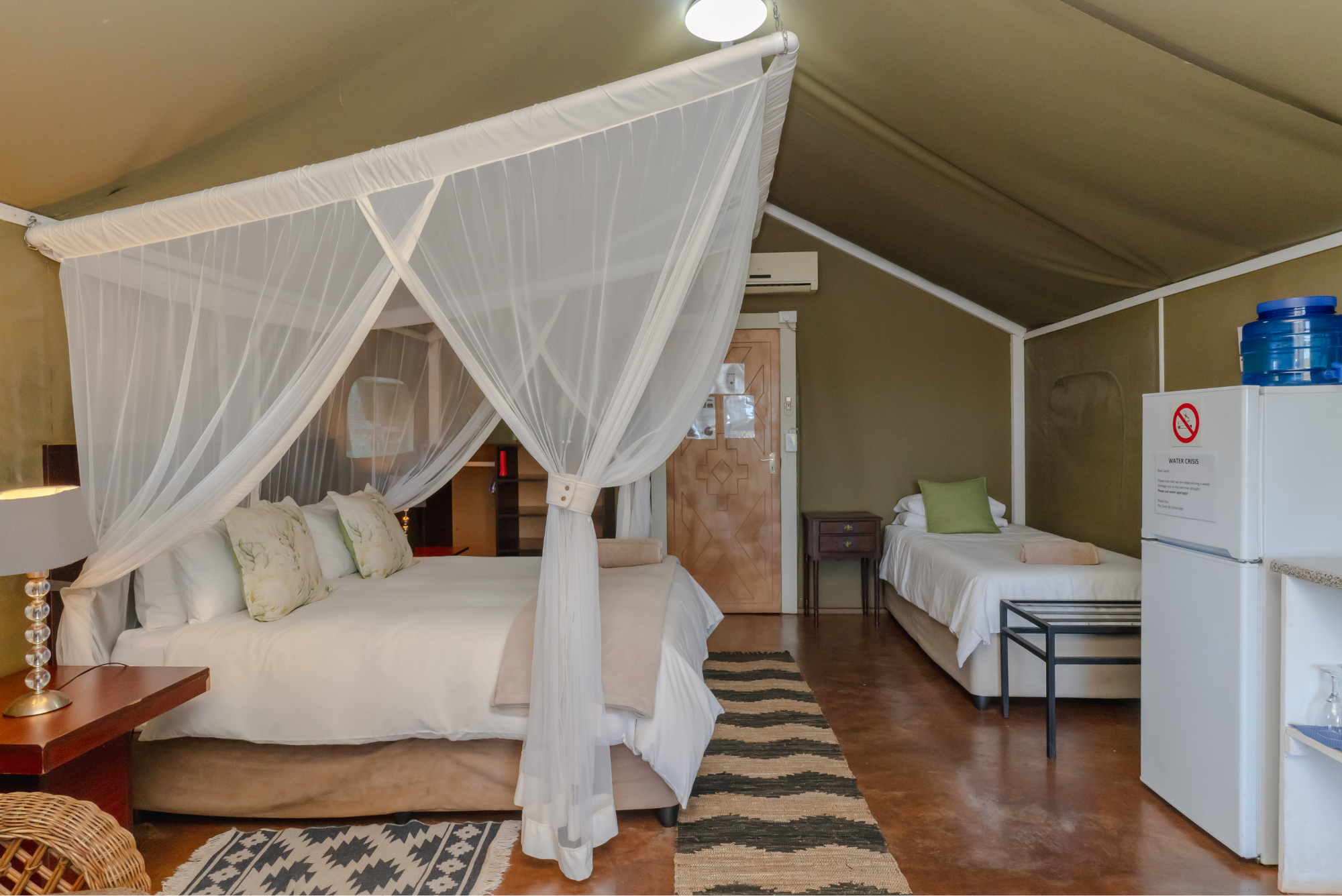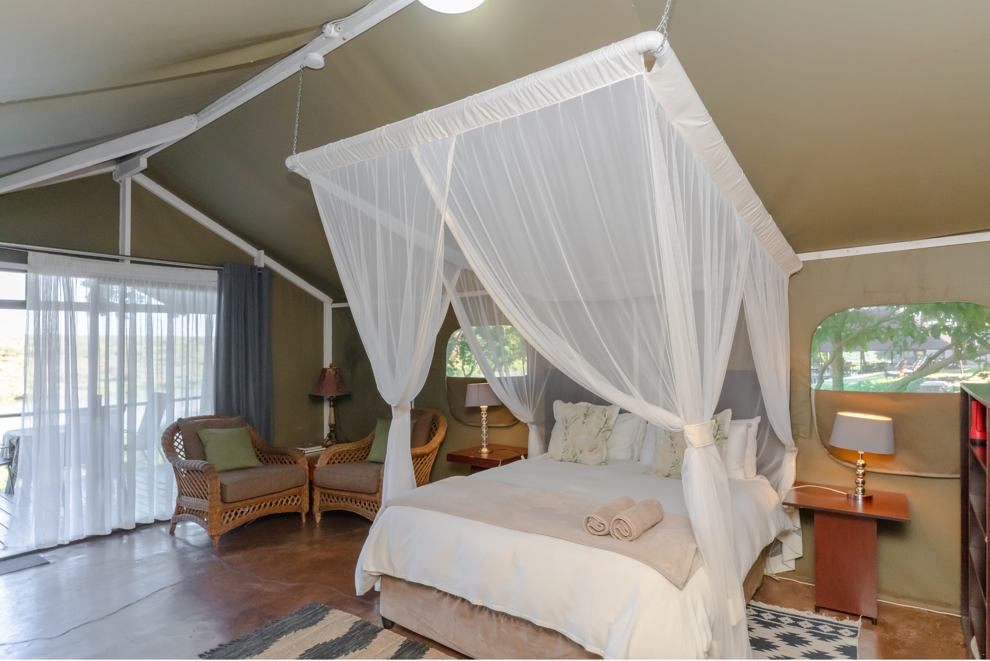 Verblyf is beskibaar in 10 tente en chalets wat geskik is vir 20 gaste. Die eenhede sluit die Luukse Rivierfront-dubbeltent met 'n privaat dek, Luukse Dubbelbedtente, en 4 Rivierfront-kamers met stoep in, net 4 m van die Krugerwildtuin se heining af. Alle kamers en eenhede het gemaklike beddens, en suite-badkamers met stort, lugversorging en koffie- en teemaakgeriewe. Van die eenhede het kombuisies.