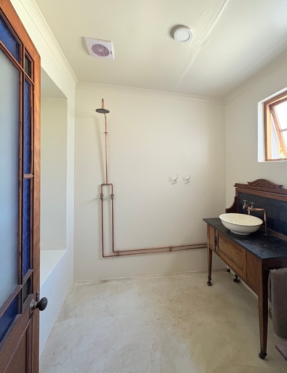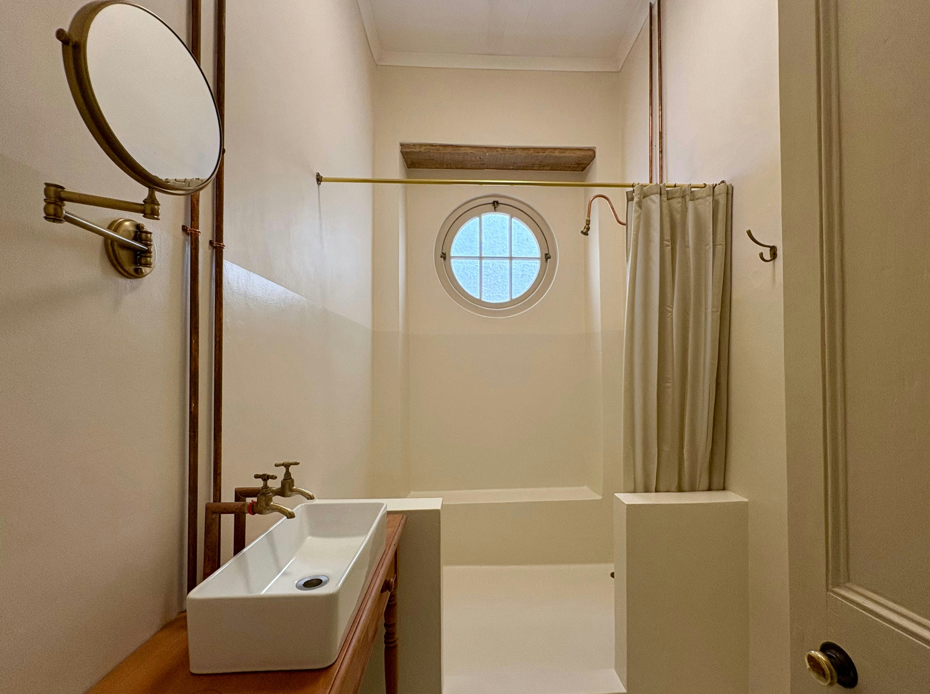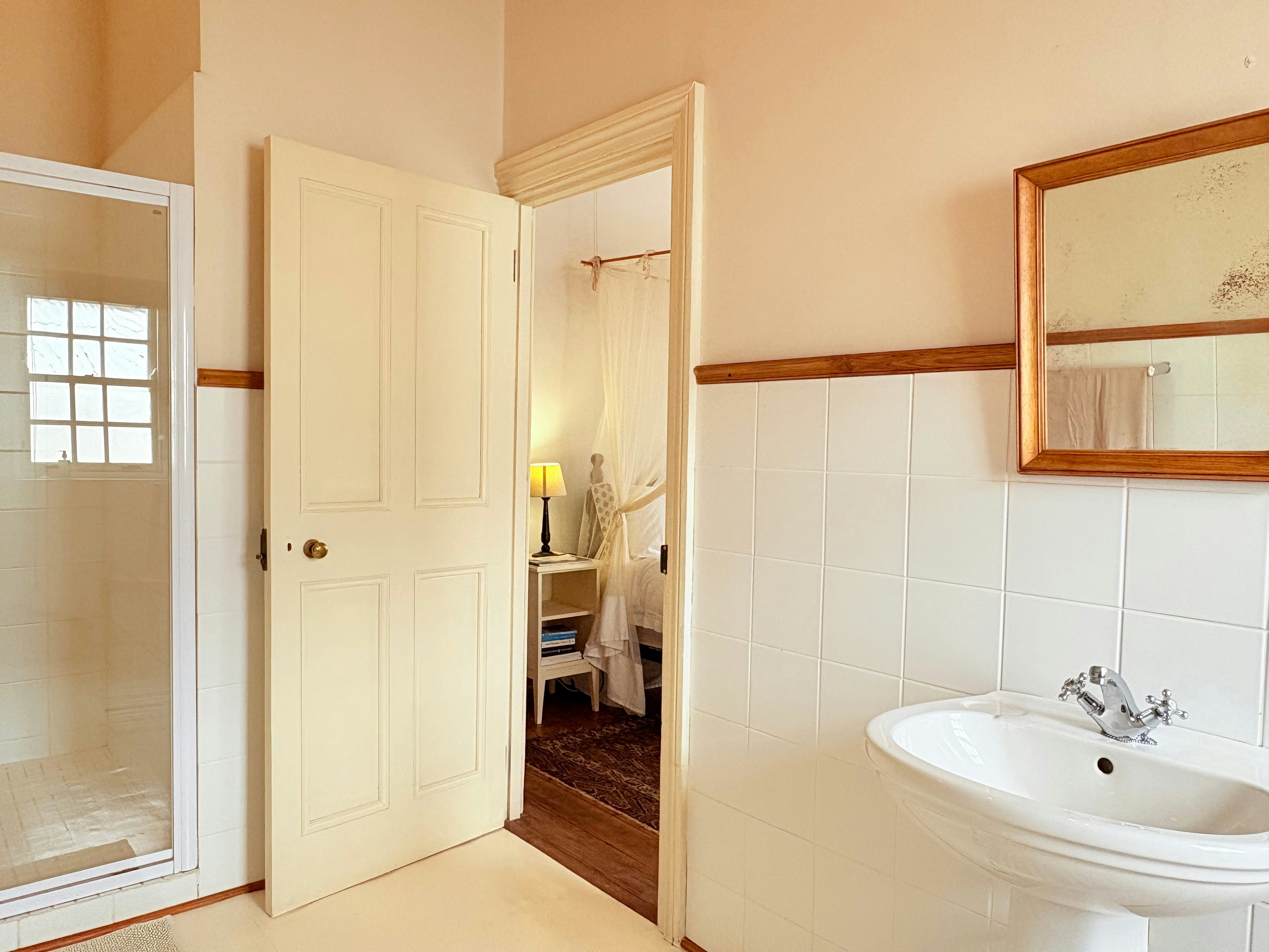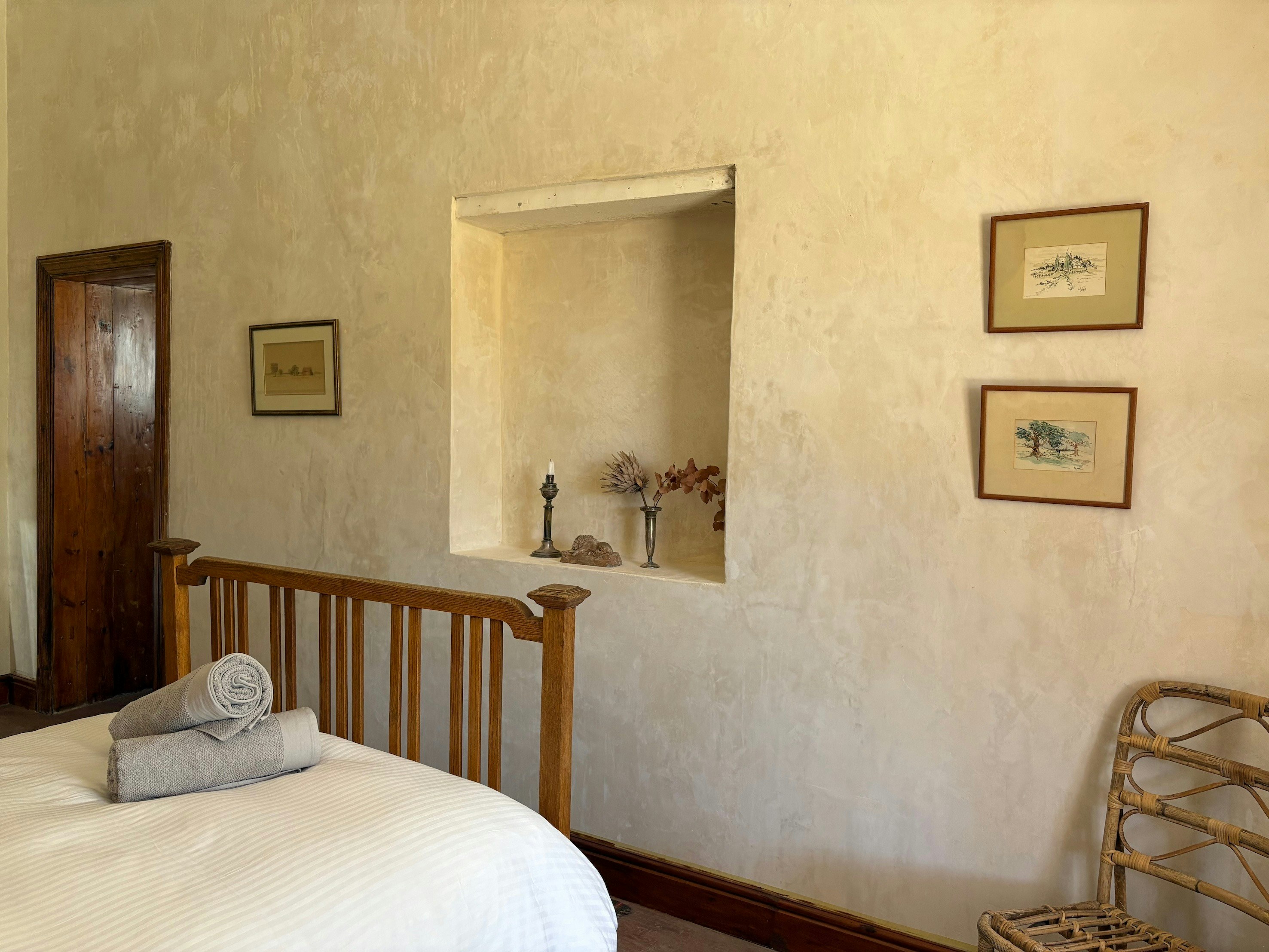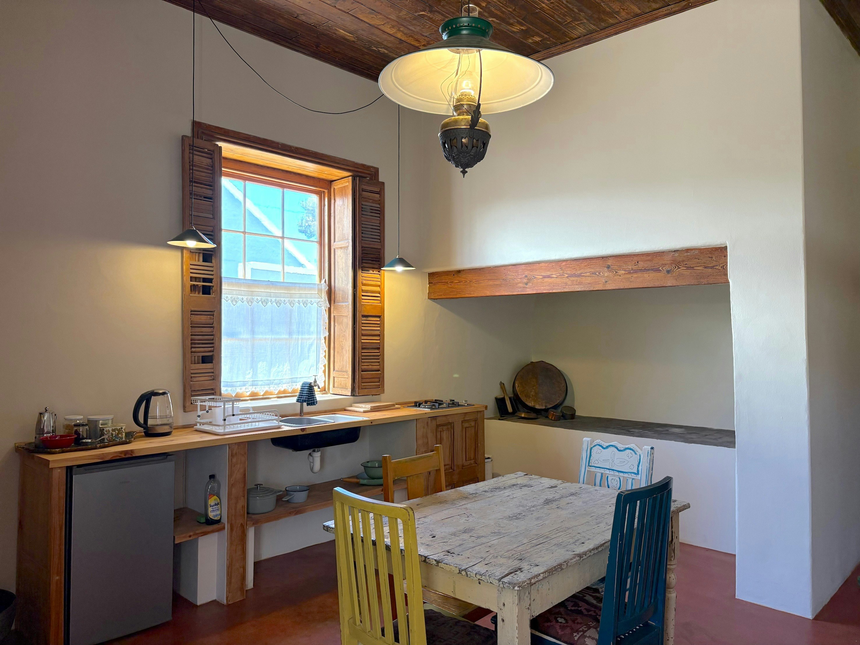 Self-catering suite comprises a bedroom furnished with a double bed and an en-suite bathroom fitted with a shower, toilet, and basin. The rustic kitchen is equipped with a 2-plate stove, bar fridge, cutlery, crockery, utensils, original hearth, kettle, and a dining table for 4 guests. The kitchen walks out onto a private patio in the garden.