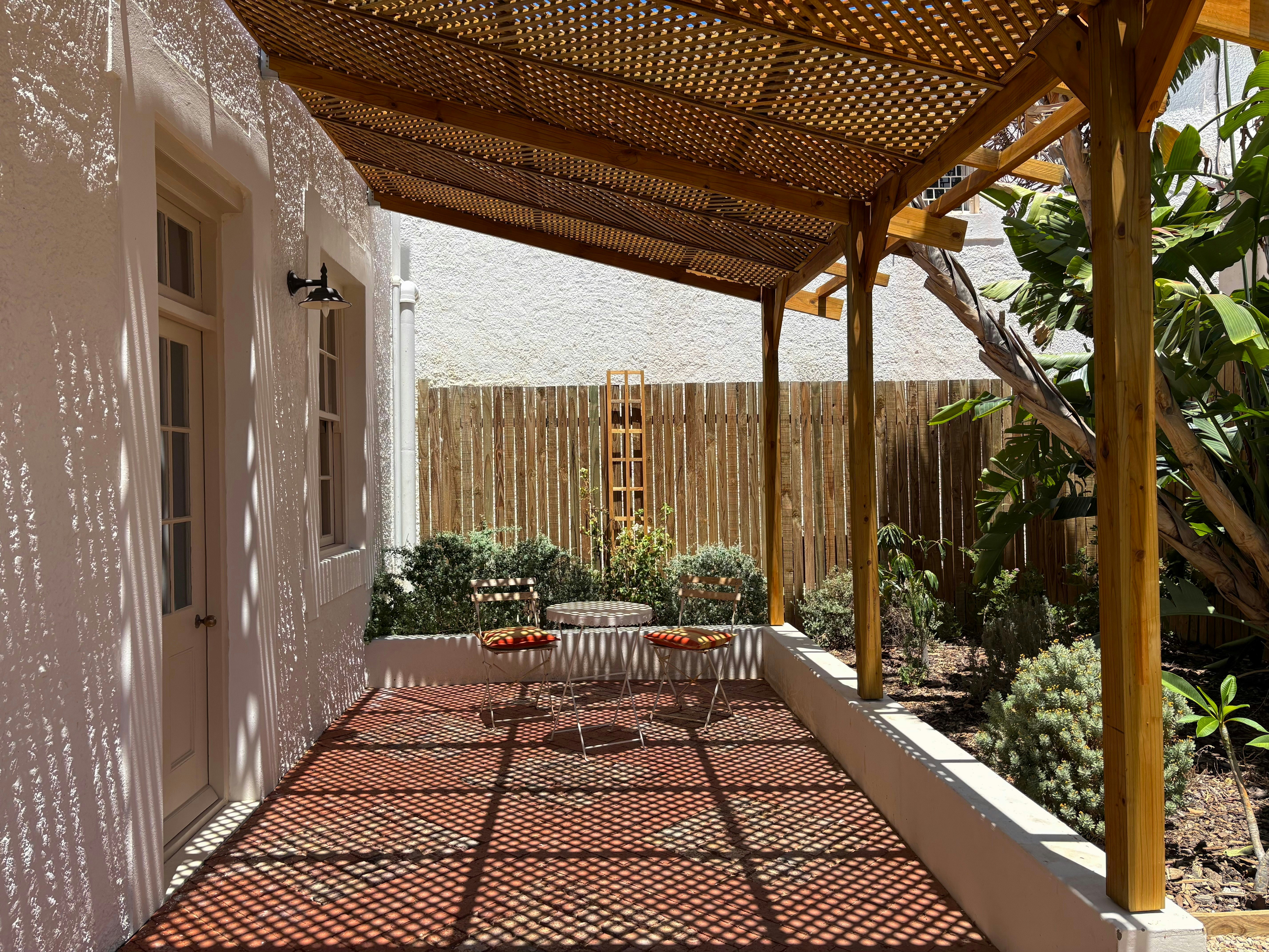 The room is furnished with a queen-sized bed and an en-suite bathroom fitted with a shower, toilet, and basin. The room opens onto a shaded pergola area, offering a relaxing space to enjoy the cool garden.
