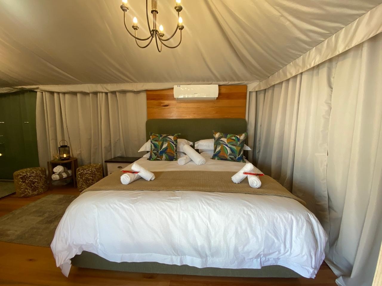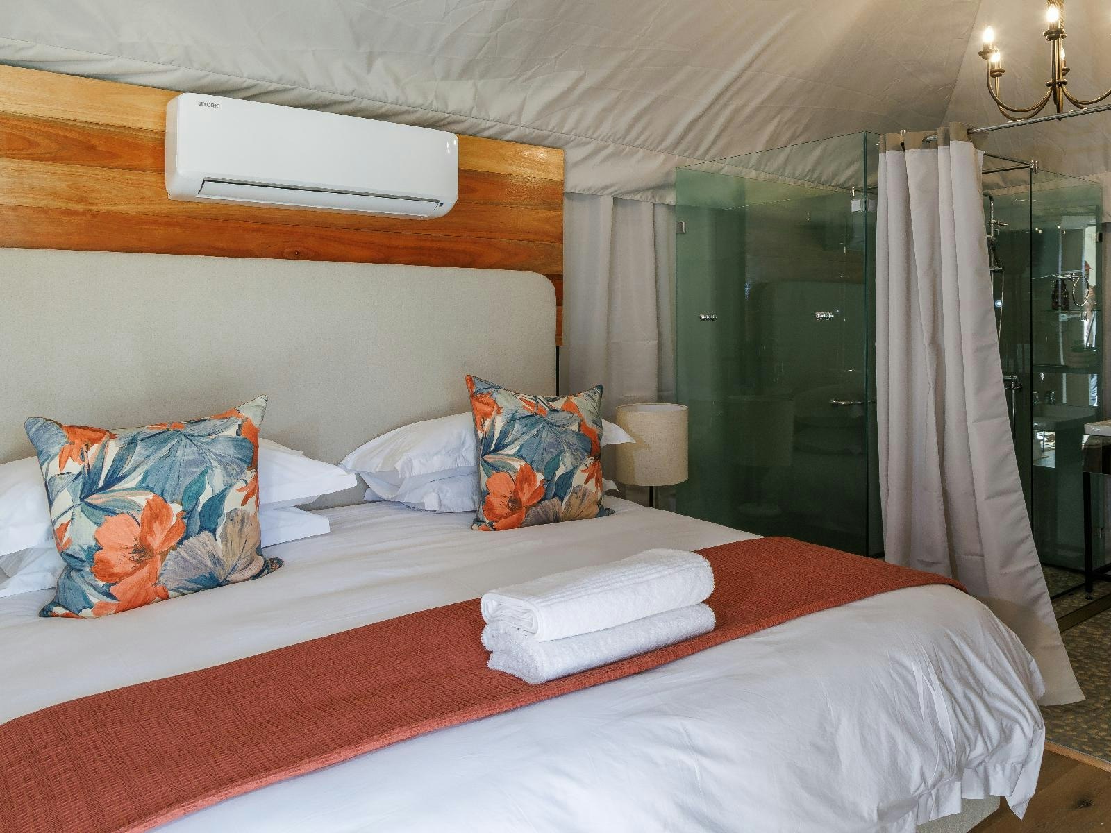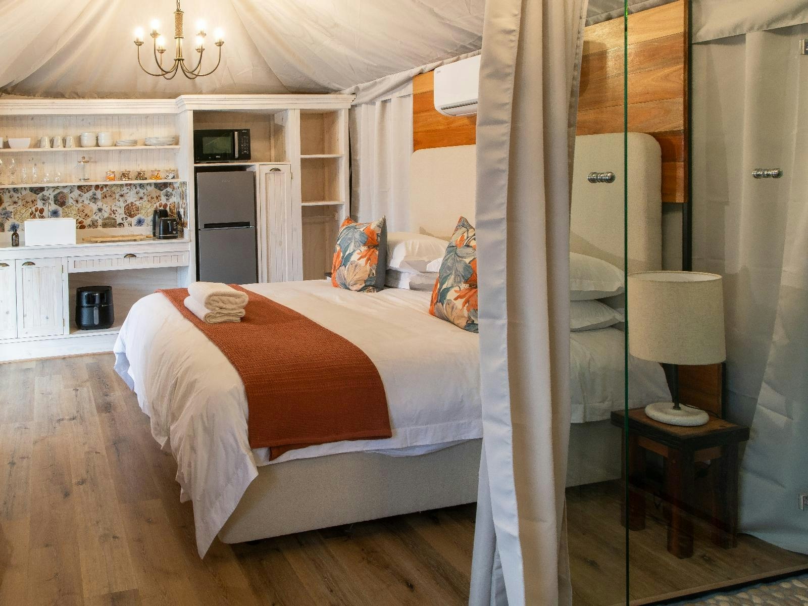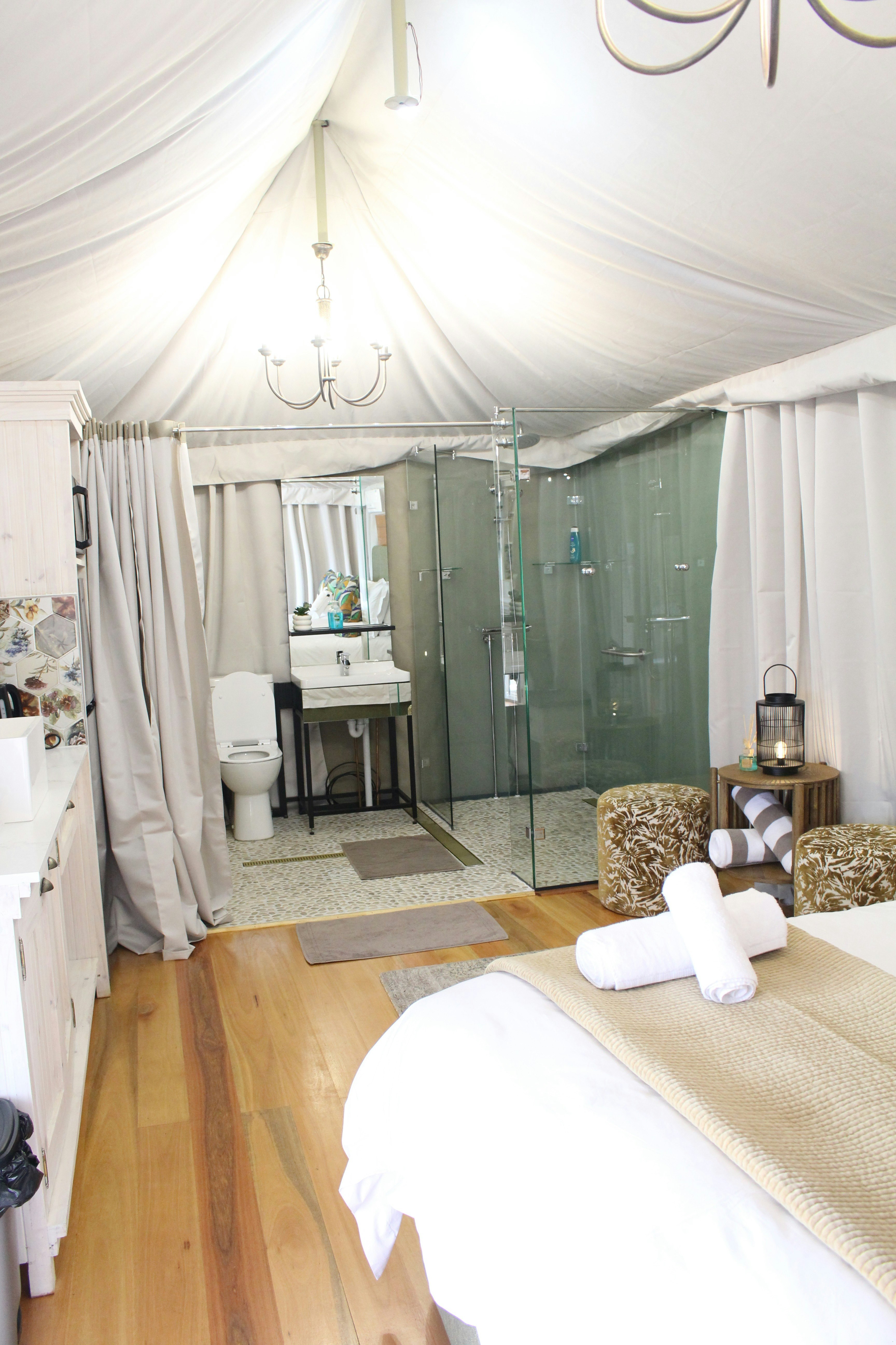 Guests also has the option of the glamping tent. It is furnished with a king-size bed and has a bathroom fitted with a shower, bath, washbasin, and toilet. The kitchenette is equipped with a fridge and microwave.