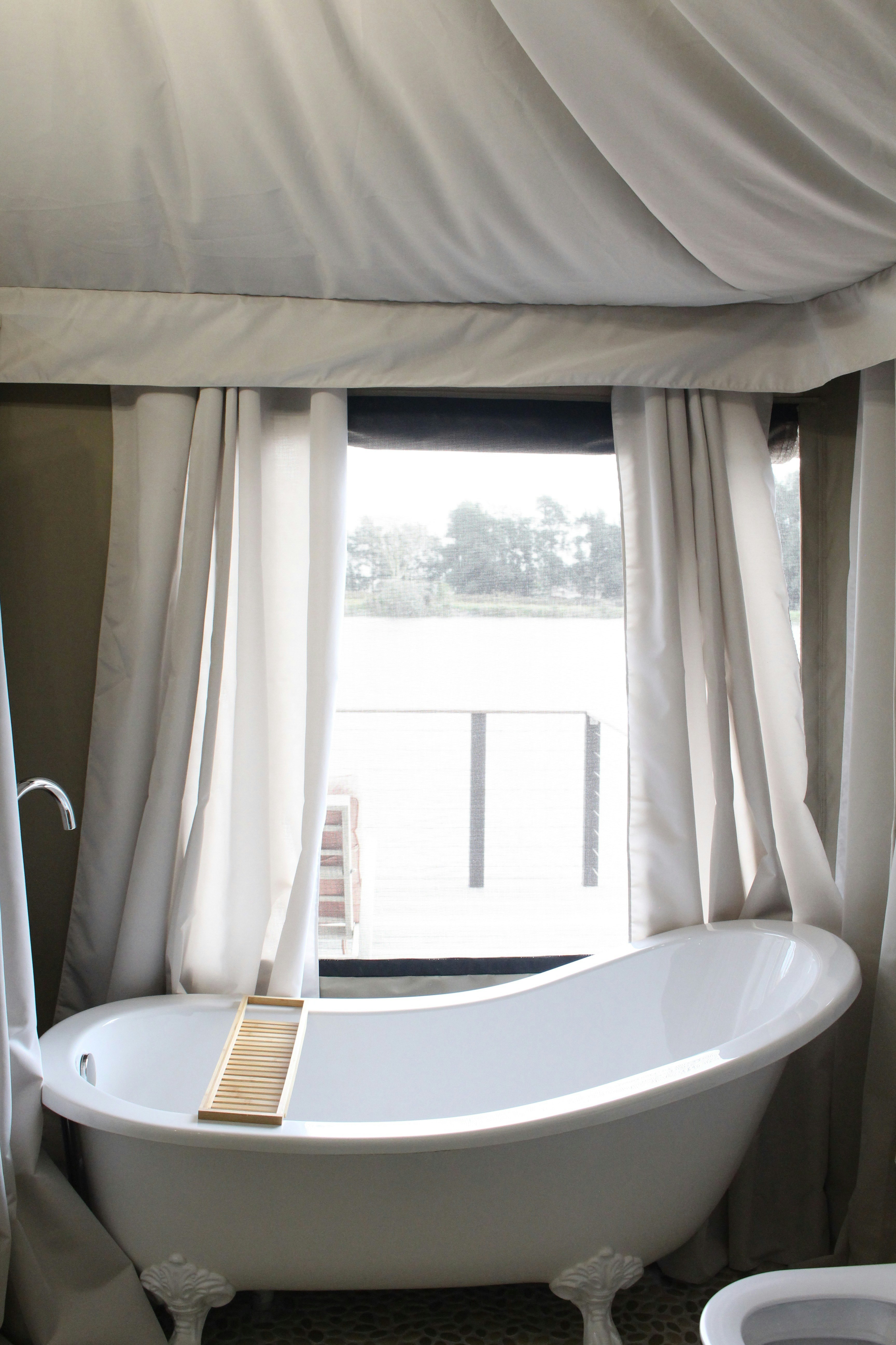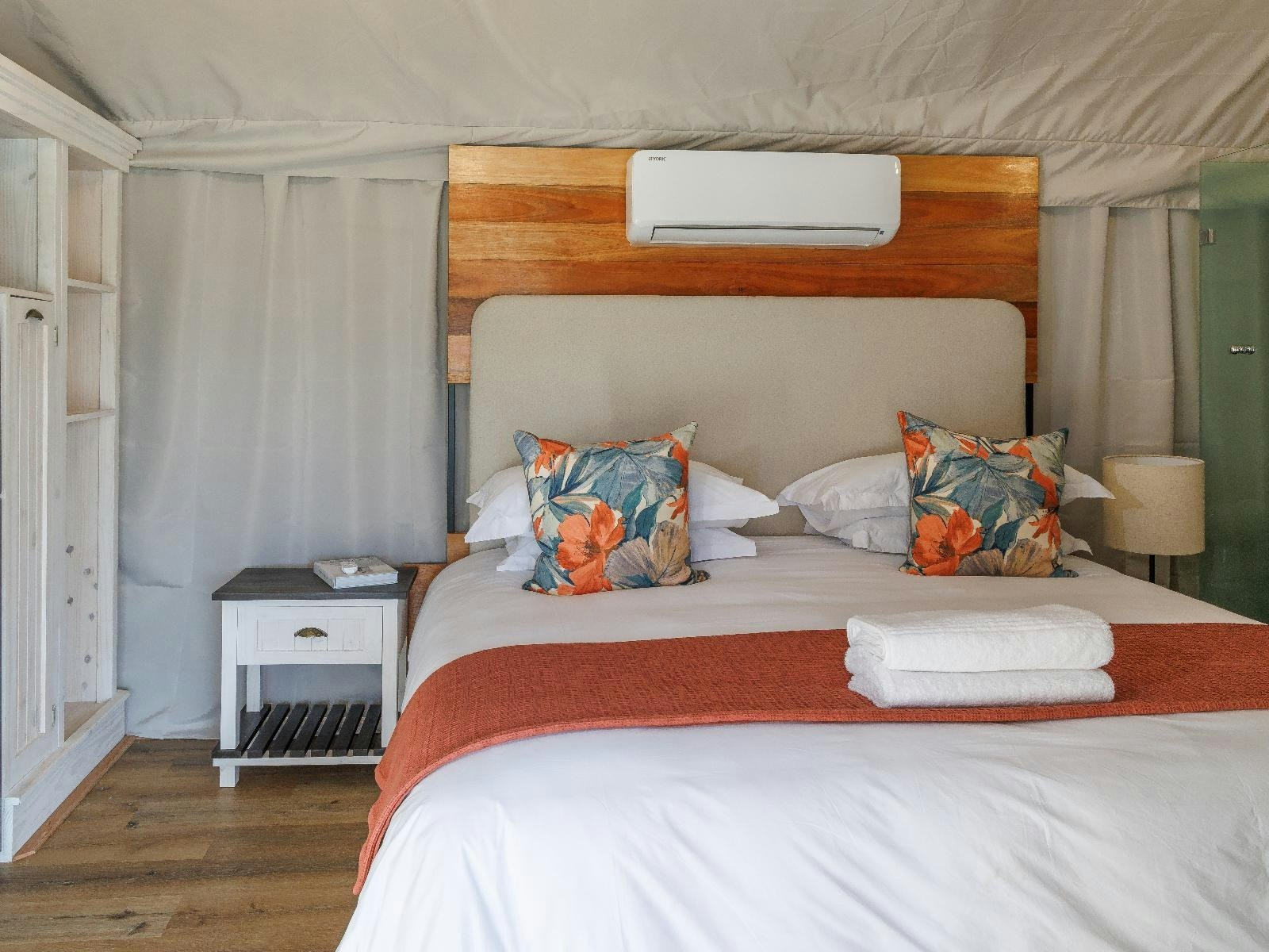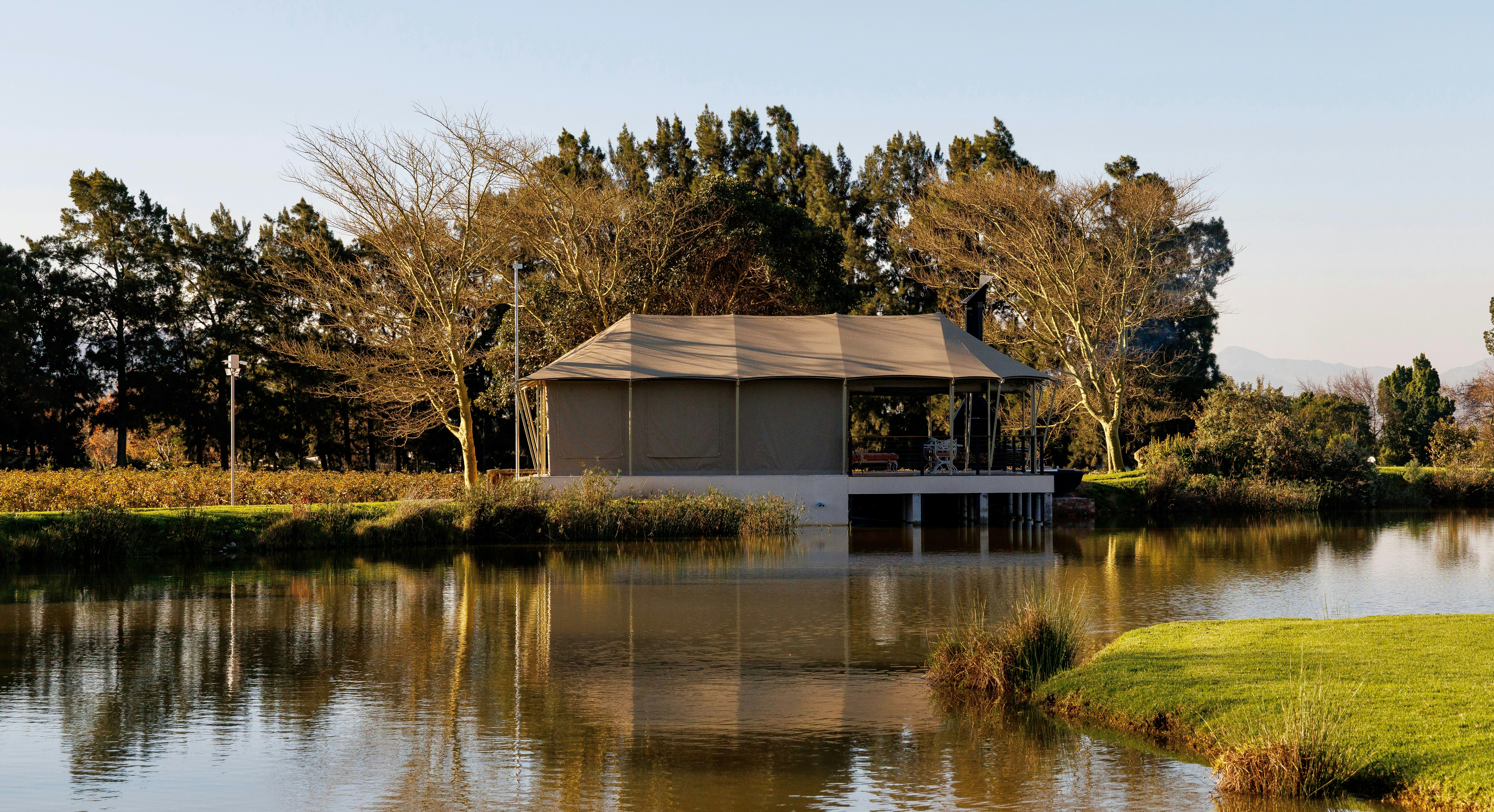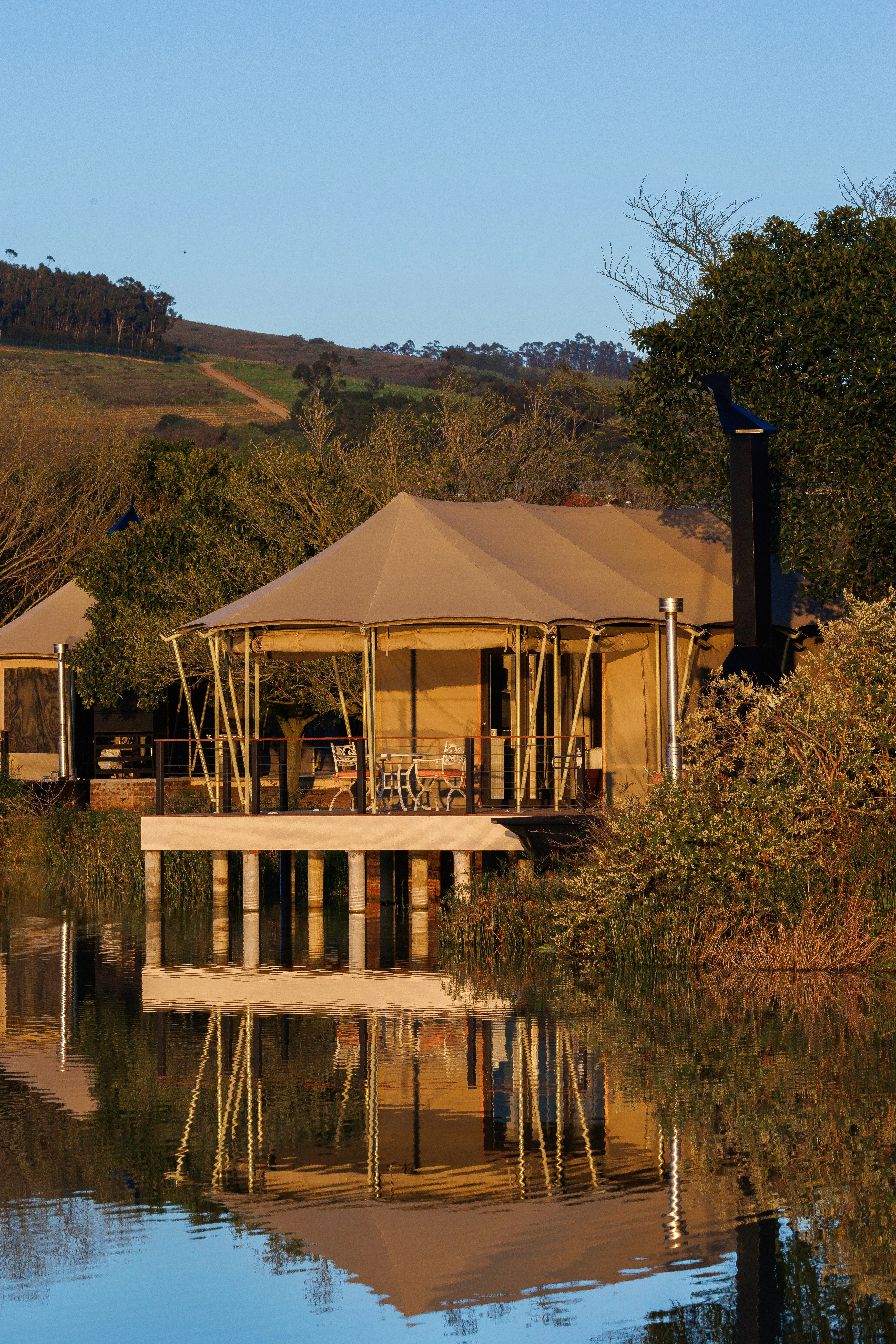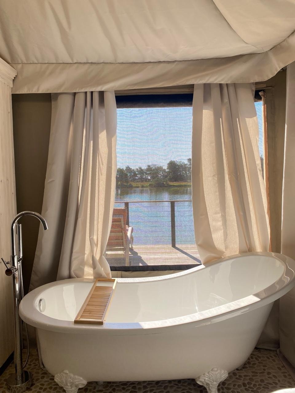 Guests also has the option of the glamping tent. It is furnished with a king-size bed and has a bathroom fitted with a shower, bath, washbasin, and toilet. The kitchenette is equipped with a fridge and microwave.