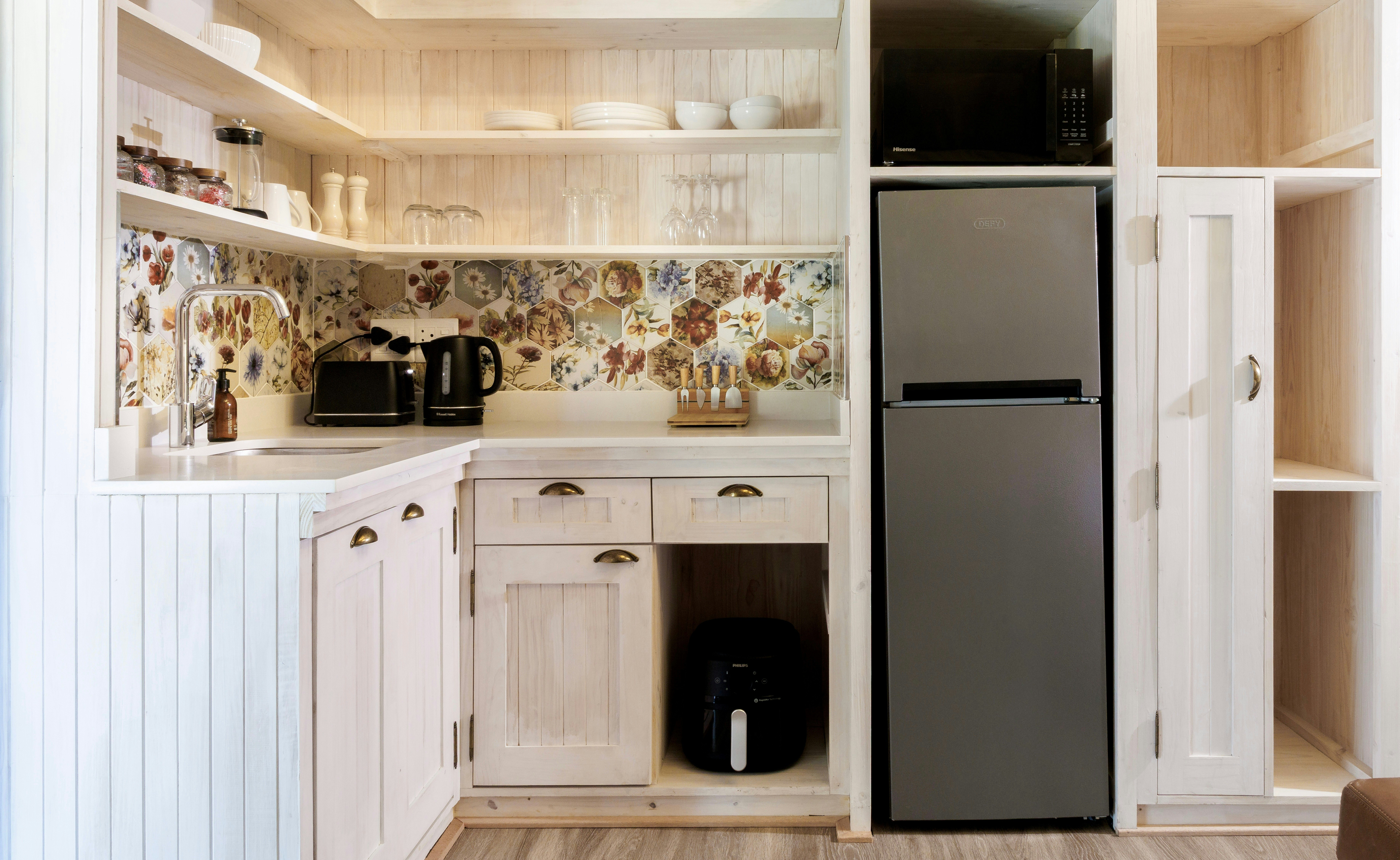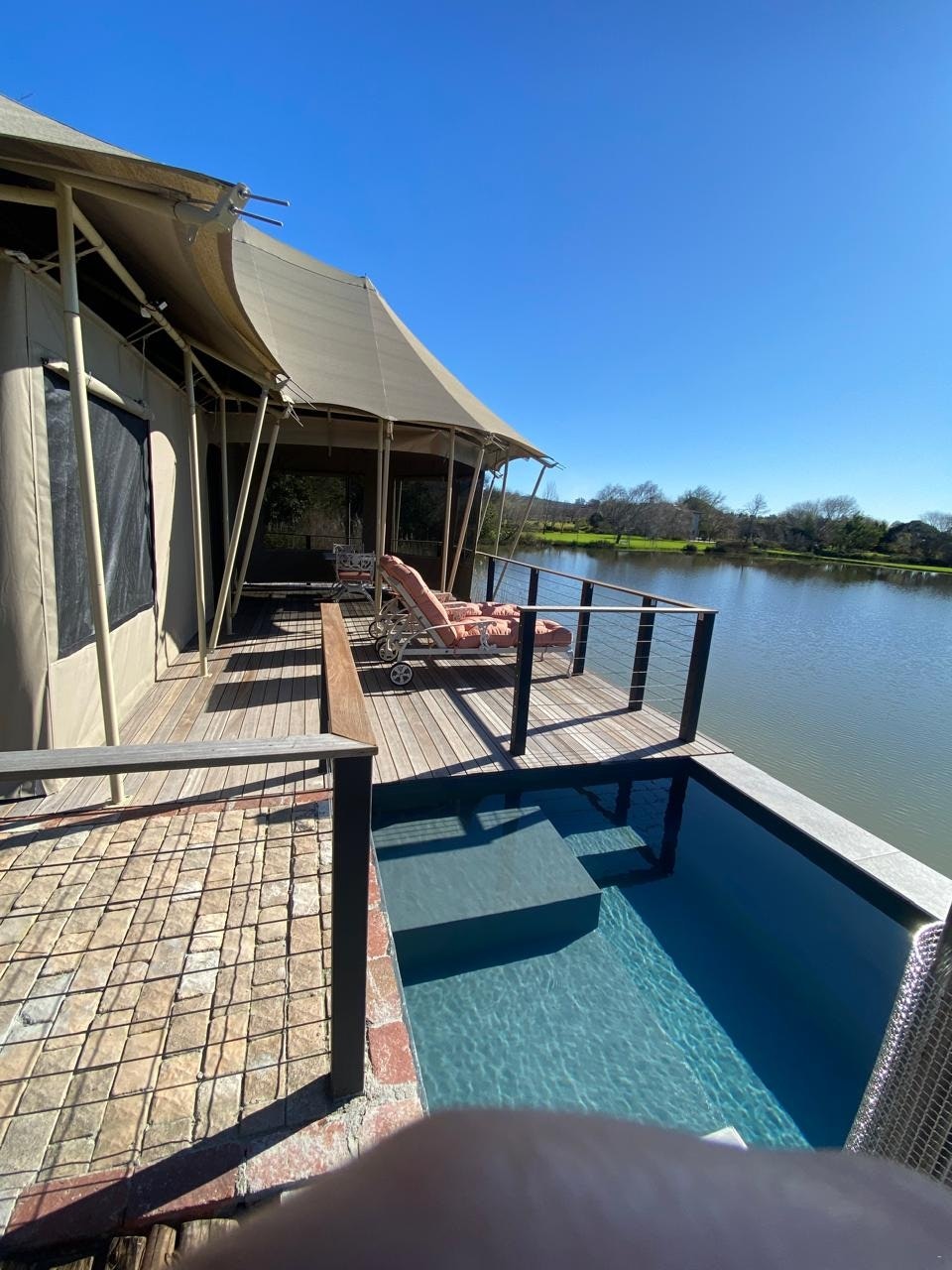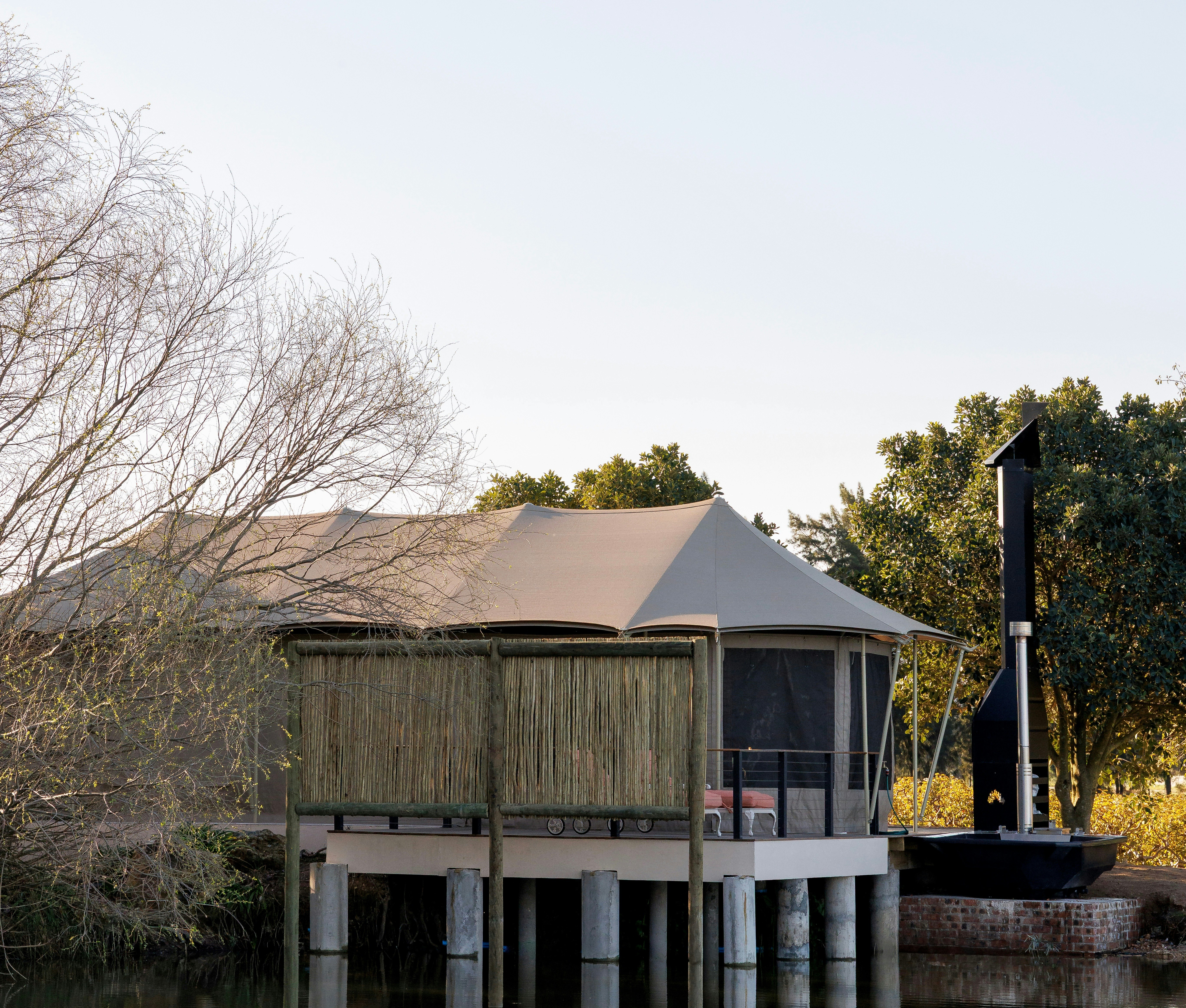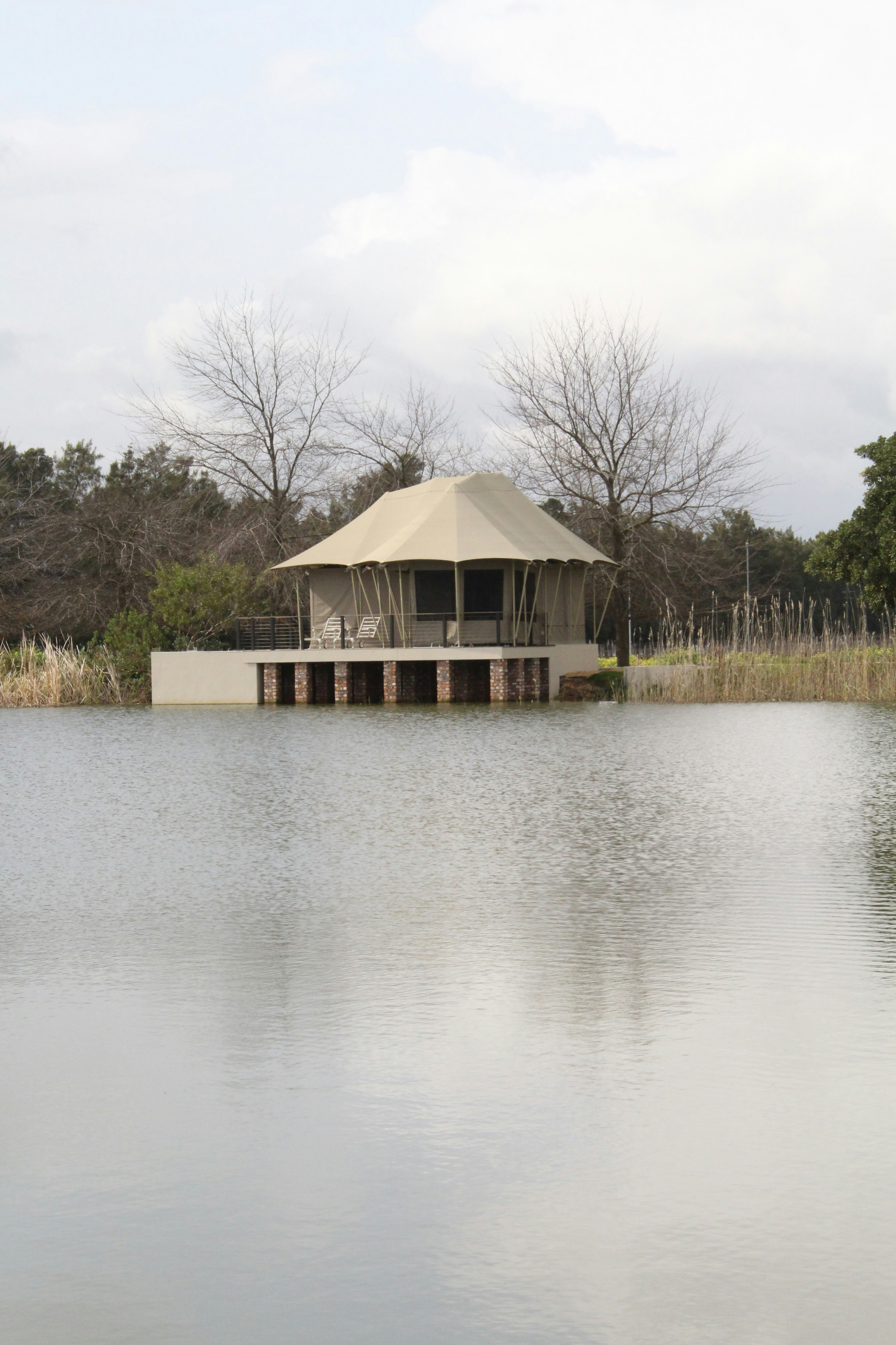 Guests also has the option of the glamping tent. It is furnished with a king-size bed and has a bathroom fitted with a shower, bath, washbasin, and toilet. The kitchenette is equipped with a fridge and microwave.
