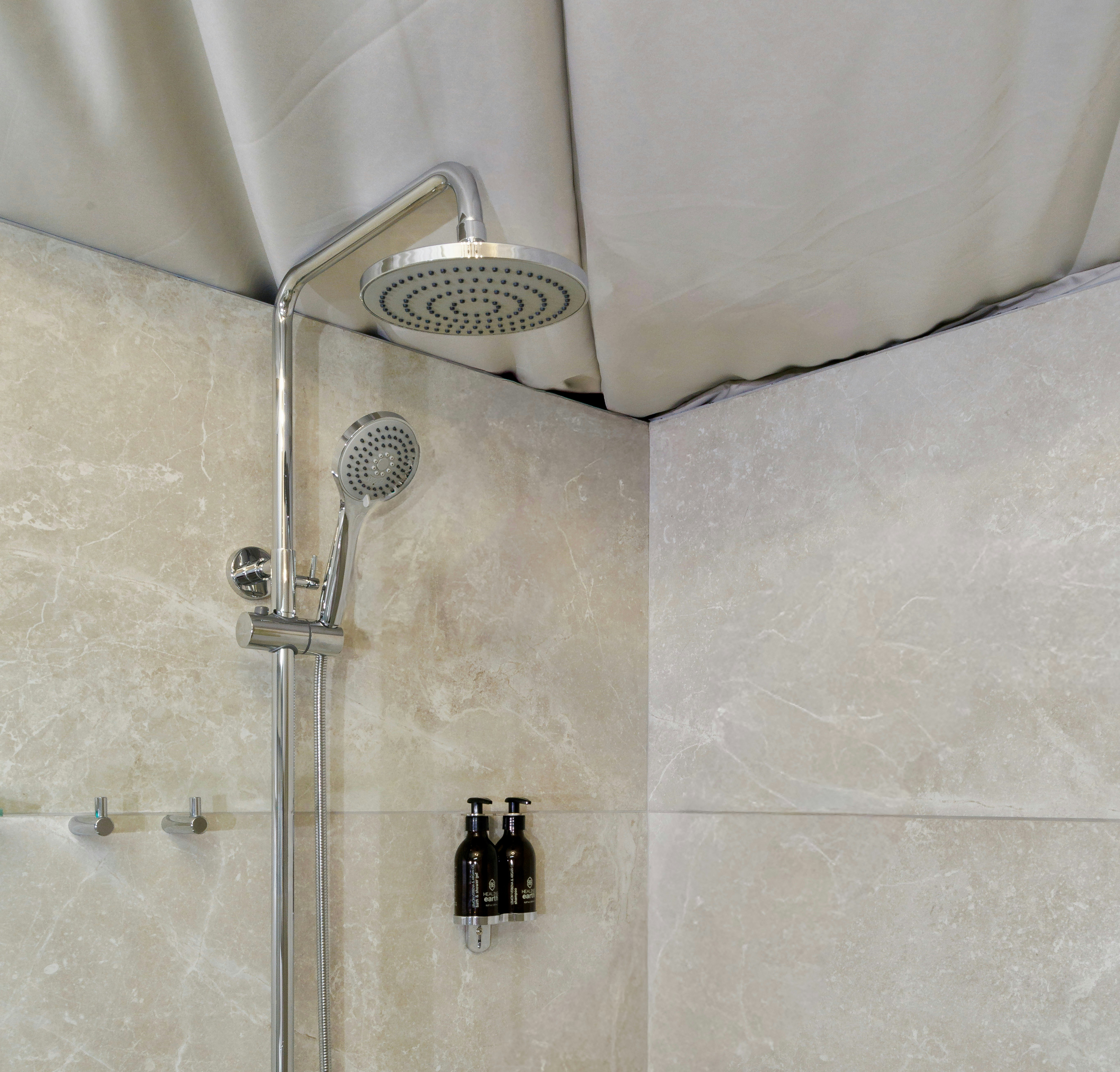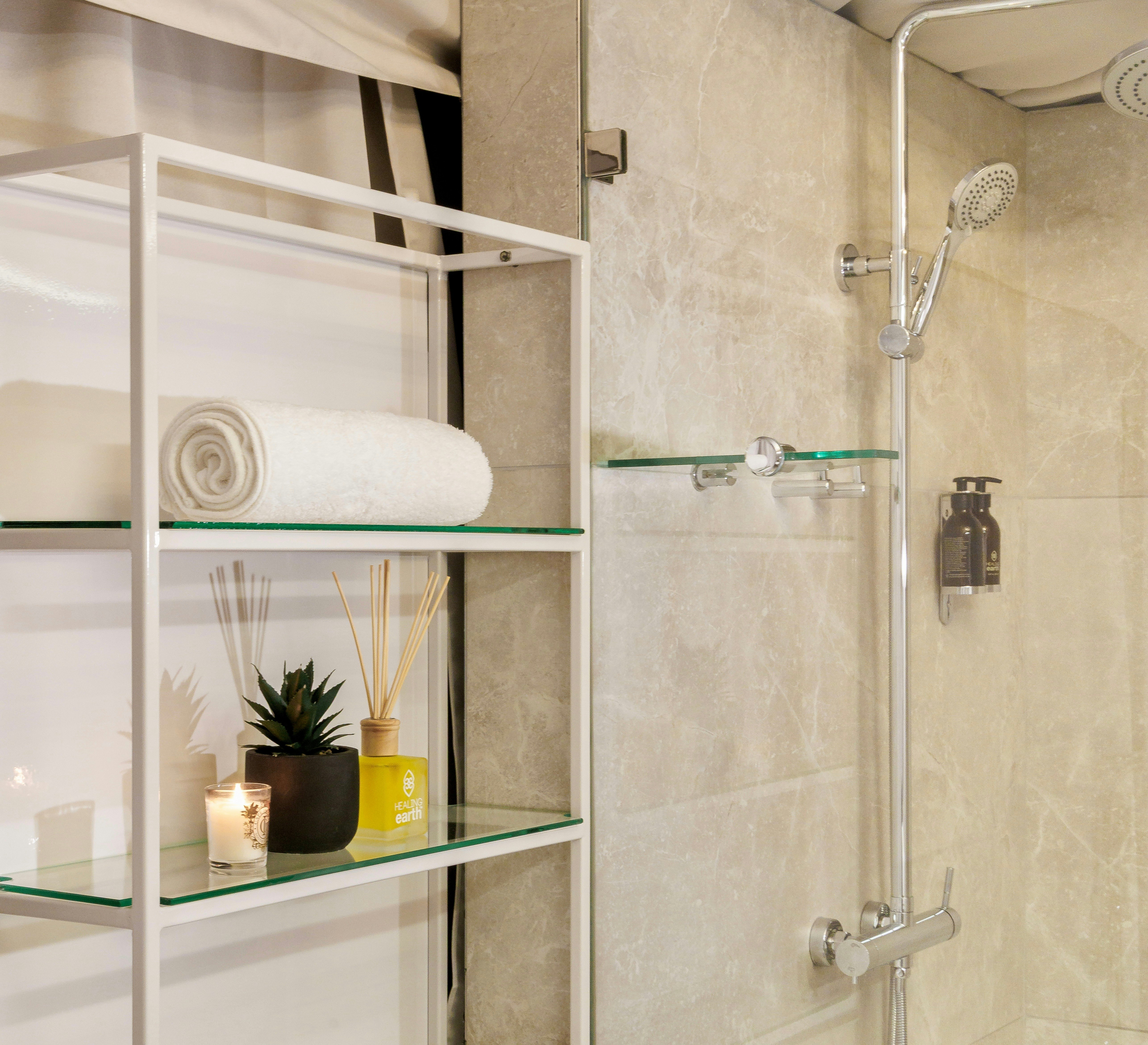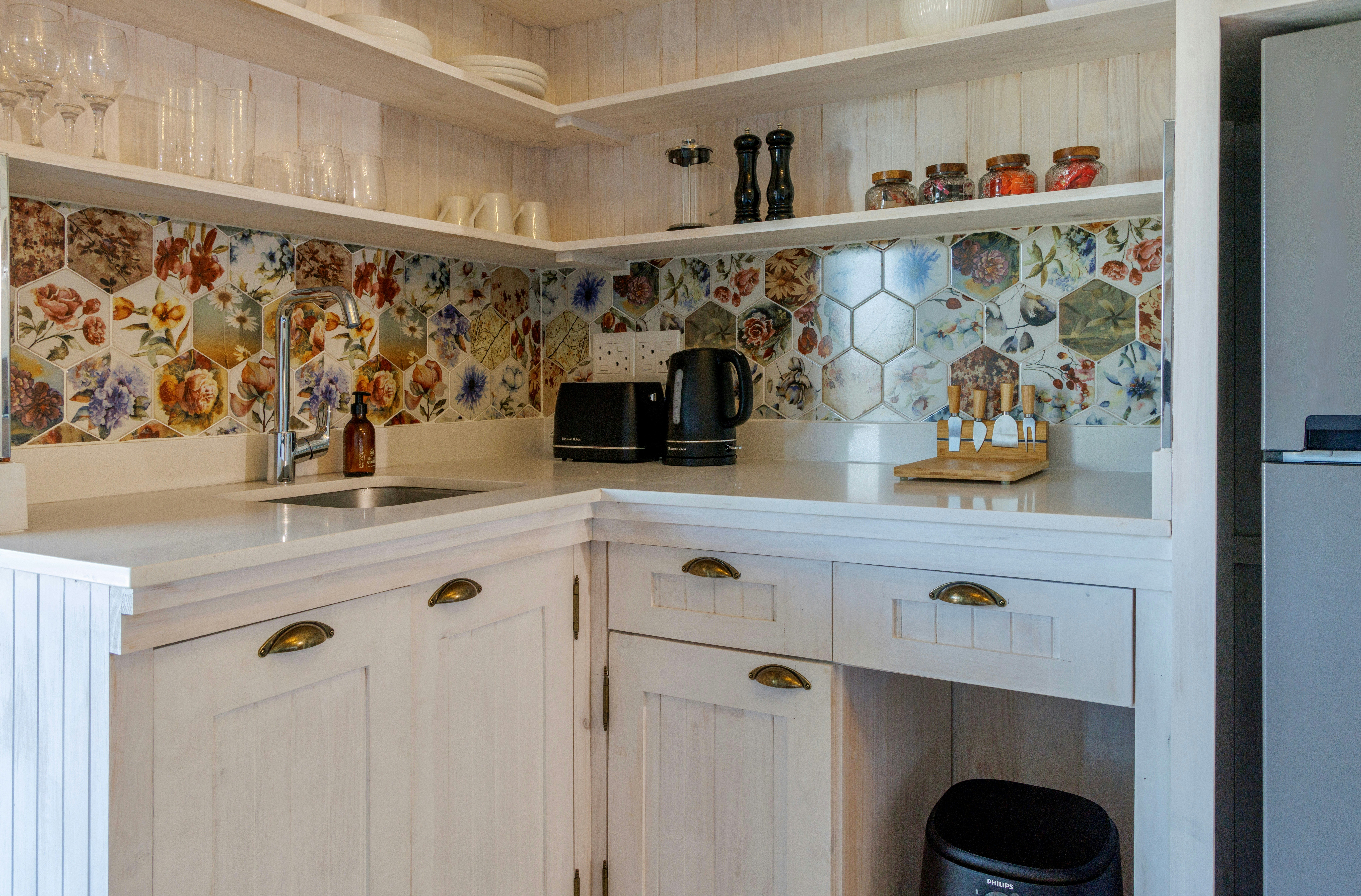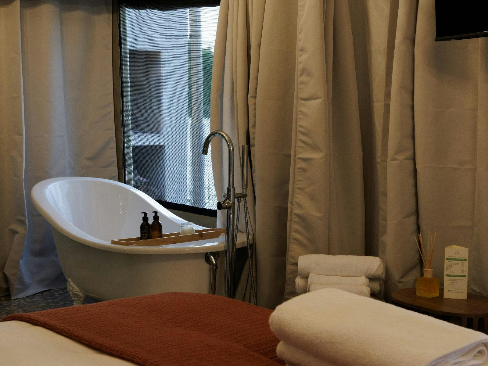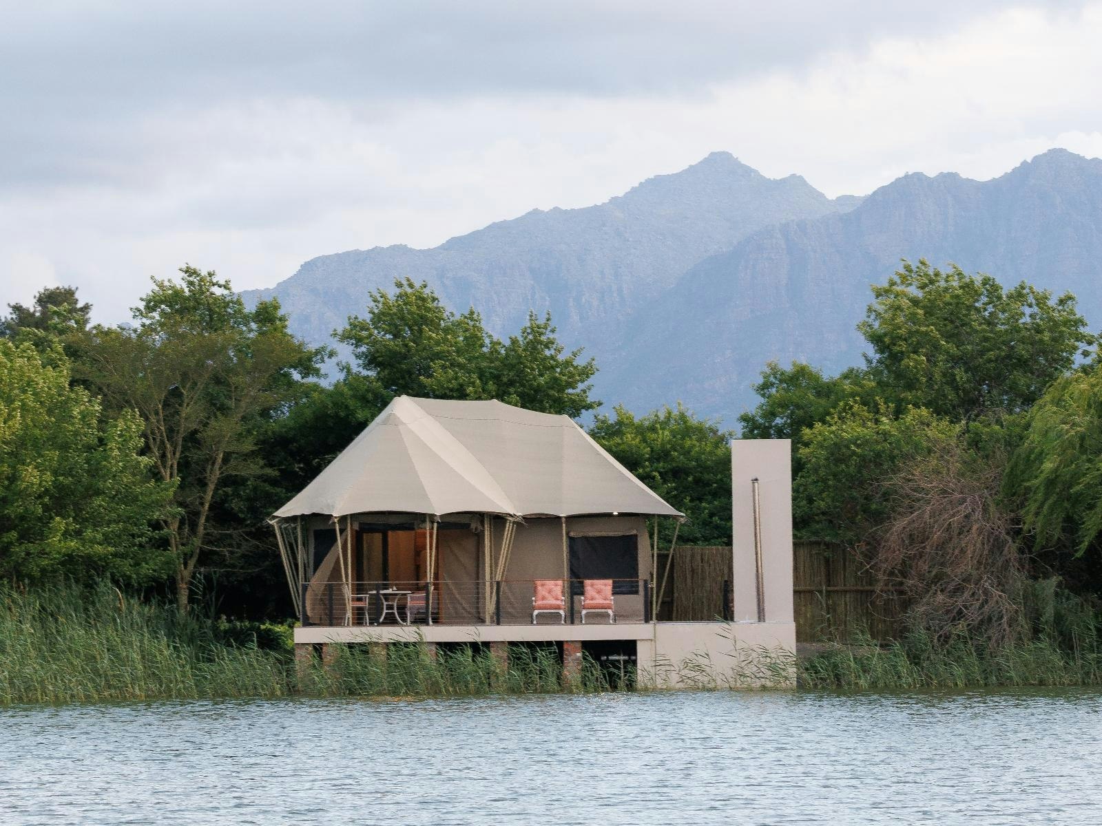 Guests also has the option of the glamping tent. It is furnished with a king-size bed and has a bathroom fitted with a shower, bath, washbasin, and toilet. The kitchenette is equipped with a fridge and microwave.