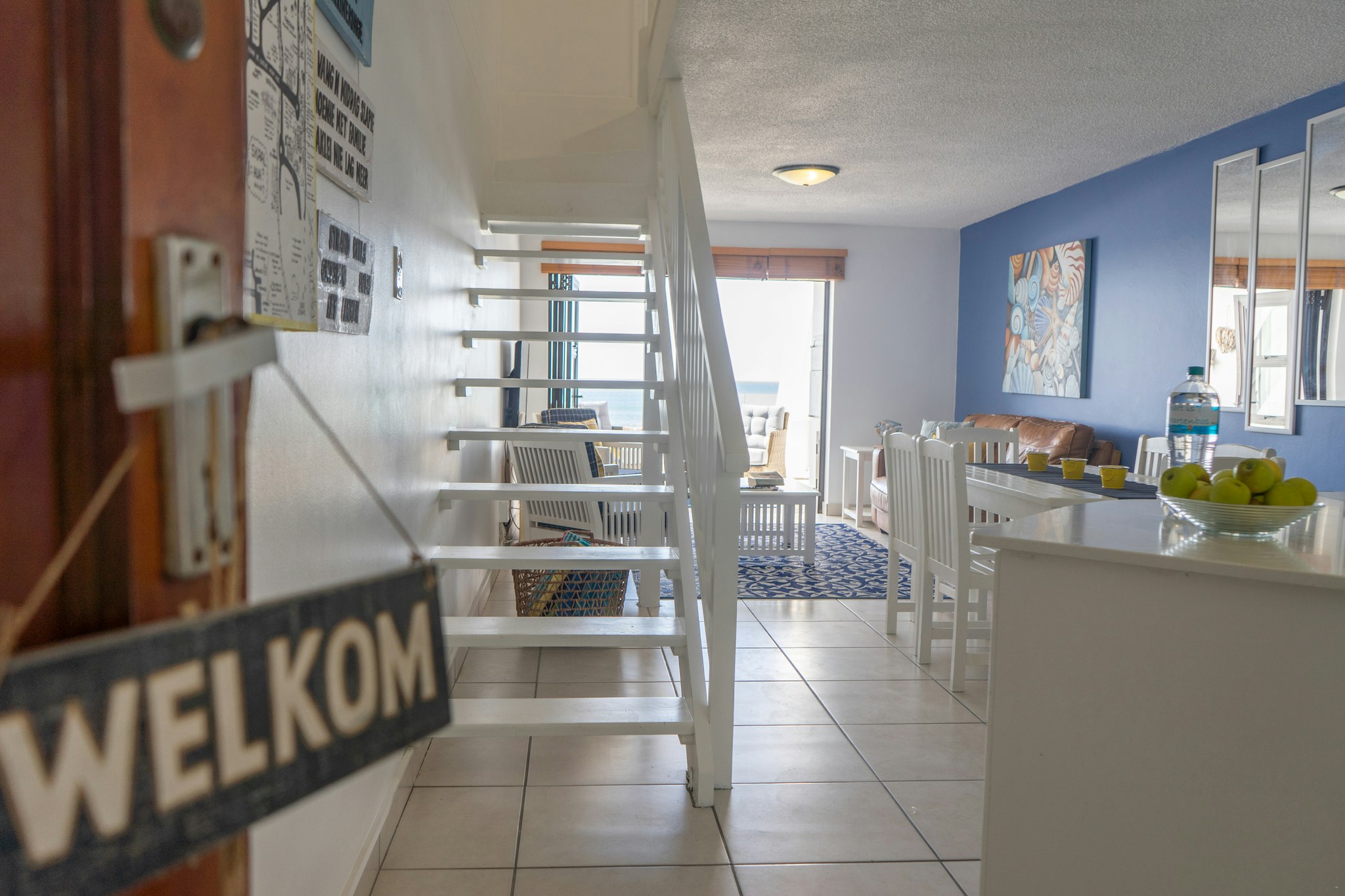 The open-plan kitchen on the lower level is equipped with a gas stove and oven, microwave, fridge-freezer, tea and coffee facilities, Nespresso machine, and dining table. The living area has a TV; guests wishing to watch DStv must bring their own decoder, smart card, and remote. Glass doors lead to a covered balcony with a built-in braai and 180° sea views, where guests may see dolphins, seals, and occasionally whales. The beachfront area offers children’s entertainment during school holidays.