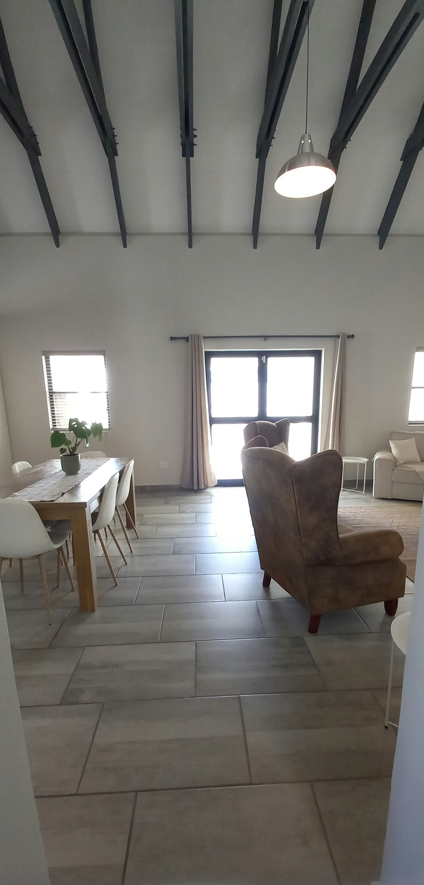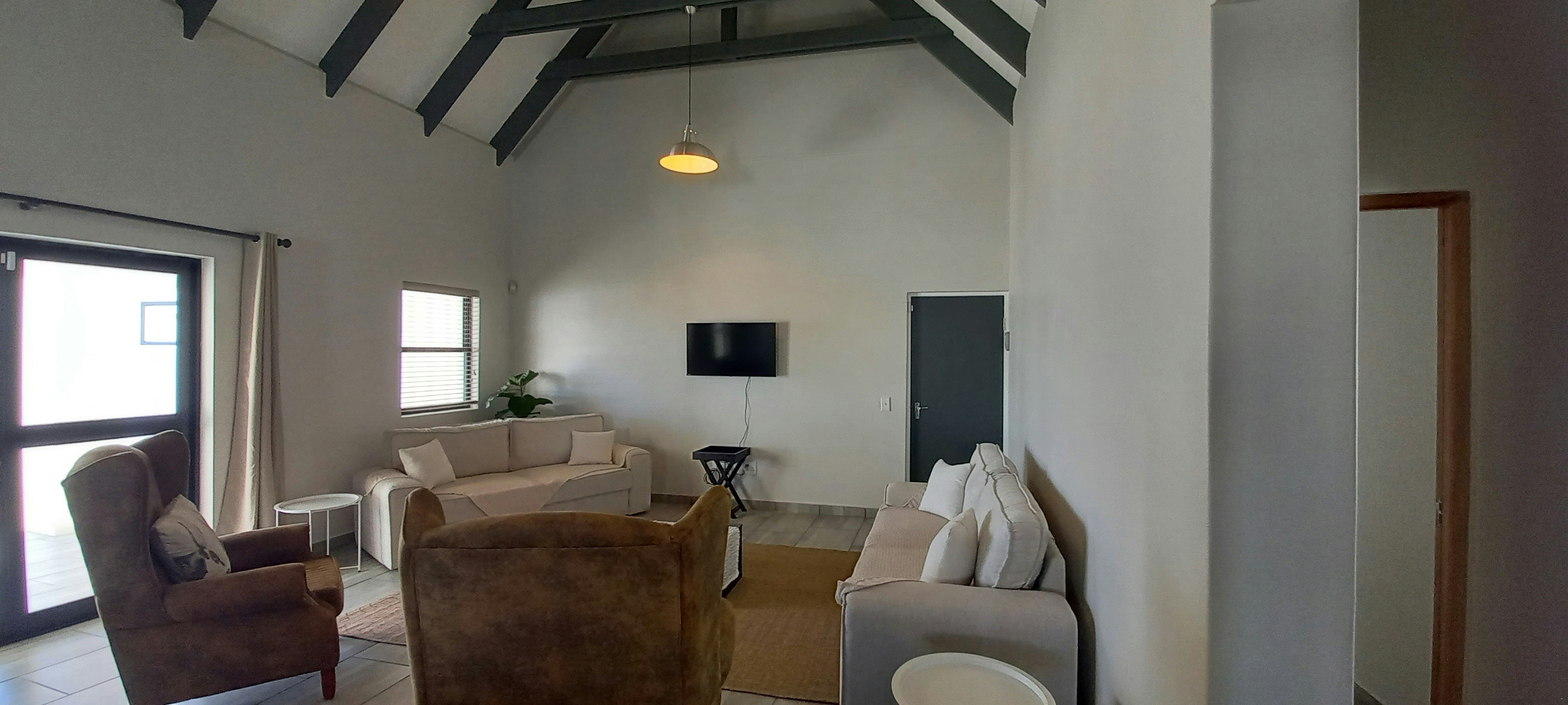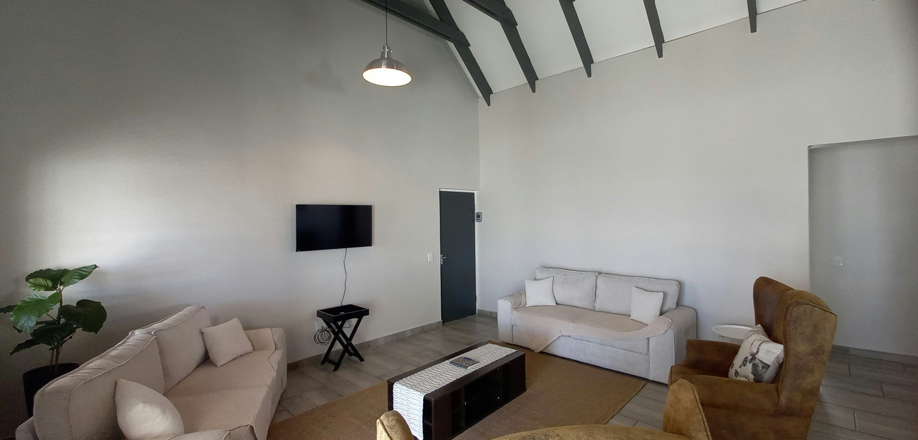 Die oopplan-leefarea is ruim en verwelkomend, met 'n volledig toegeruste kombuis met 'n stoof, oond, yskas-vrieskas, ketel, broodrooster, mikrogolfoond, wasmasjien en 'n ontbyttoonbank. Die eetarea, met sitplek vir 6, vloei naatloos in die sitkamer, wat gemaklike sitplek en 'n TV met WiFi vir vermaak bied.