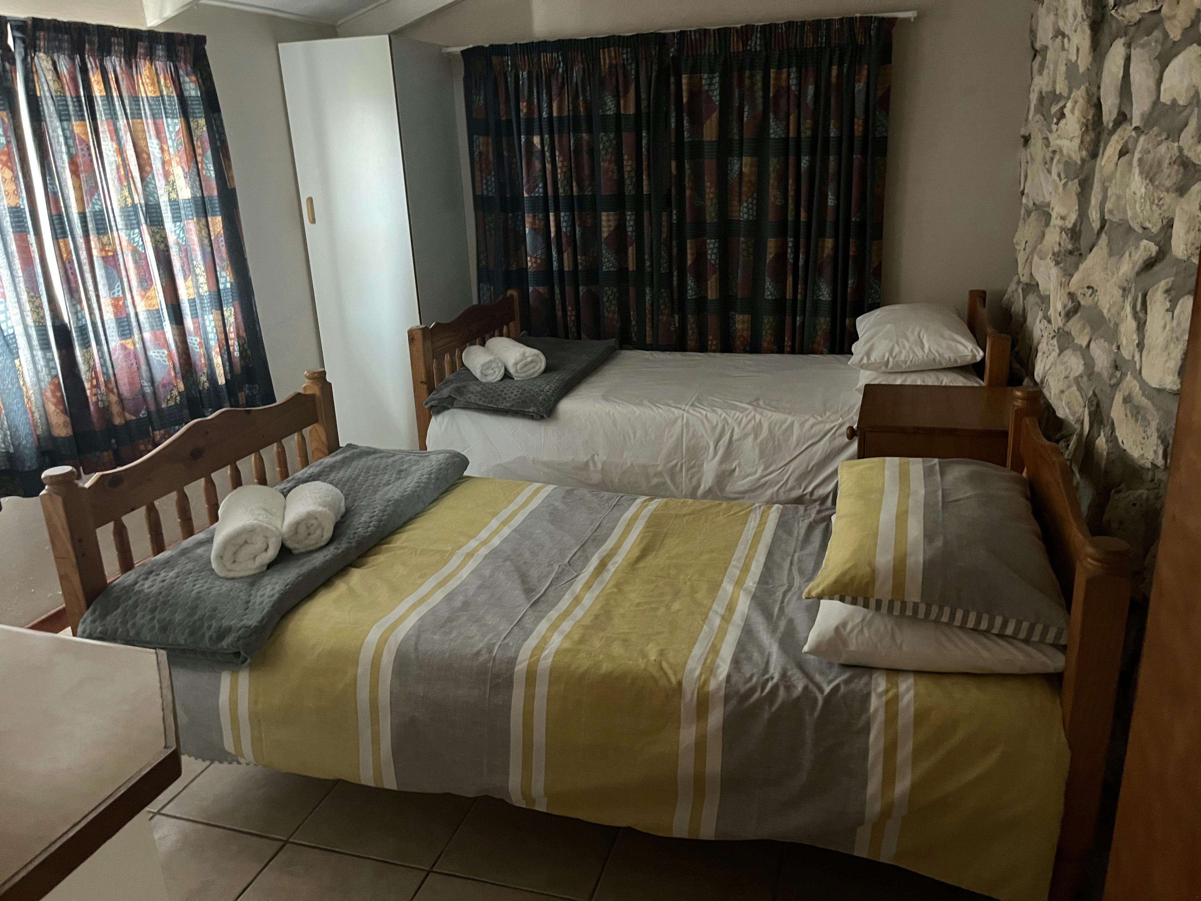 Gam is furnished with a double bed in the first bedroom and 2 single beds in the second bedroom. The bathroom is fitted with a shower, a bath, a toilet, and a basin. The kitchen is fully equipped for self-catering and contains a stove, oven, fridge-freezer, microwave, cutlery, and crockery. The lounge features a comfortable couch and a TV. There is a patio where guests can stand and take in the lovely views of the ocean.
