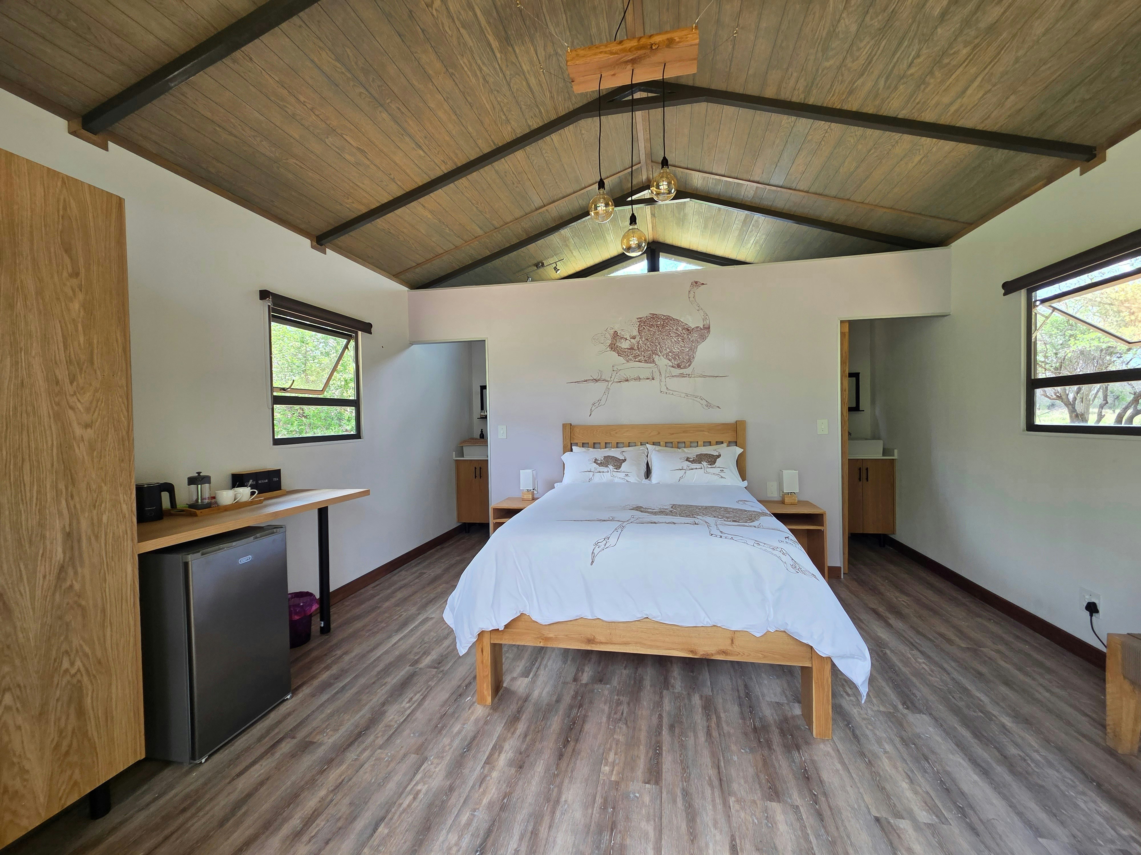 This chalet forms part of the property’s newly developed accommodation and has been thoughtfully designed to provide guests with a private and comfortable stay. It is ideal for overnight guests attending functions at the venue and offers a peaceful retreat surrounded by the natural beauty of the bushveld. The unit is furnished with care and features a double bed to ensure a restful night’s sleep. The layout is both practical and inviting, making it a perfect choice for couples or solo travellers seeking tranquil accommodation close to the venue. A separate bathroom fitted with a shower, basin, and toilet ensures comfort and privacy during your stay. Large windows frame picturesque views of the surrounding bushveld, allowing guests to appreciate the serene scenery from the comfort of the chalet. Guests can look forward to a peaceful setting where the simplicity and elegance of the unit blend seamlessly with the natural environment, offering a truly relaxing experience near the venue.