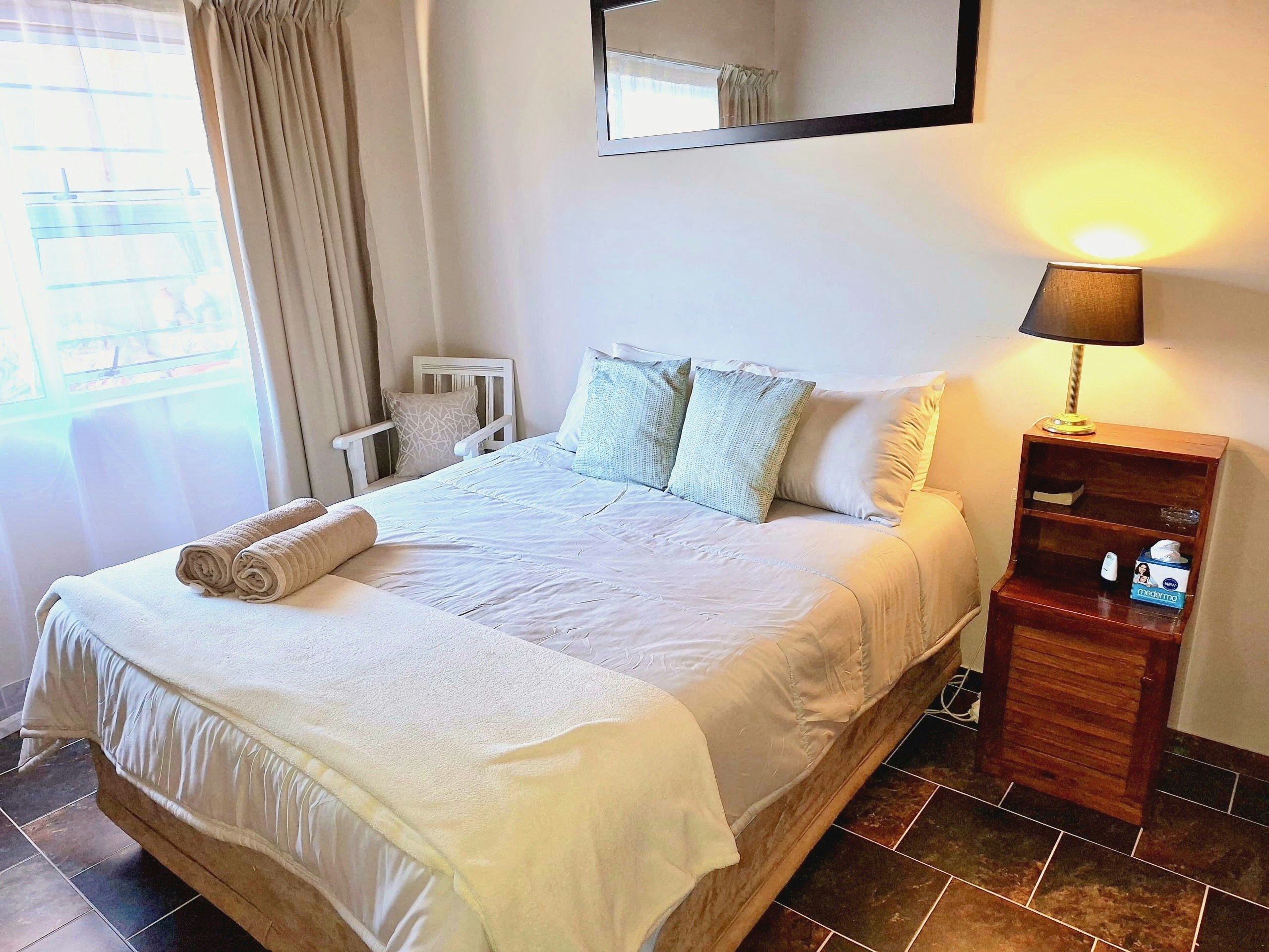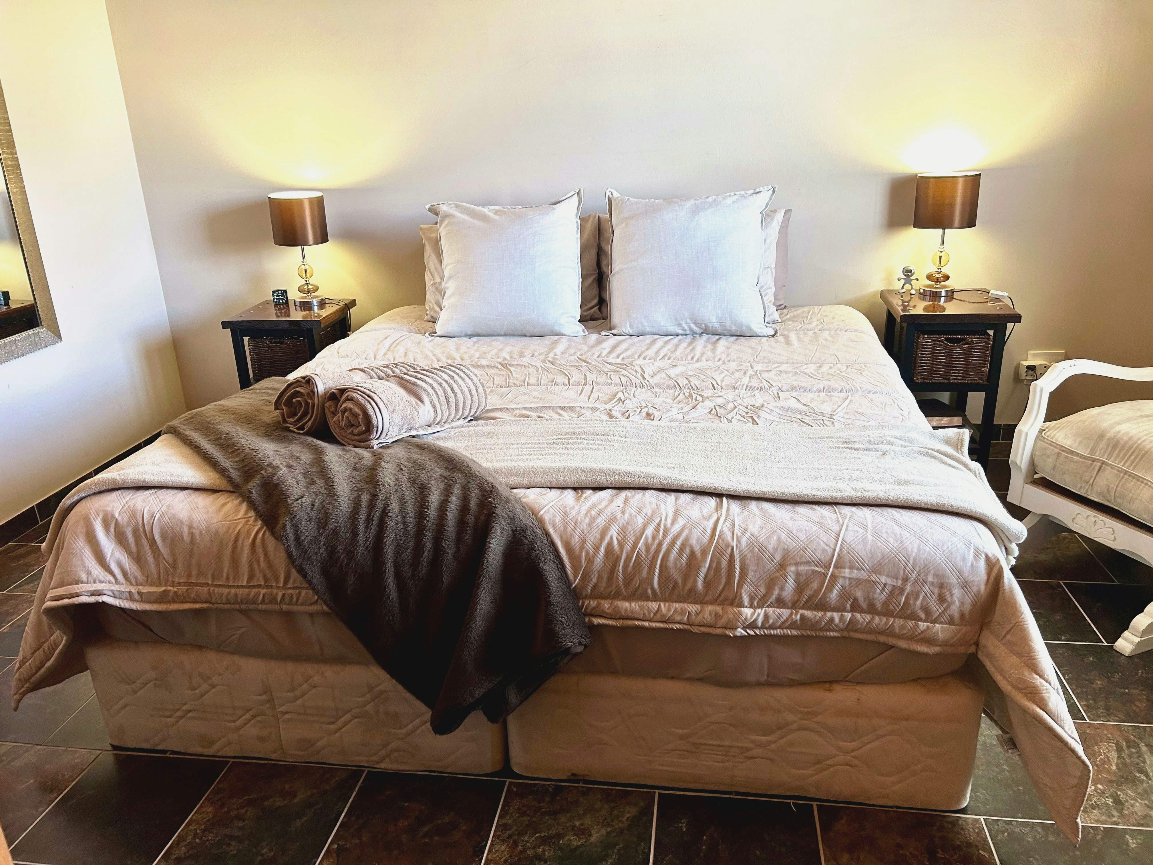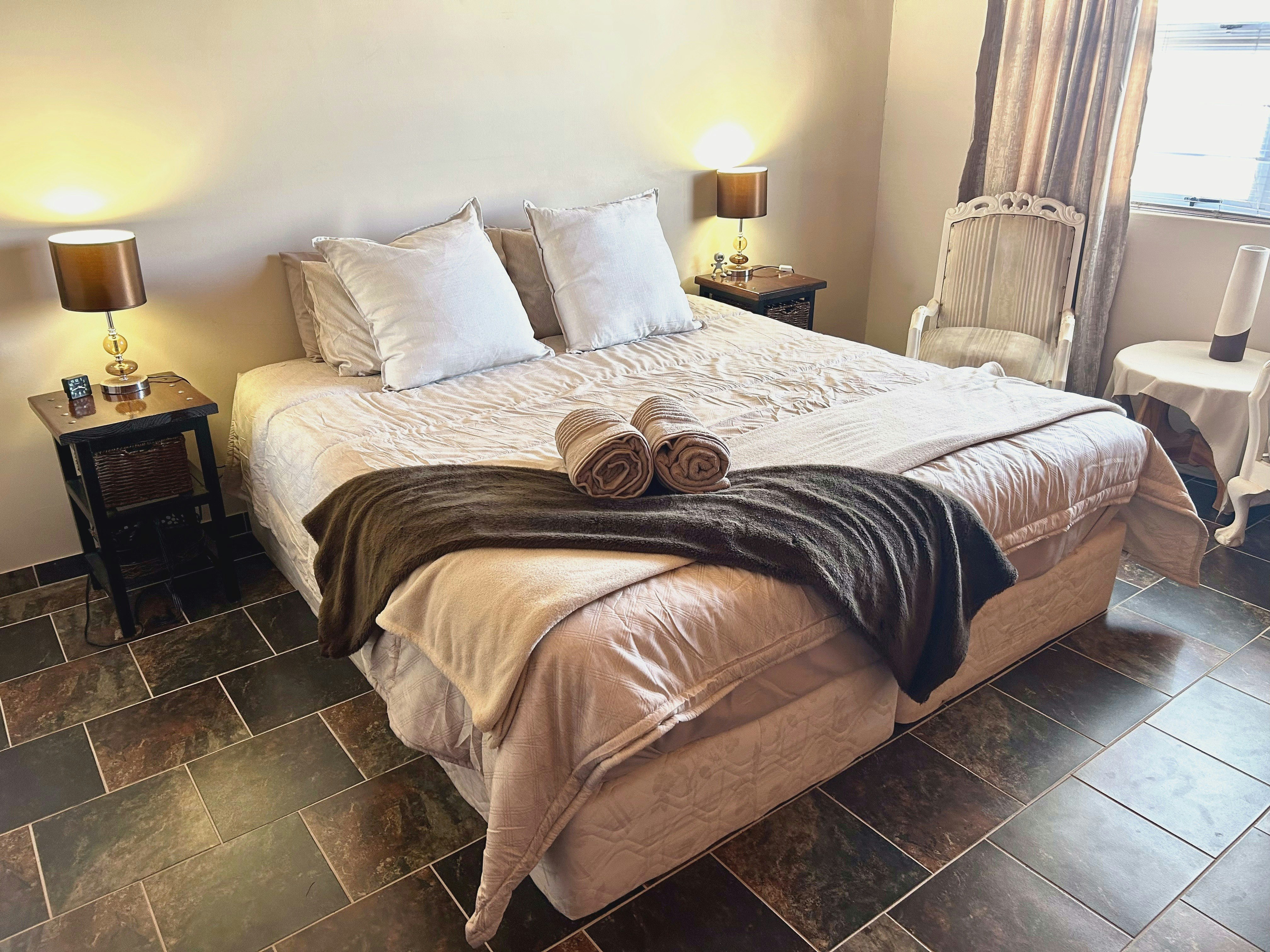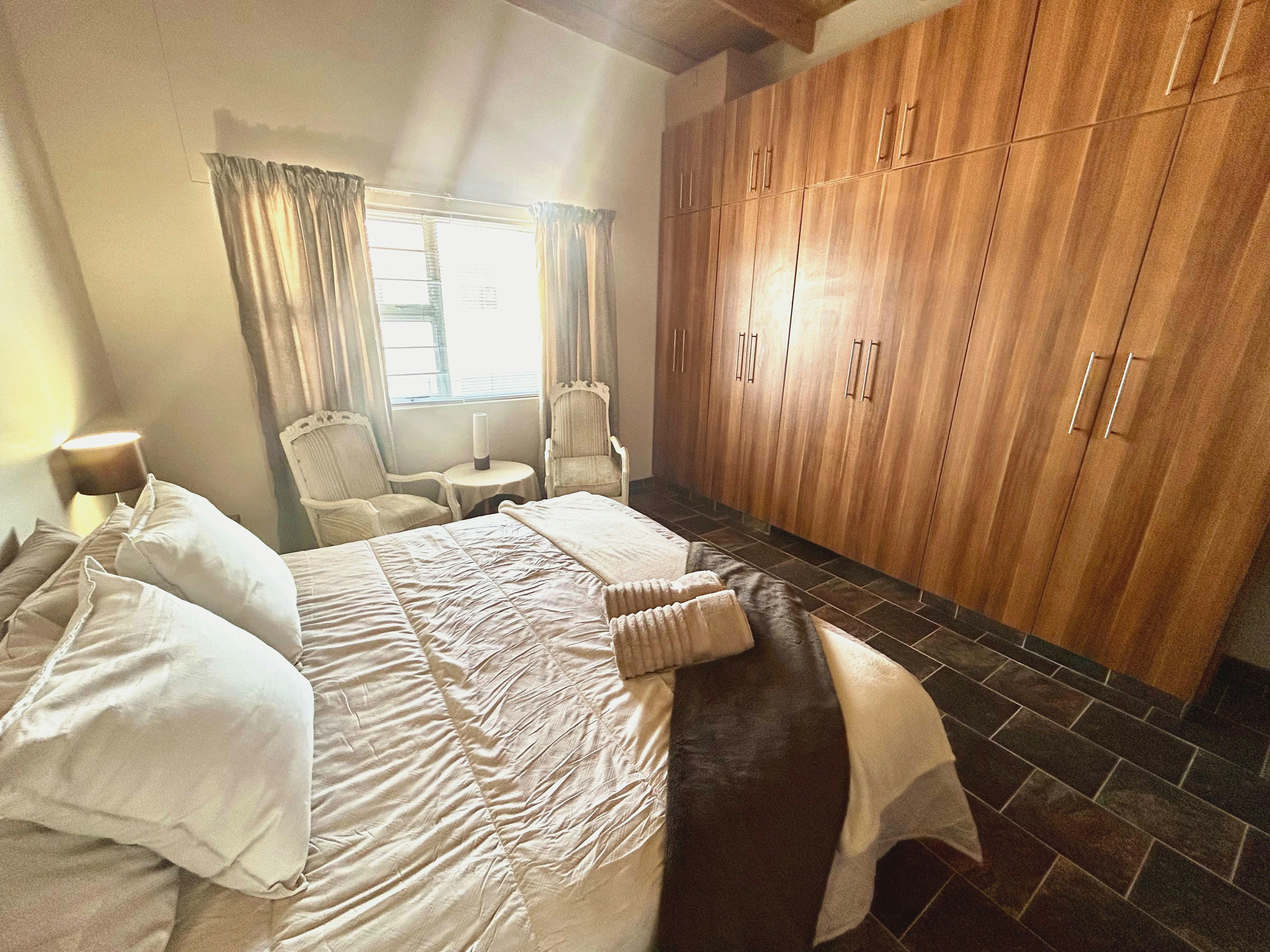 The house accommodates up to 6 guests in 3 comfortable bedrooms. One bedroom features a king bed and a lovely full en-suite bathroom. The second bedroom also has a king-size bed, and the third bedroom has a queen-size bed; both share two additional bathrooms, one fitted with a shower, toilet, and washbasin, and the other a full bathroom. A sleeper couch is available by prior arrangement for additional guests. Linen and towels are included, and cleaning services can be arranged at an additional cost. We can also provide a camping cot on requests for families traveling with little ones.