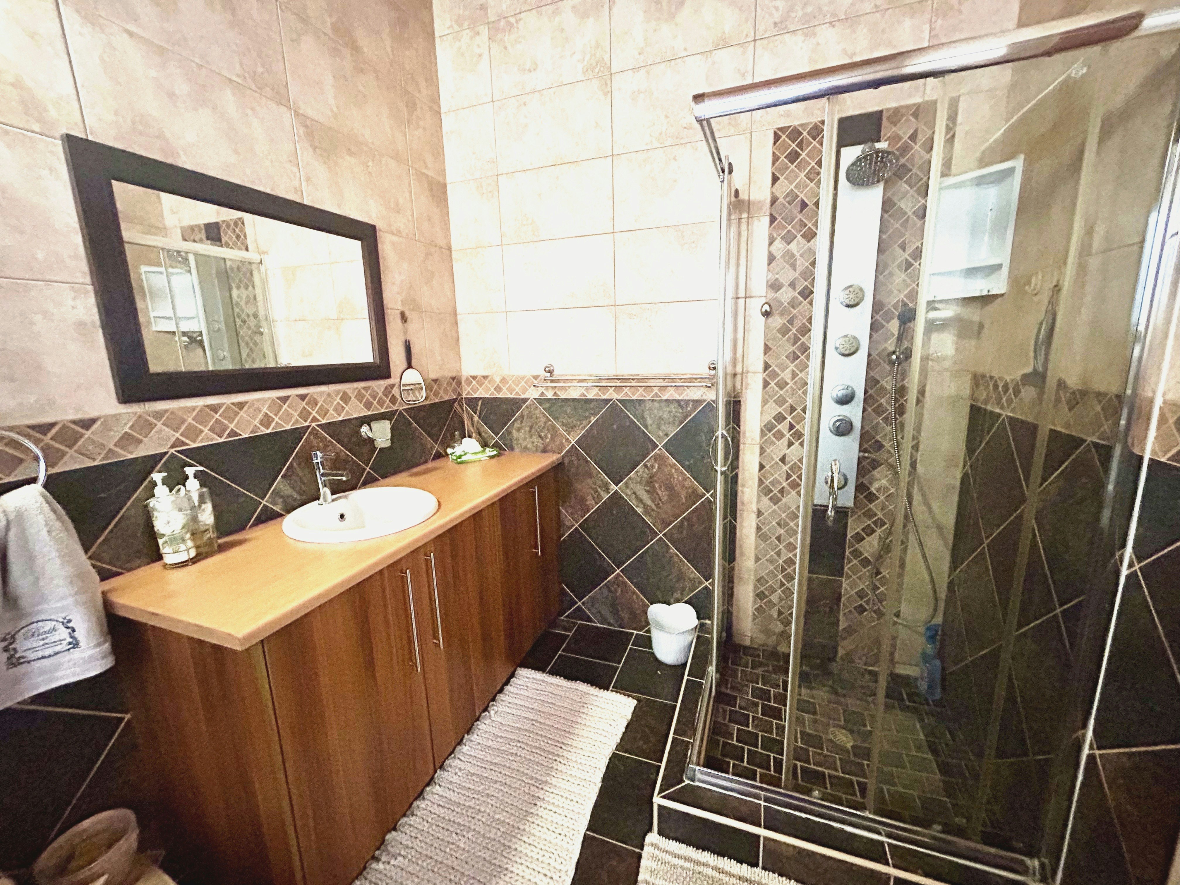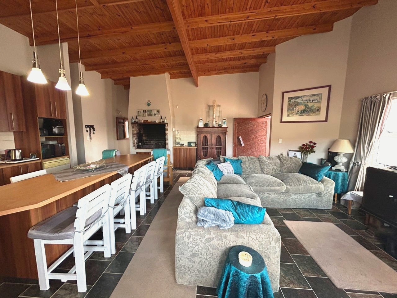 The large open-plan living area creates a cosy space for families and friends to connect, while the indoor braai/fireplace makes evenings warm and memorable. Guests can also enjoy uncapped Wi-Fi, a Smart TV, log into your preferred streaming service, and a fully equipped kitchen with a fridge-freezer, a stove, oven, kettle, microwave, toaster, and an air fryer, as well and washing machine for added convenience.