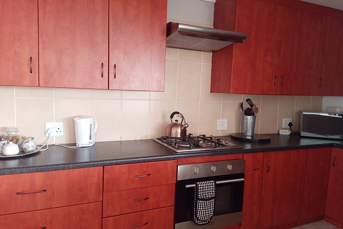 The open-plan living area features a kitchen equipped with a gas stove, oven, microwave, fridge-freezer, cutlery and crockery as well as tea- and coffee-making facilities. Leading from the kitchen is a cosy lounge space and a dining table with ample seating for guests to enjoy their meals.