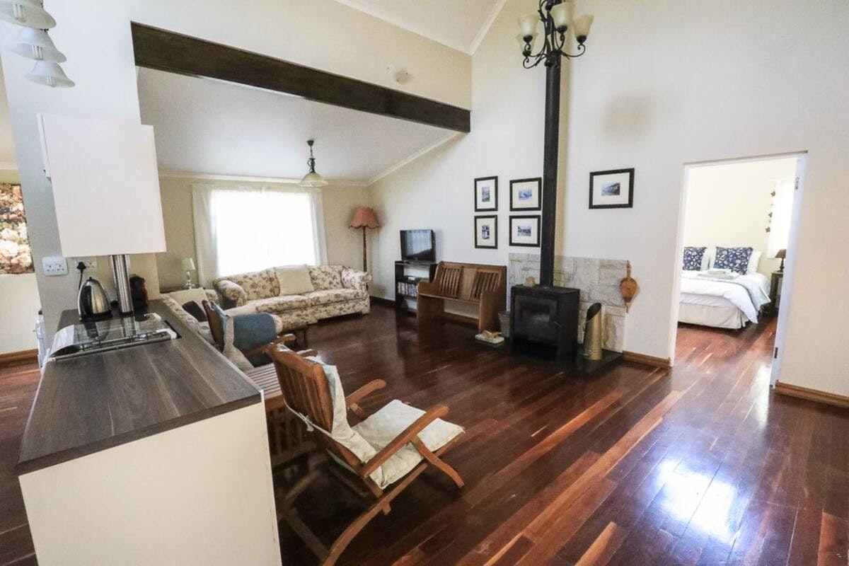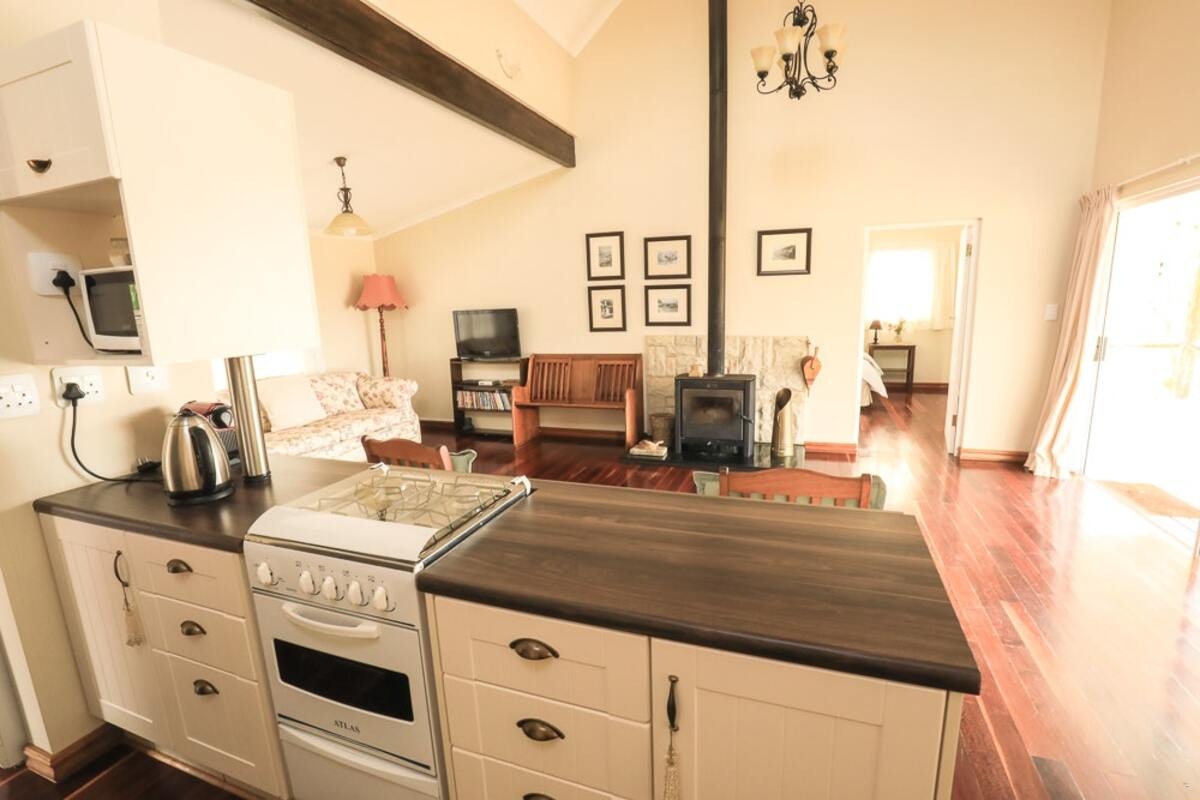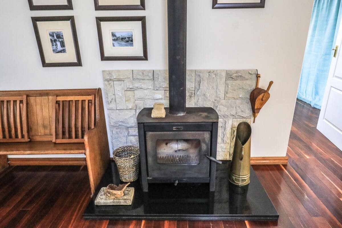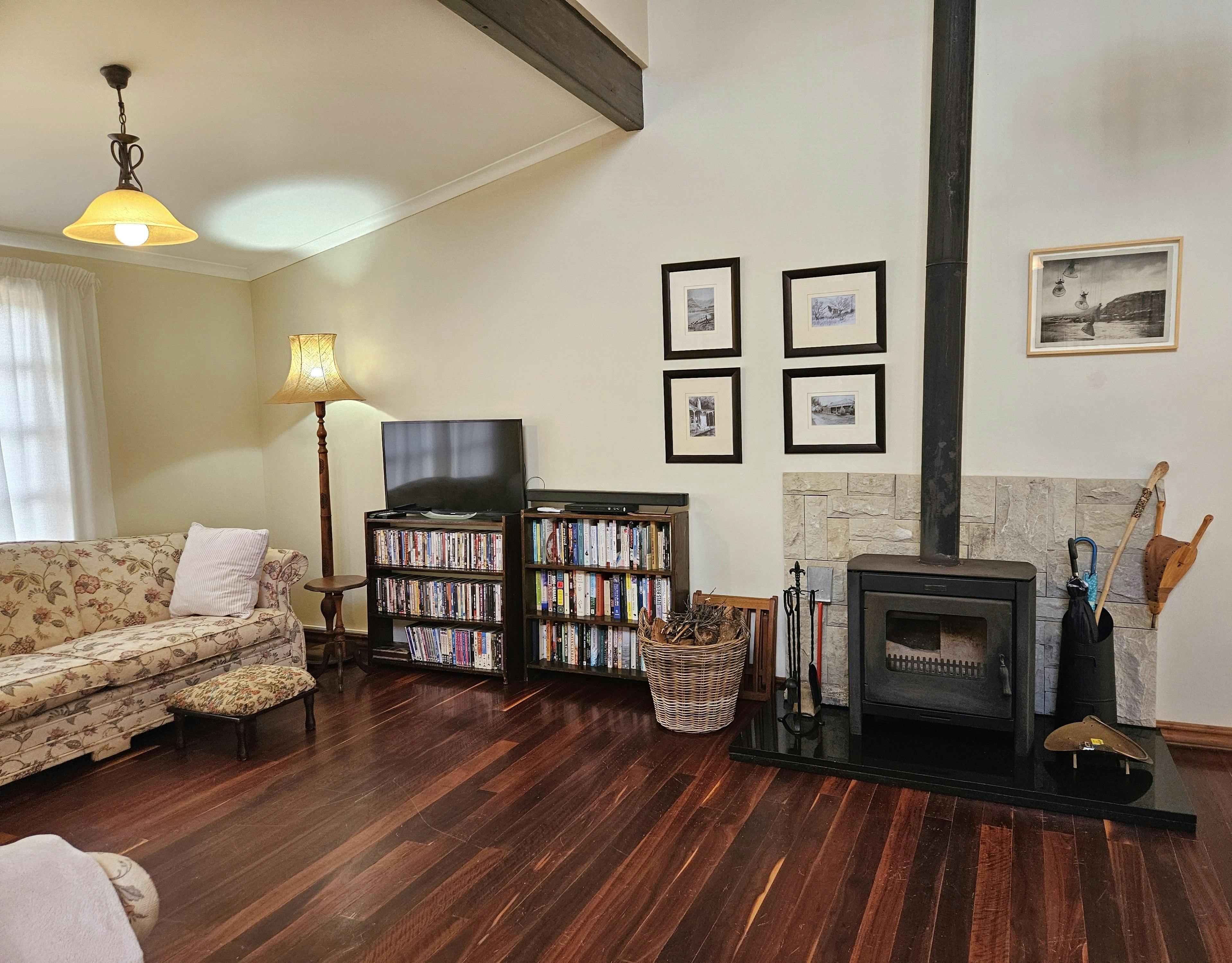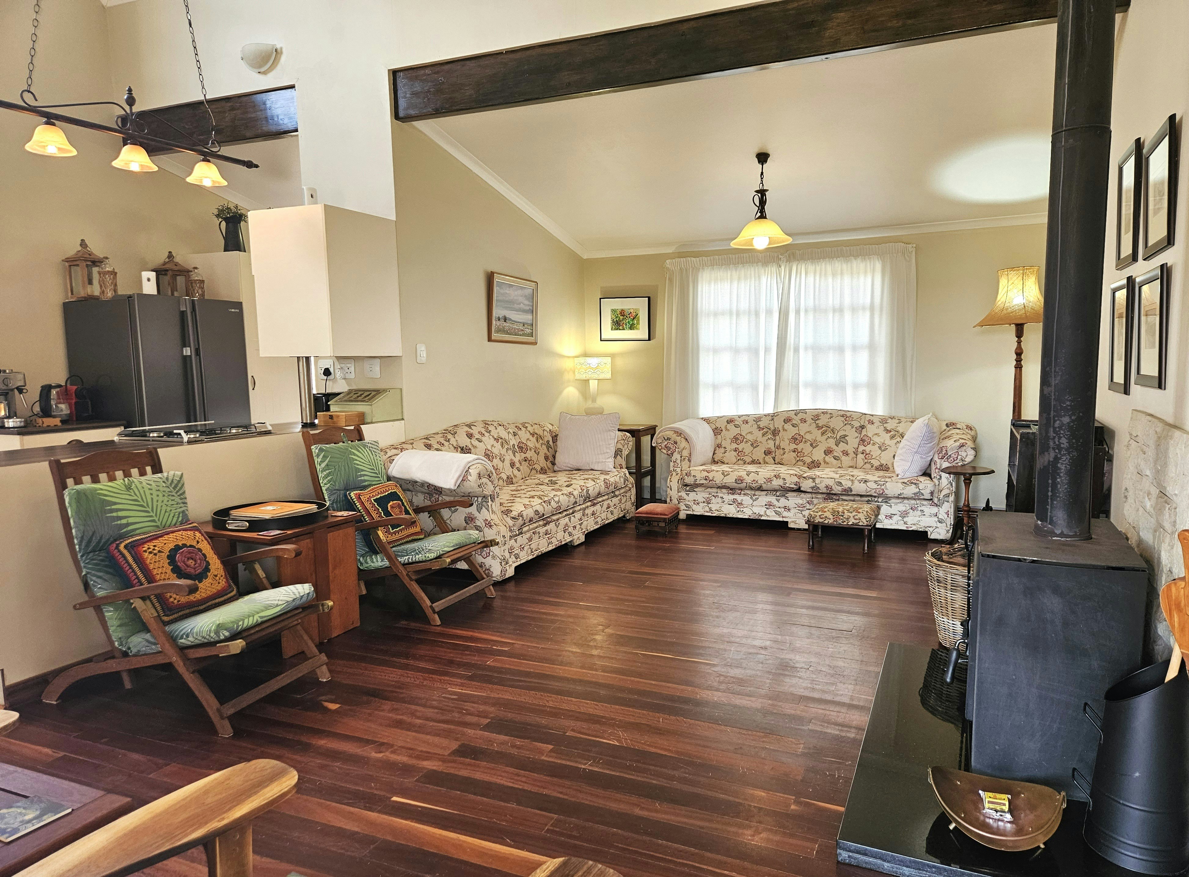 Die ruim oopplan-kombuis is met 'n stoof, dubbelyskas, mikrogolfoond en 'n wasmasjien toegerus. Daar is ook 'n Nespresso-koffiemasjien. Die leefarea het 'n houtkaggel en groot skuifdeure wat na 'n groot dek lei.