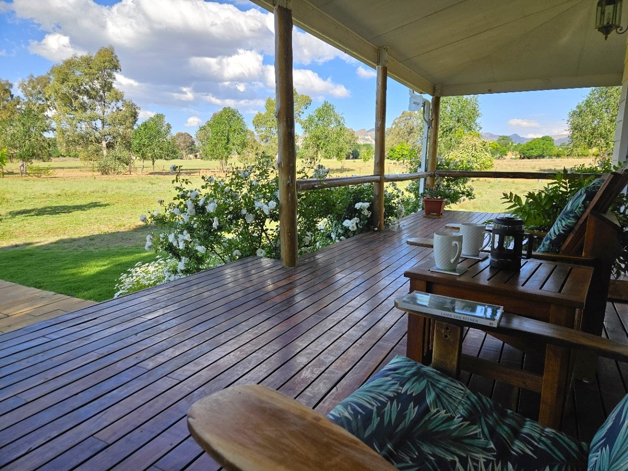 Die dek bied 'n uitsig oor die plaasstyl-plonspoel en plattelandse omgewing, en op die berge. Daar is ook 'n groot braai, sambreel en buitestoele waar gaste heerlik kan kuier. Veilige parkeerplek is agter geslote hekke op die perseel beskikbaar.