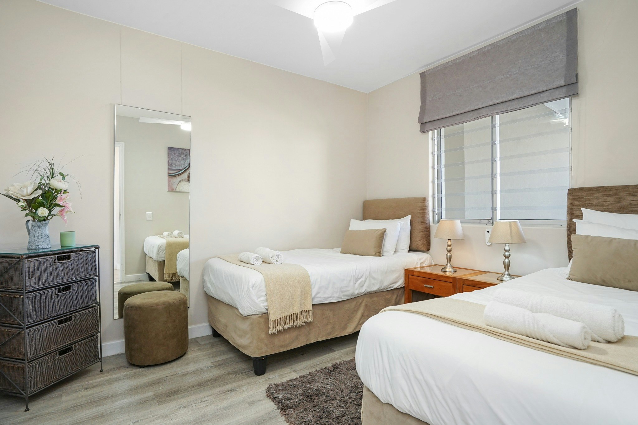 This air-conditioned apartment can accommodate up to 6 guests and comprises 3 bedrooms, 2 bathrooms, and an open-plan kitchen, dining area, and lounge. The first bedroom contains a double bed, a ceiling fan, and sliding doors opening to the balcony. The second bedroom contains a double bed. The third bedroom contains 2 single beds. Both bathrooms contains a shower, basin and toilet.