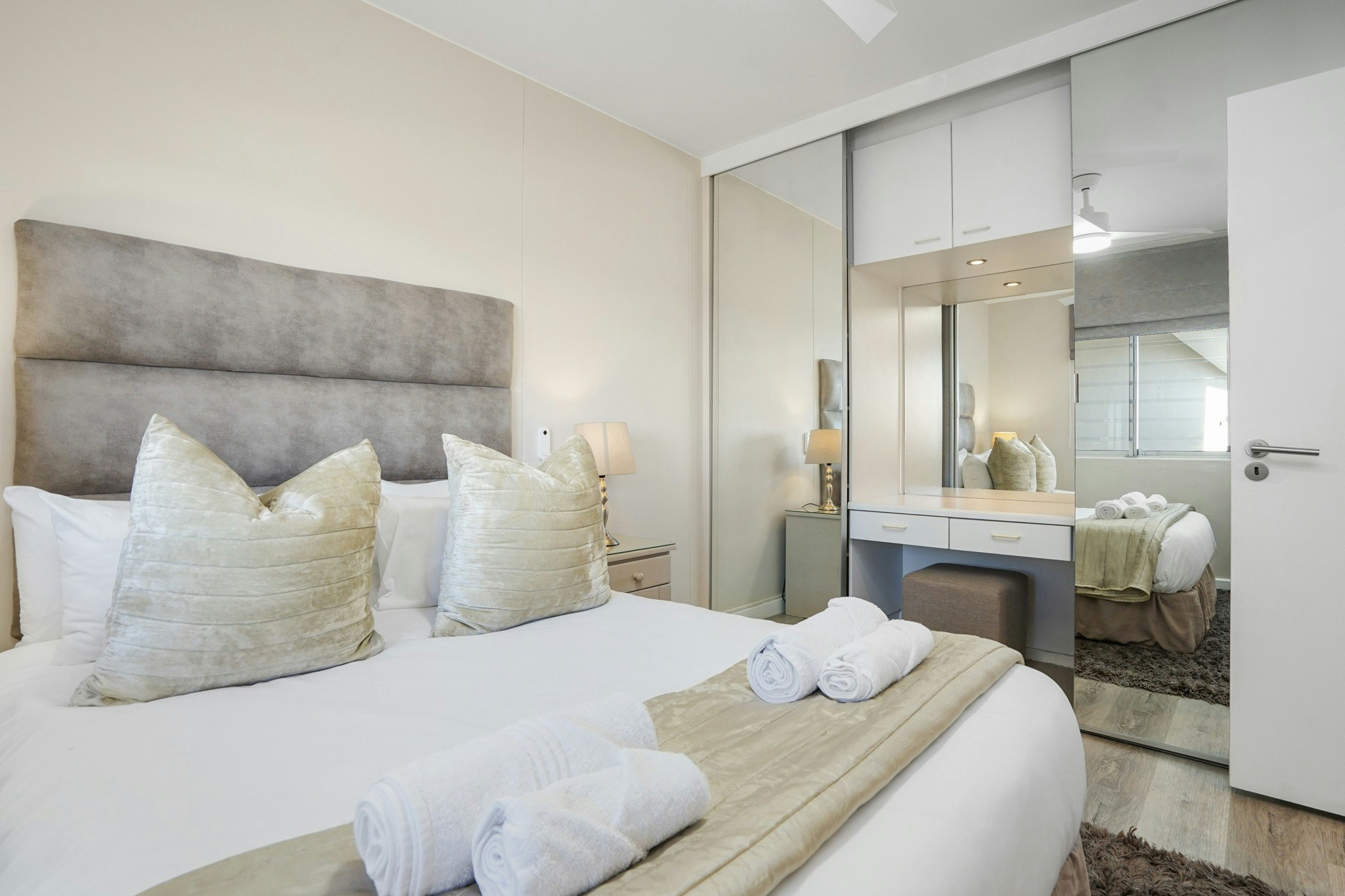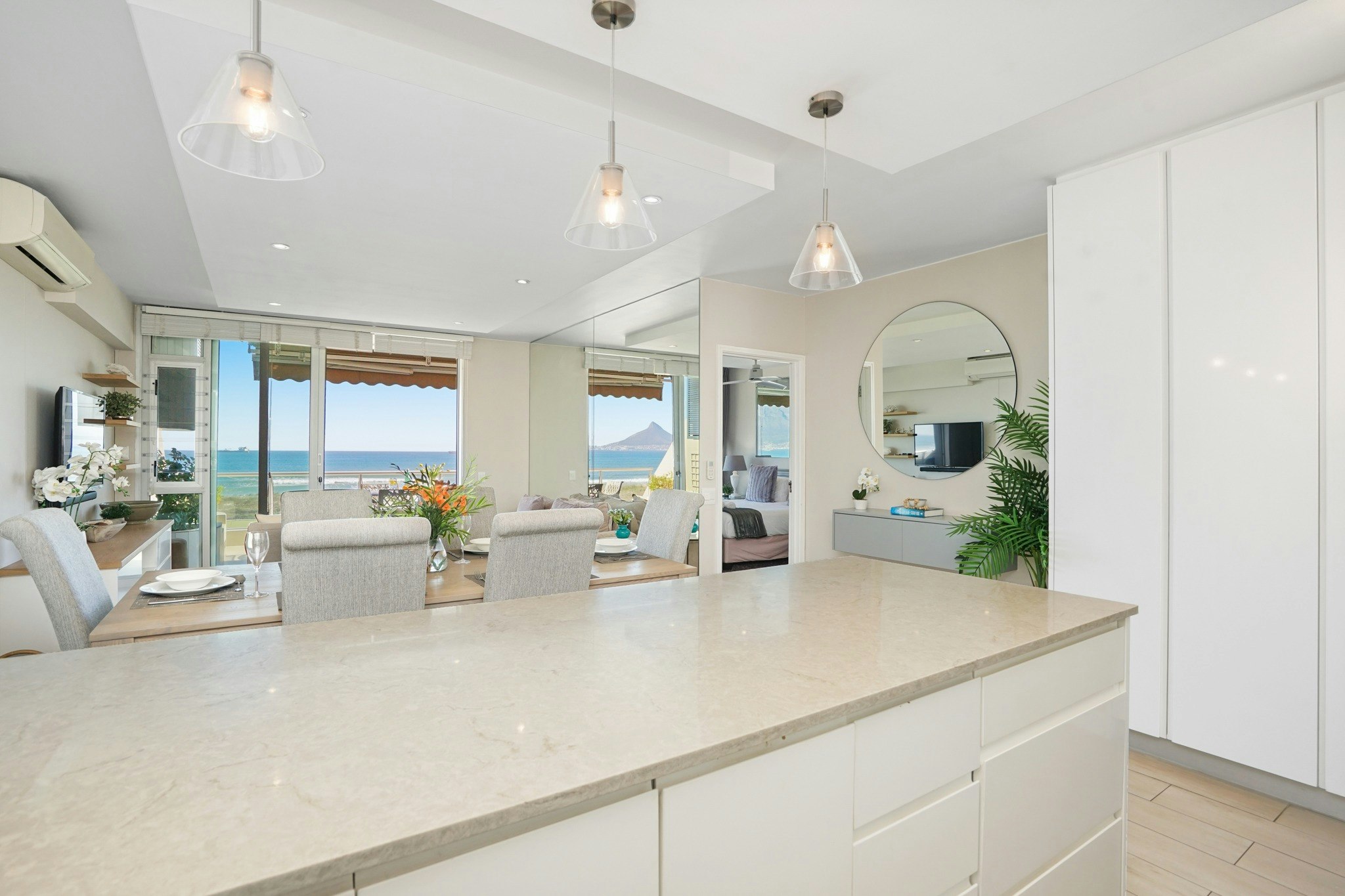 The pristine kitchen with smooth granite surfaces is fully equipped, with a washing machine, fridge, stove, oven, and dishwasher. The dining area seats 6 around a long and classy wooden table. The lavishly furnished lounge includes a wall-mounted flat-screen TV. The lounge leads out via sliding doors to a balcony with outdoor dining for 6, braai facilities as well as ocean and mountain views. The apartment has been equipped with an inverter system, to ensure uninterrupted electricity.