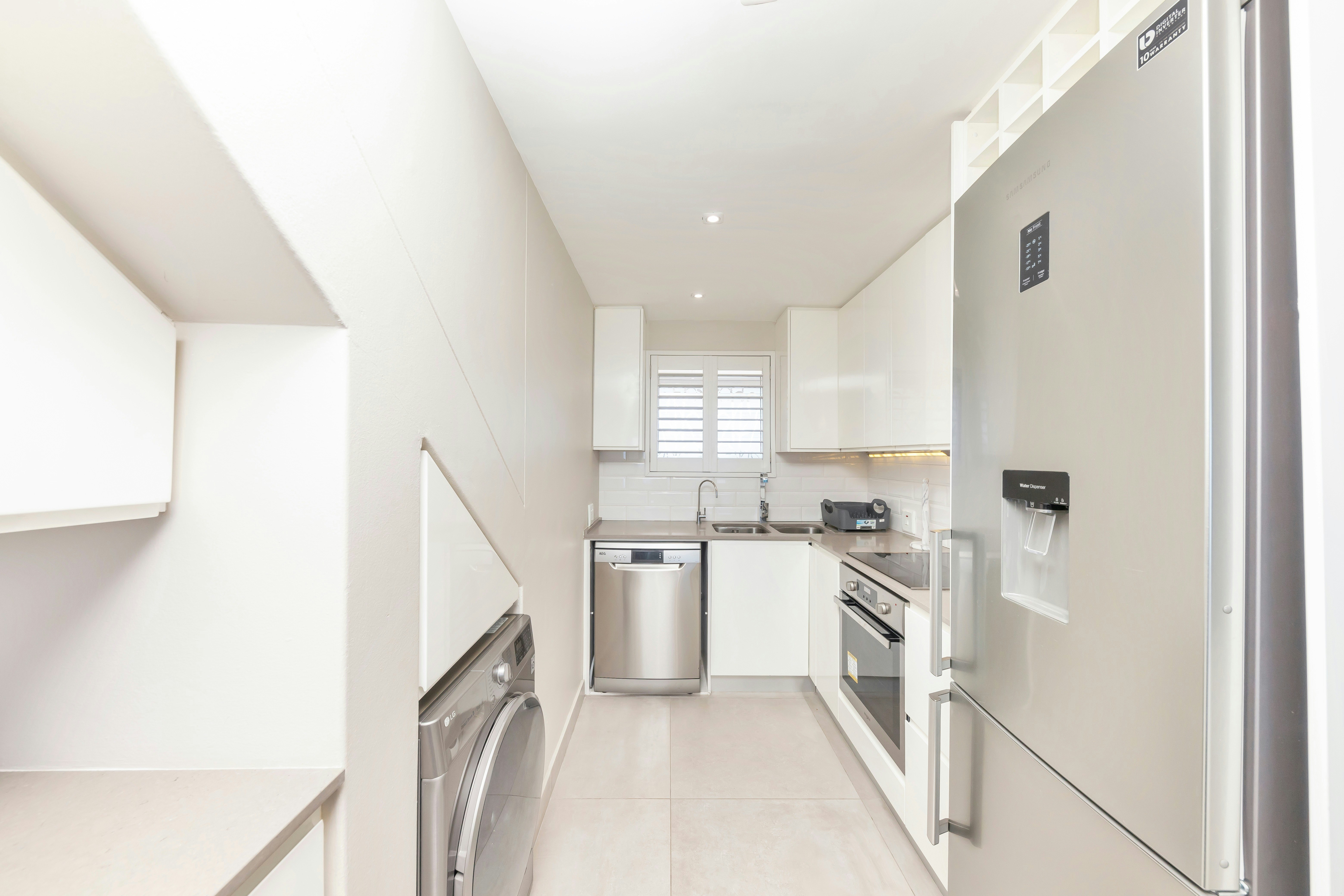 The modern kitchen is equipped with a fridge-freezer, stove, oven, microwave, basic cutlery, crockery, and tea- and coffee-making facilities, and features a dishwasher, and washing machine for guests’ convenience. There’s also a centrally located breakfast island with stools. The kitchen flows to the lounge furnished with plush seating and a flat-screen TV.