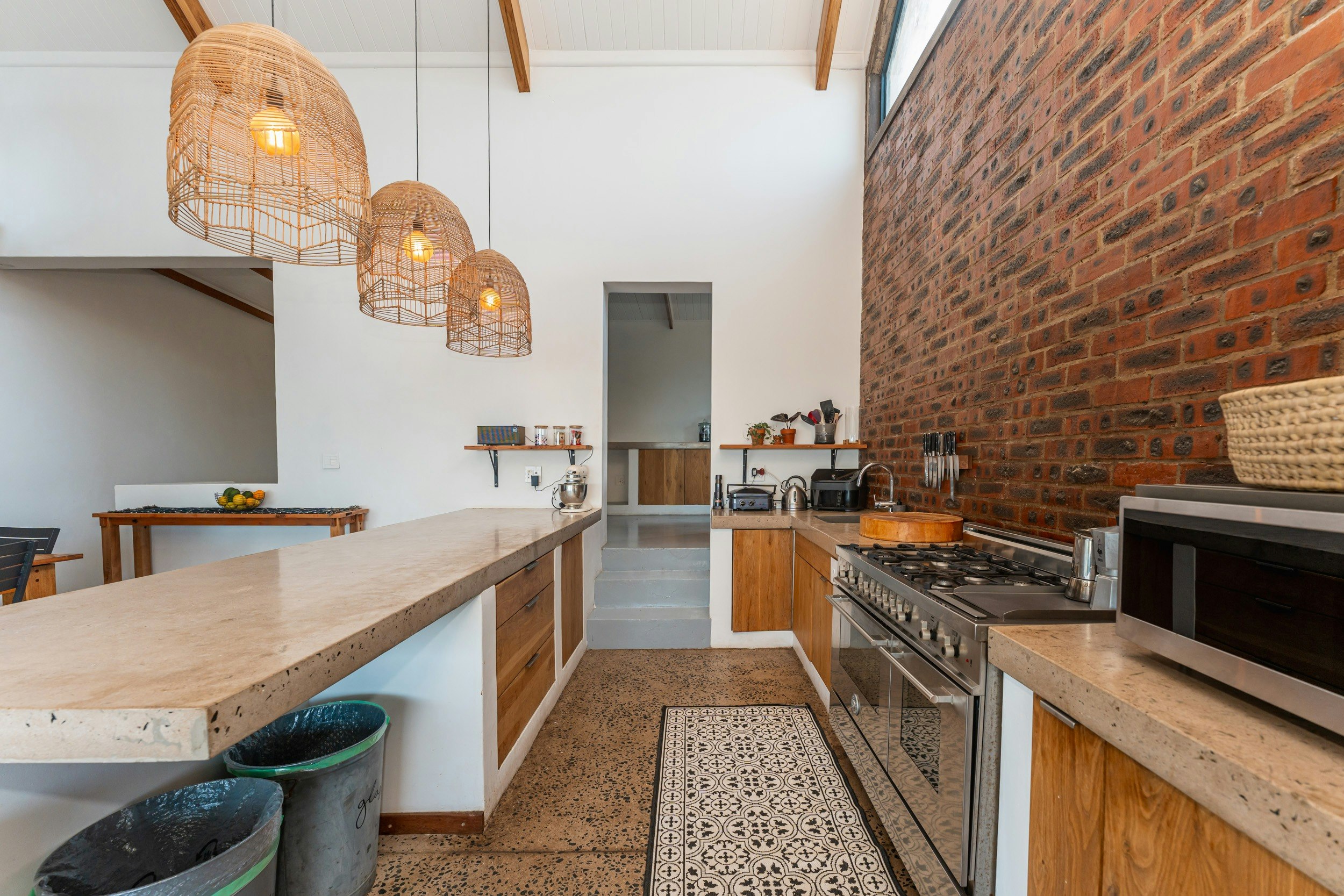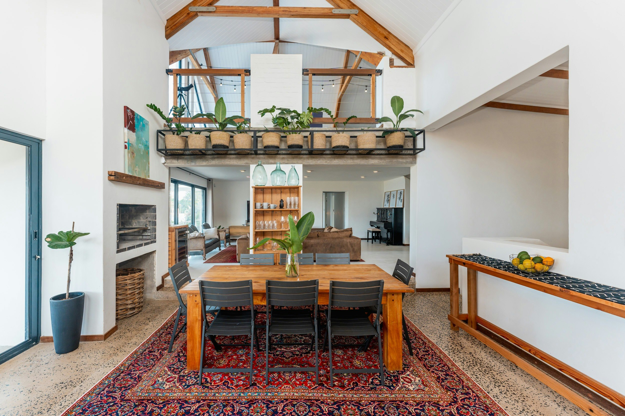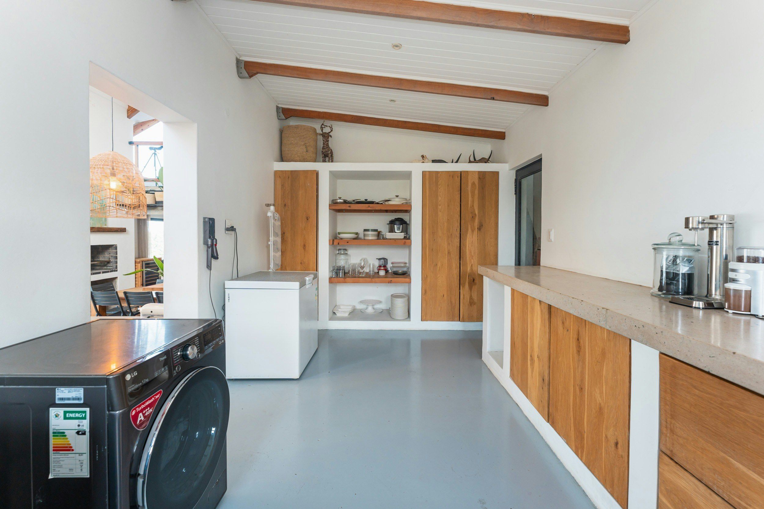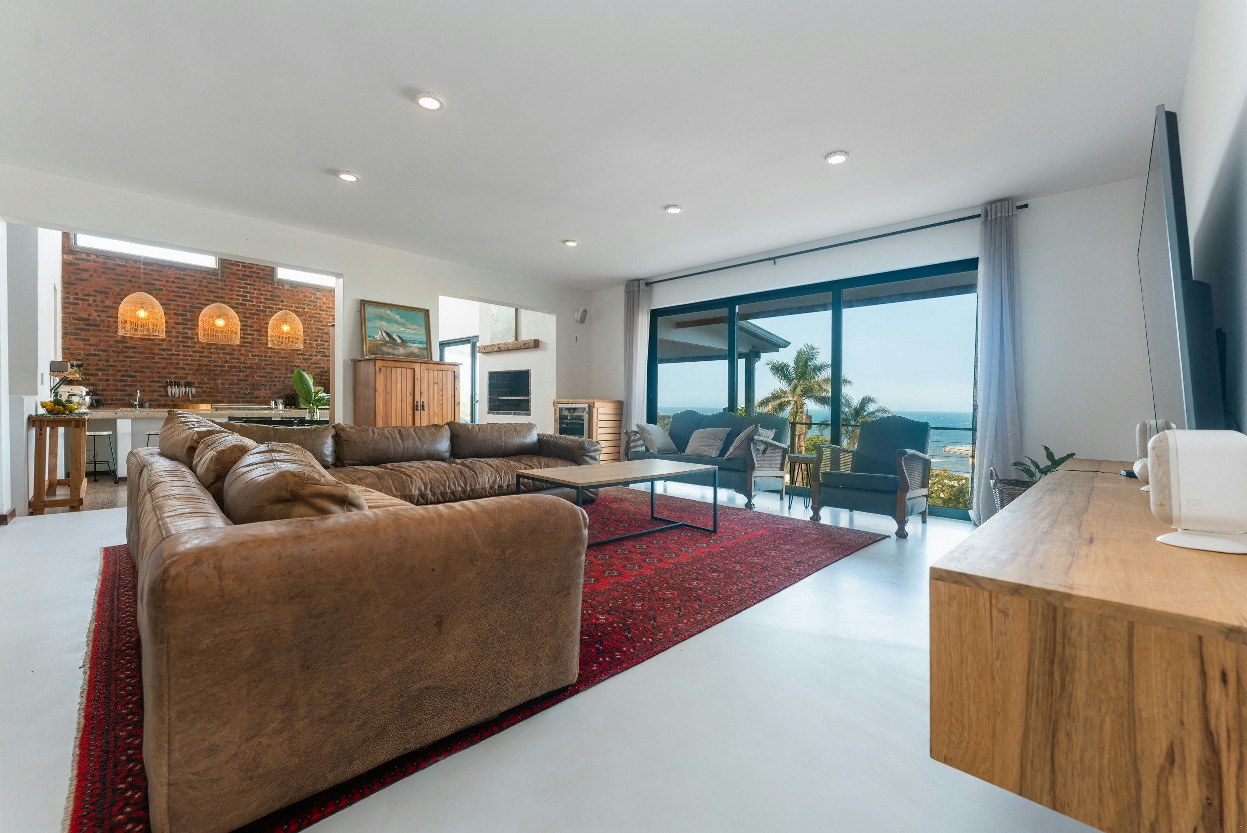 Die ruim oopplan-leefarea met lugversorging beskik oor 'n kombuis wat met 'n gasstoof, elektriese oond, lugbraaier, mikrogolf, yskas-vrieskas, eetgerei, breekware en 'n toonbank met stoele toegerus is. 'n Skottelgoedwasser, wasmasjien en 'n tuimeldroër is in die opwaskamer beskikbaar. Die kombuis lei na 'n eetarea met 'n binnebraai en 'n sitarea met gemaklike rusbanke en 'n platskerm-TV. Daar is ook 'n solder met gemaklike sitplek en 'n asemrowende see-uitsig.