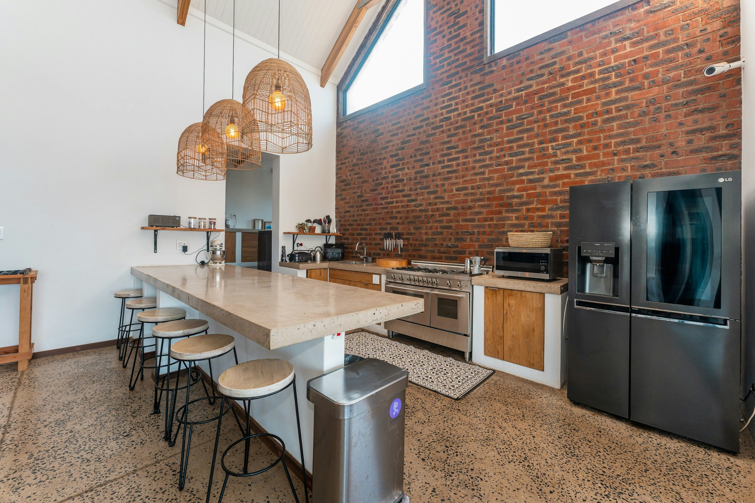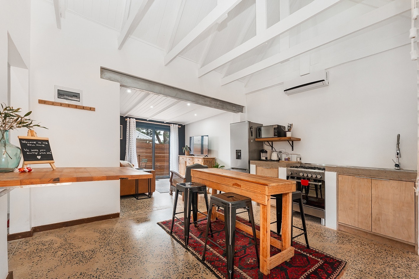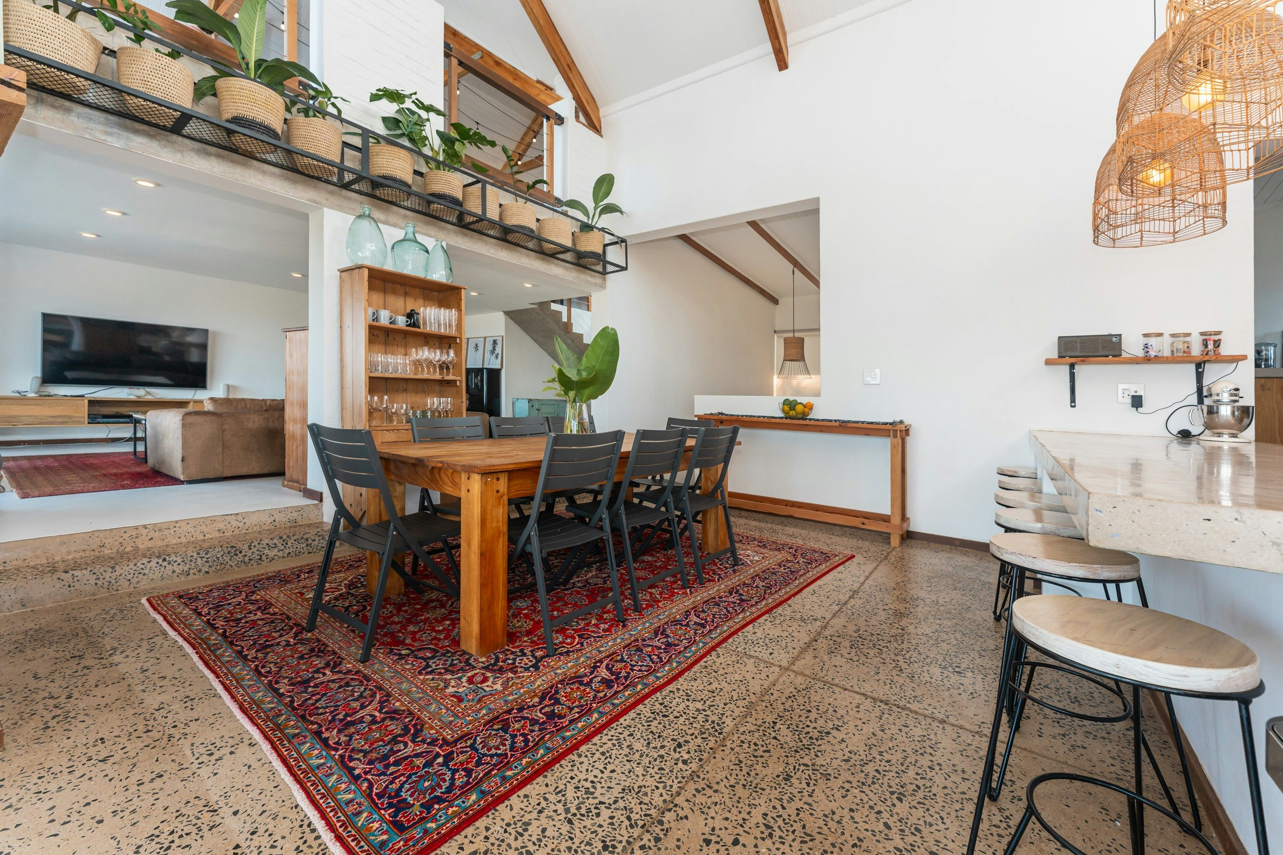 Die ruim oopplan-leefarea met lugversorging beskik oor 'n kombuis wat met 'n gasstoof, elektriese oond, lugbraaier, mikrogolf, yskas-vrieskas, eetgerei, breekware en 'n toonbank met stoele toegerus is. 'n Skottelgoedwasser, wasmasjien en 'n tuimeldroër is in die opwaskamer beskikbaar. Die kombuis lei na 'n eetarea met 'n binnebraai en 'n sitarea met gemaklike rusbanke en 'n platskerm-TV. Daar is ook 'n solder met gemaklike sitplek en 'n asemrowende see-uitsig.