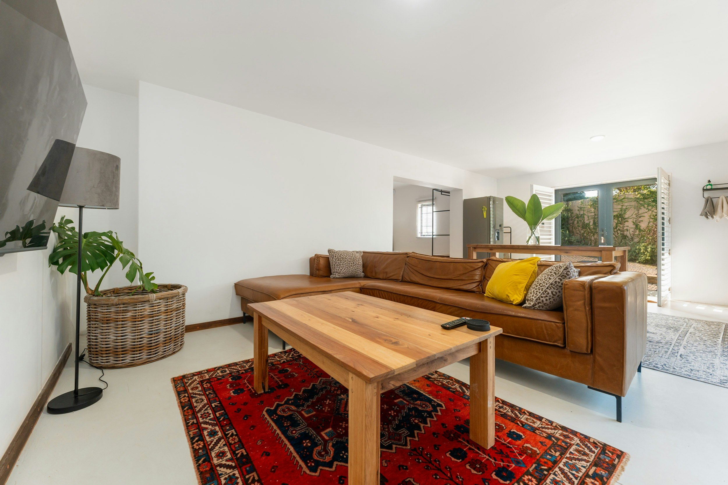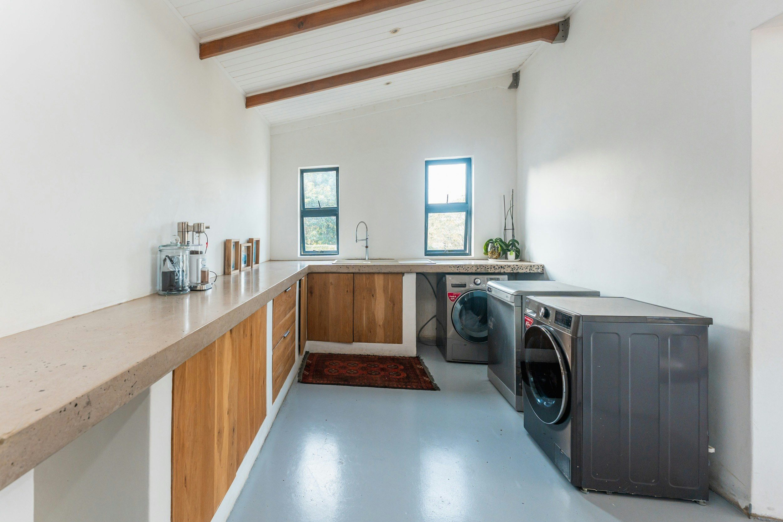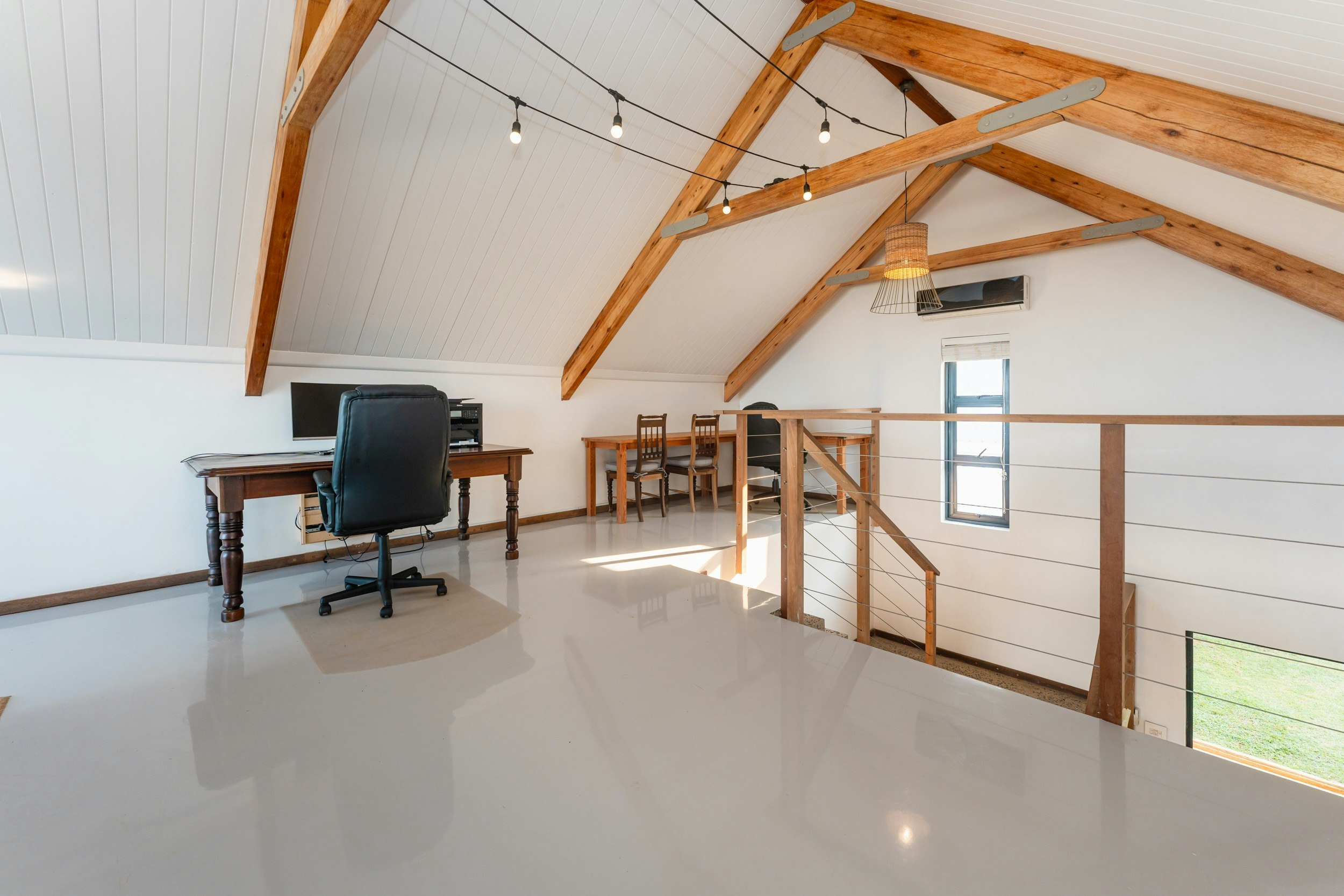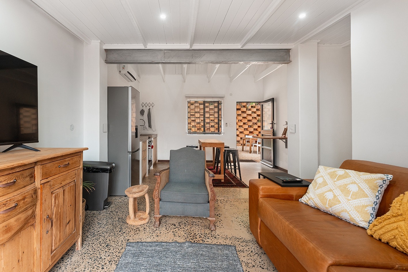 Die ruim oopplan-leefarea met lugversorging beskik oor 'n kombuis wat met 'n gasstoof, elektriese oond, lugbraaier, mikrogolf, yskas-vrieskas, eetgerei, breekware en 'n toonbank met stoele toegerus is. 'n Skottelgoedwasser, wasmasjien en 'n tuimeldroër is in die opwaskamer beskikbaar. Die kombuis lei na 'n eetarea met 'n binnebraai en 'n sitarea met gemaklike rusbanke en 'n platskerm-TV. Daar is ook 'n solder met gemaklike sitplek en 'n asemrowende see-uitsig.