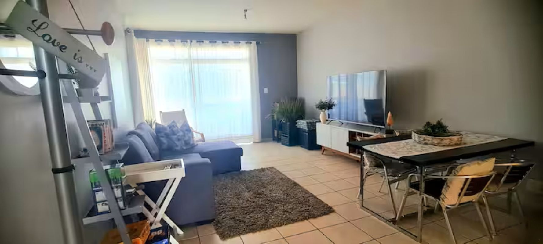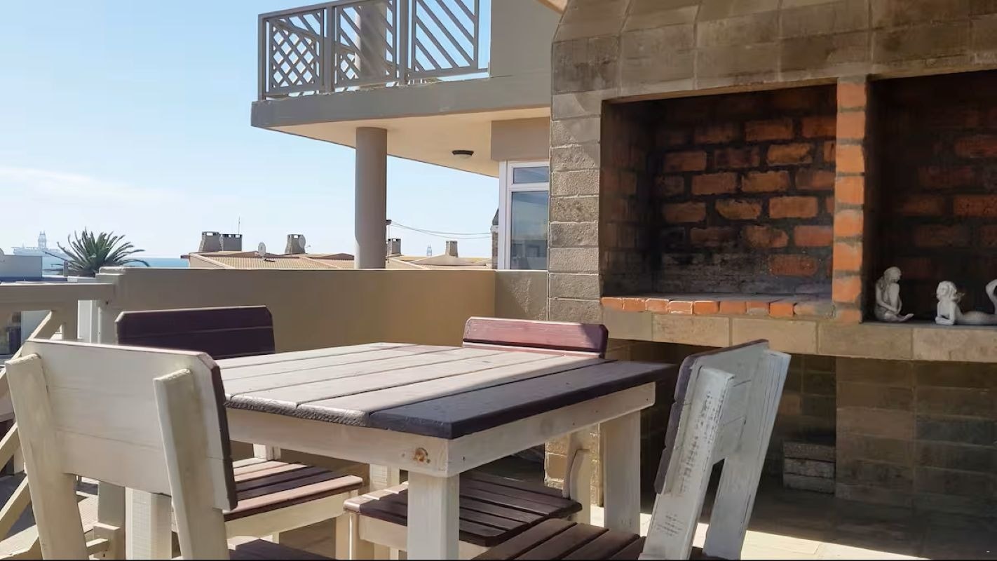 The open-plan living area offers a fully equipped kitchen with a stove, oven, washing machine, tumble dryer, microwave, kettle, cutlery, crockery, utensils, toaster, and a breakfast counter. It leads to the dining table that can accommodate 4 guests and flows to the lounge furnished with comfortable seating, a sleeper couch, TV, Wi-Fi, and walks out onto a balcony with a built-in braai, outdoor furniture, and an ocean view.