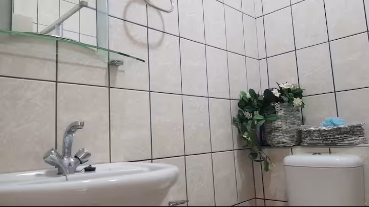 The apartment comprises 2 bedrooms, each furnished with a double bed, closet space, and 2 bathrooms. The first bathroom is fitted with a bath, toilet, and basin; the second bathroom is fitted with a shower, toilet, and basin.