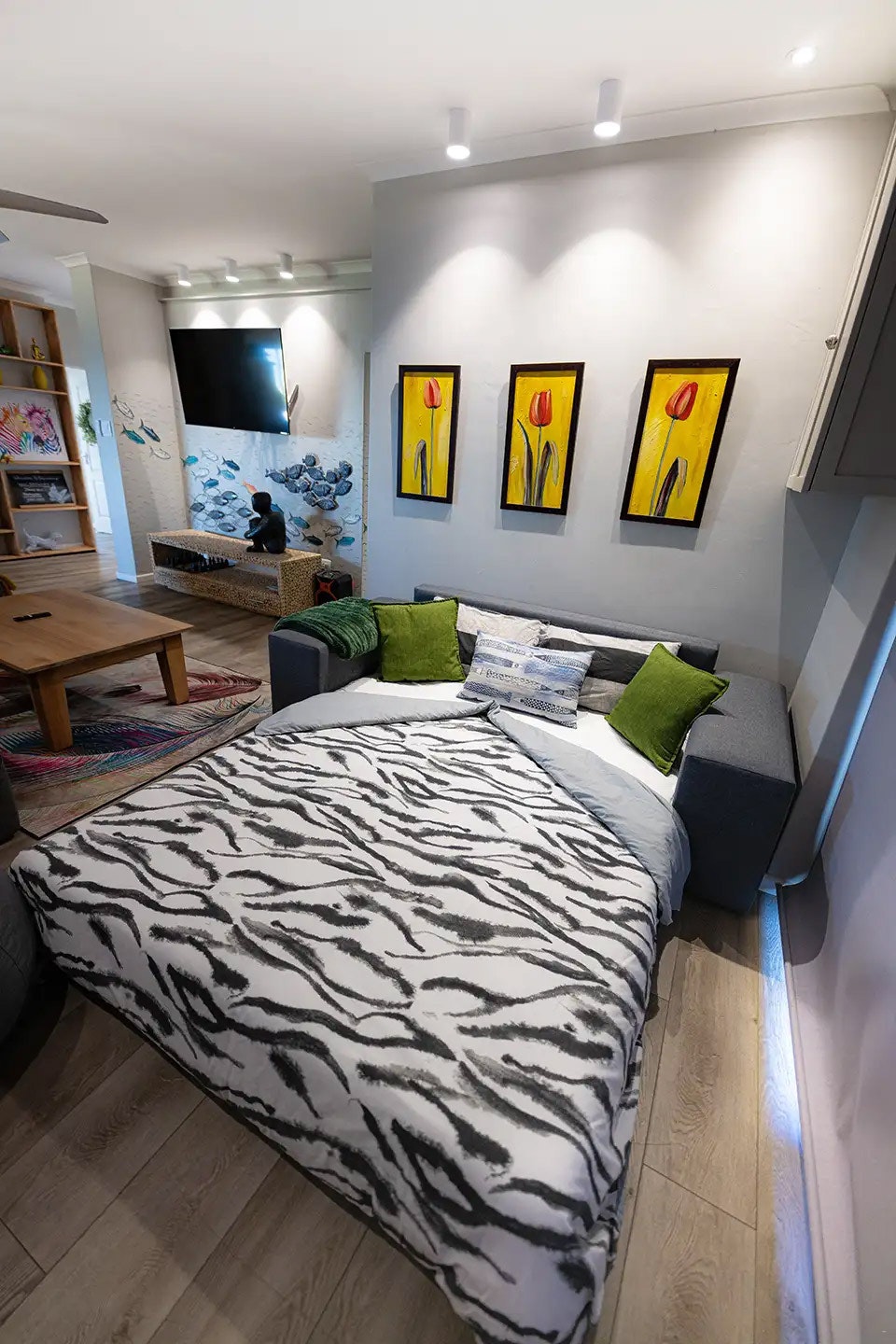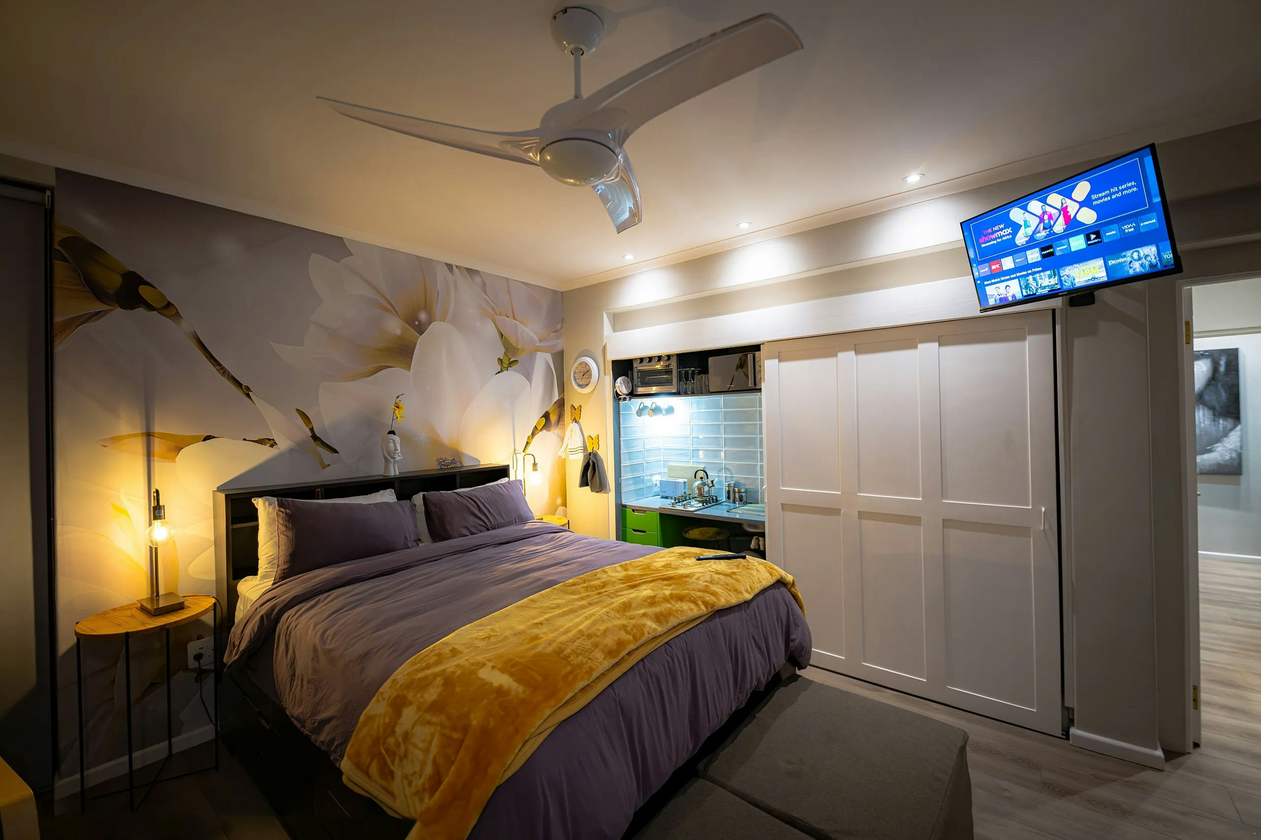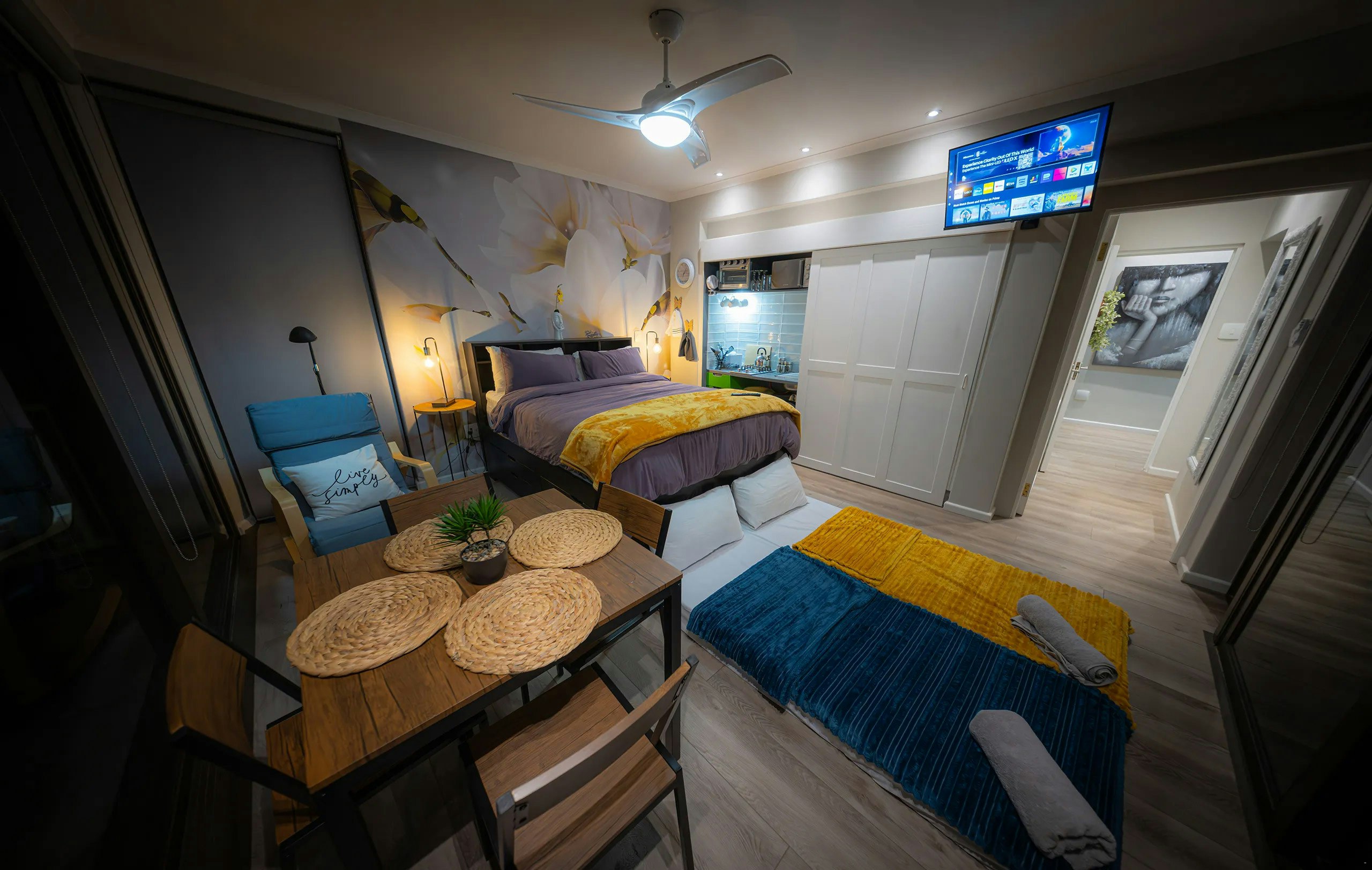 The Glass Suite sleeps 2 adults and 1 child or 2 small children. It comprises one bedroom with a queen-sized bed and 2 pop-out mattresses on the floor, a compact kitchenette, and a private deck with a Jacuzzi, exterior blinds, and spectacular ocean and mountain views, even from bed.