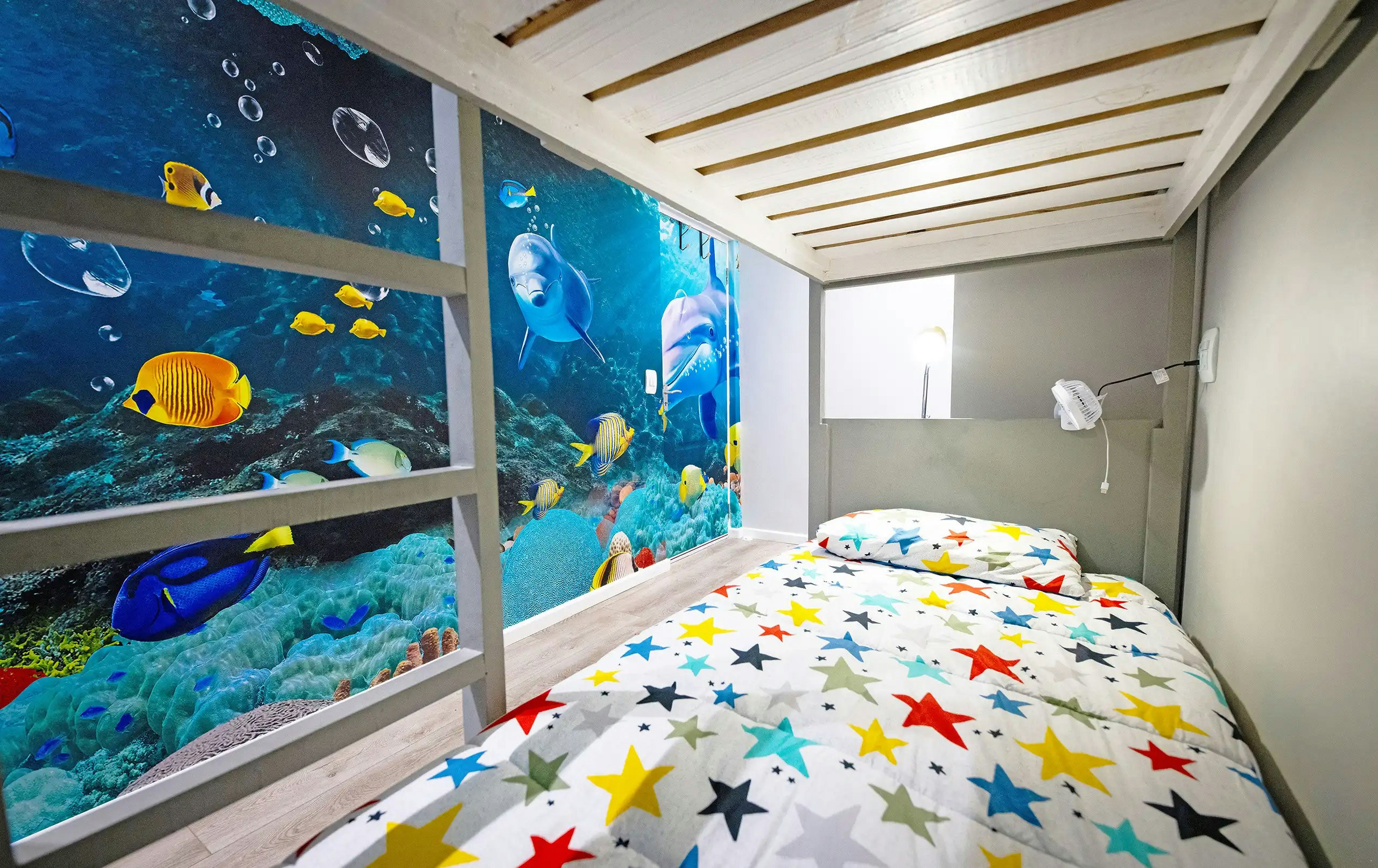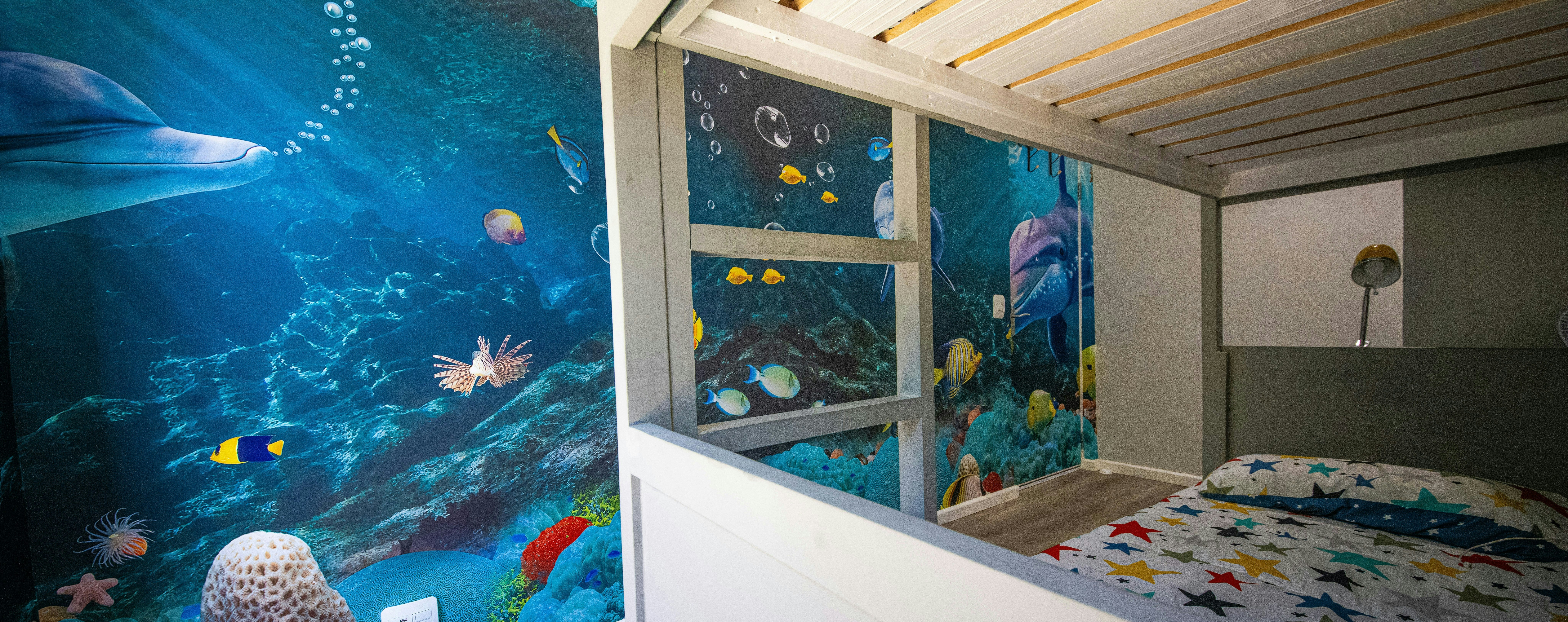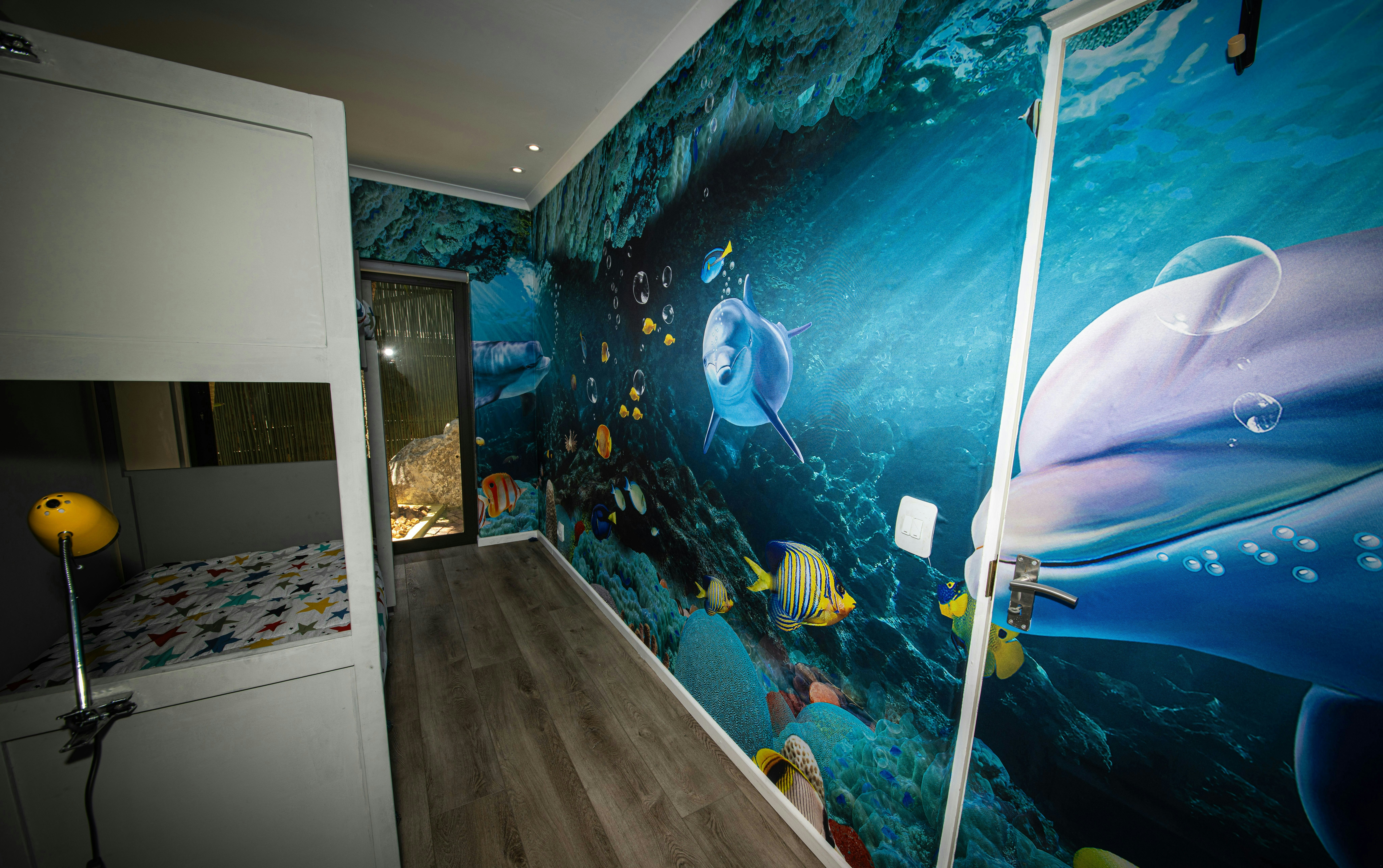 The Glass Suite sleeps 2 adults and 1 child or 2 small children. It comprises one bedroom with a queen-sized bed and 2 pop-out mattresses on the floor, a compact kitchenette, and a private deck with a Jacuzzi, exterior blinds, and spectacular ocean and mountain views, even from bed.