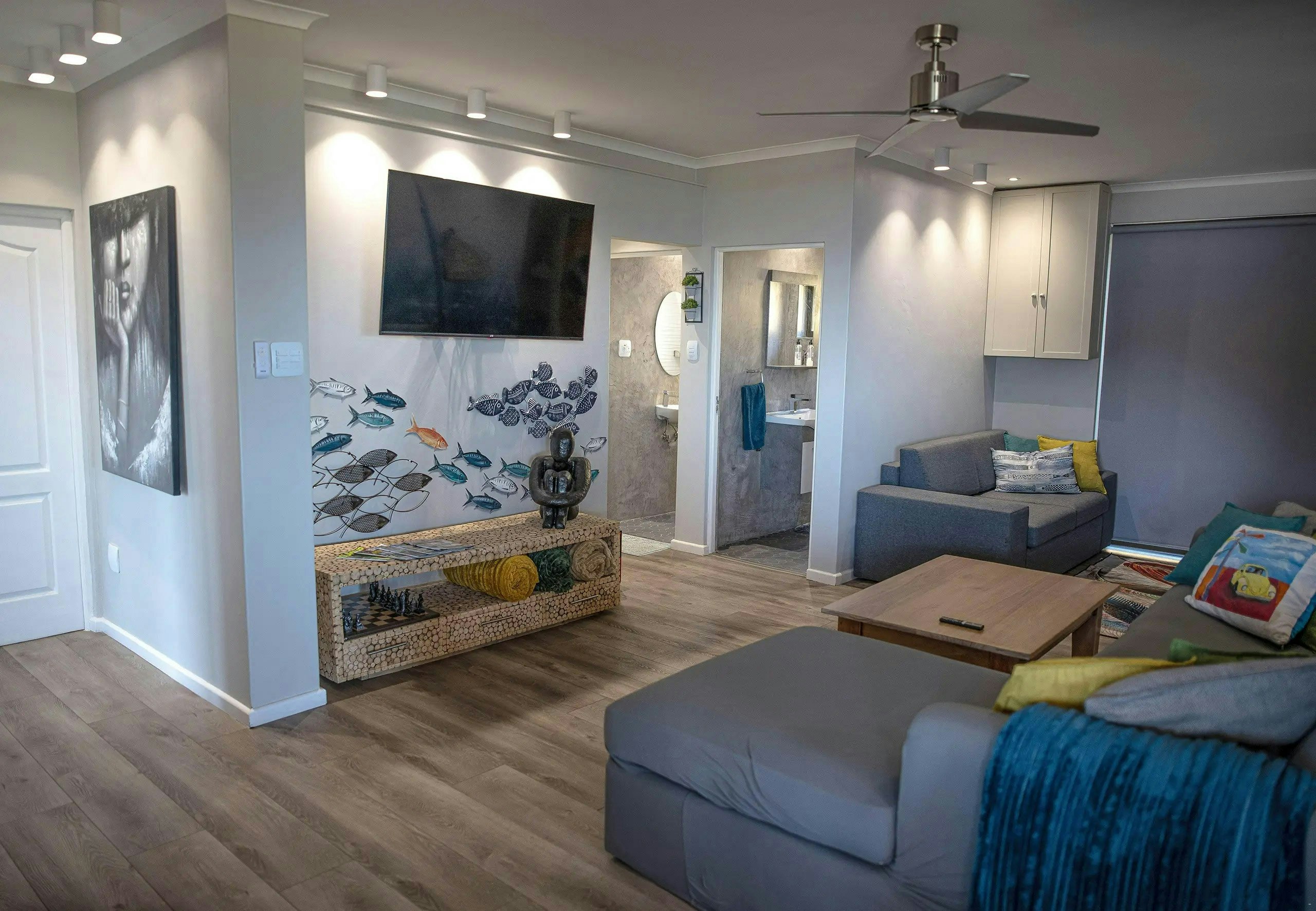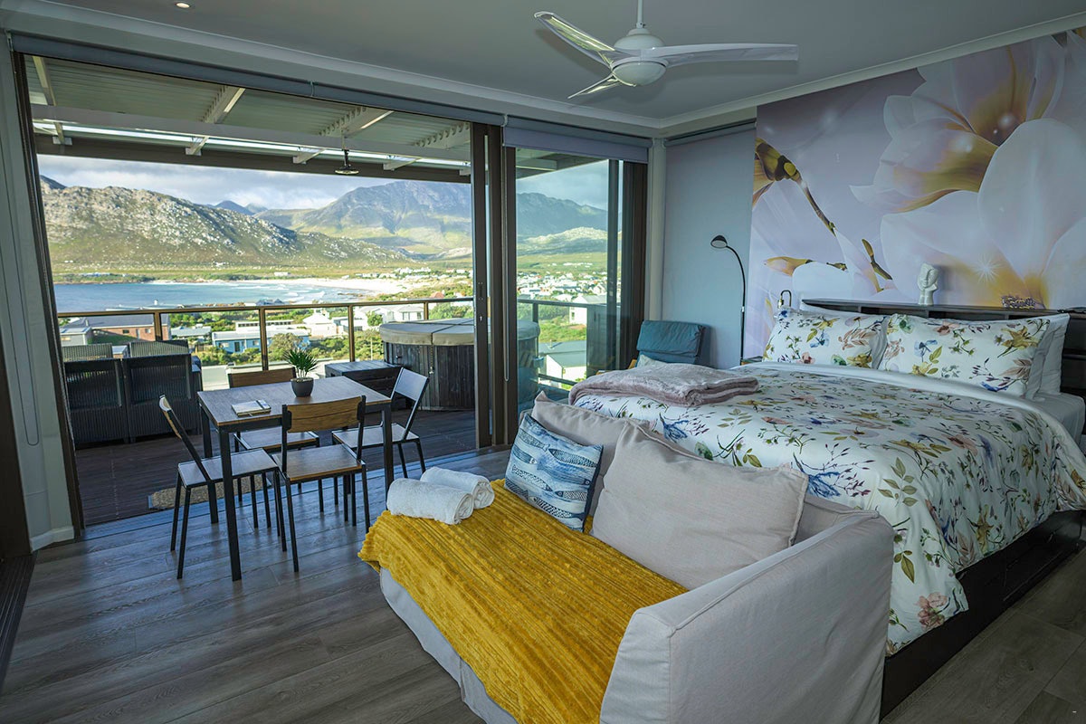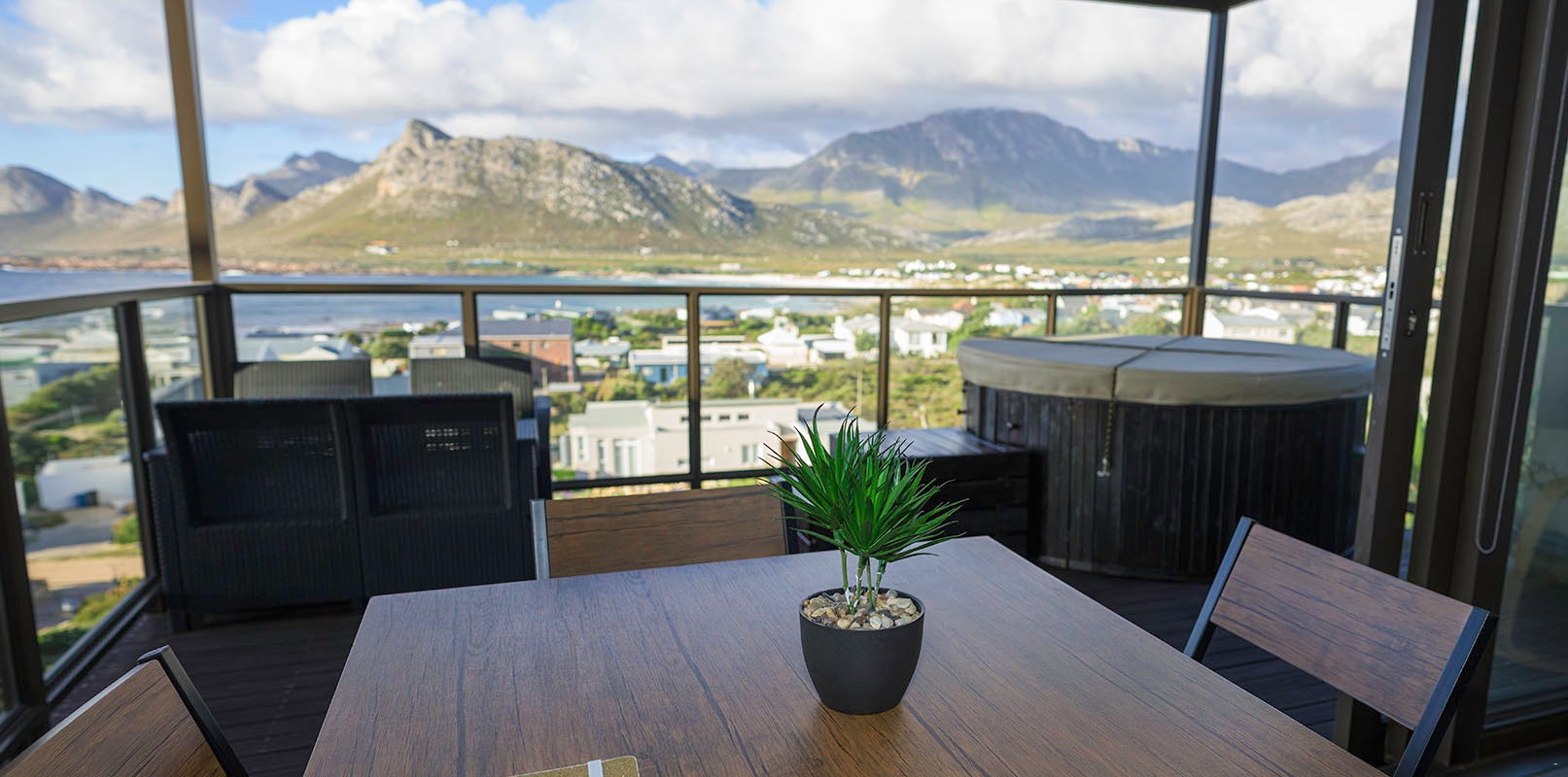 The Family Suite accommodates 6 guests in 3 bedrooms, with an additional double sleeper couch in the lounge for 2 more guests. It has 2 bathrooms, a fully equipped kitchen, an indoor fireplace, and an open-plan living area with a dining room table. The large outdoor patio has spectacular views over the Kogelberg mountains and the ocean and features a 10-person Jacuzzi, large fire pit, al-fresco lounge, exterior blinds and a gas braai/bbq.