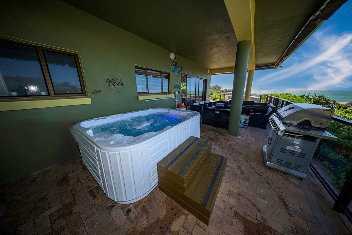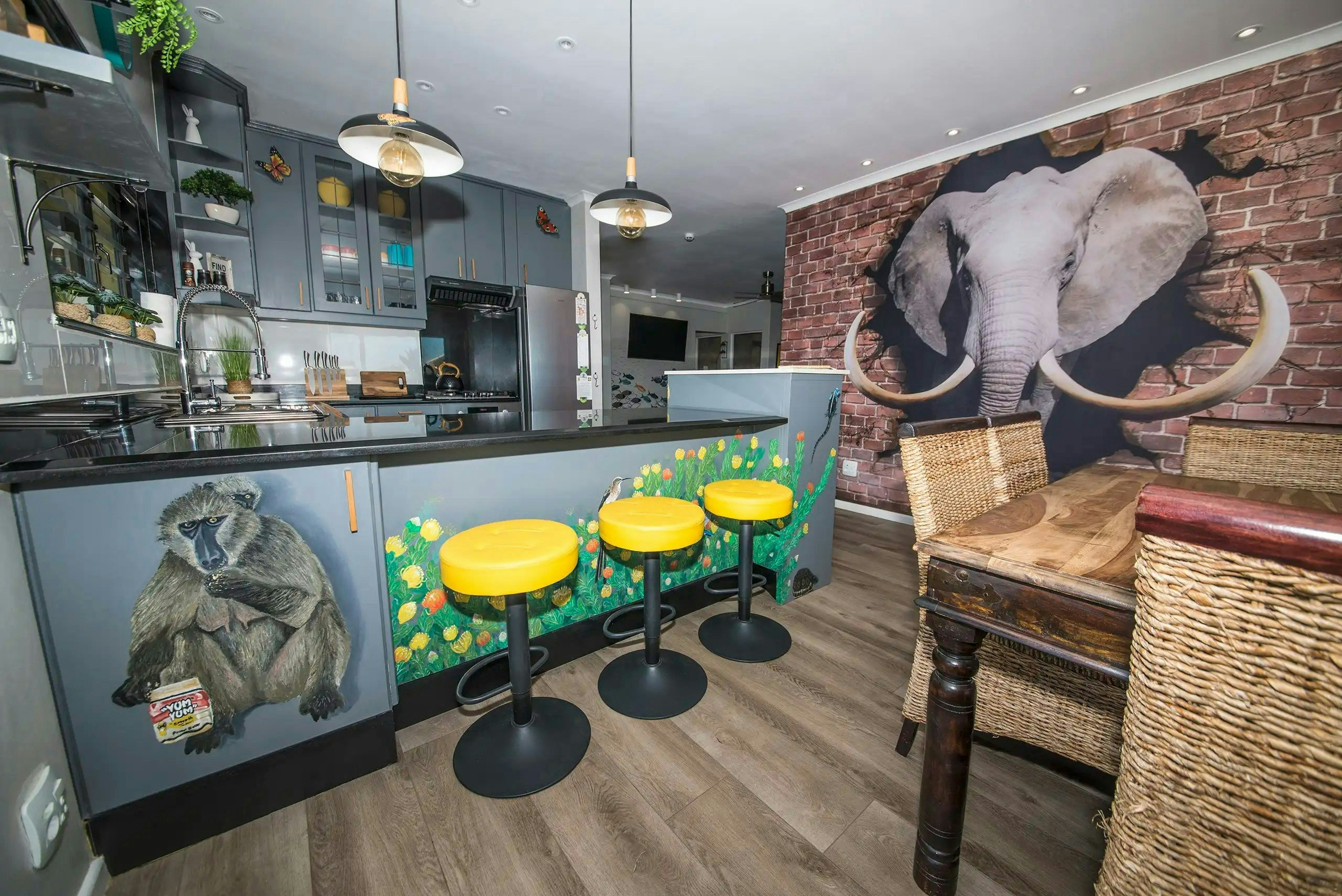 An electric fence surrounding the property ensures the baboons stay at a safe distance. Smoke and security alarm systems are installed. The top floor of the villa is reserved for private use.
