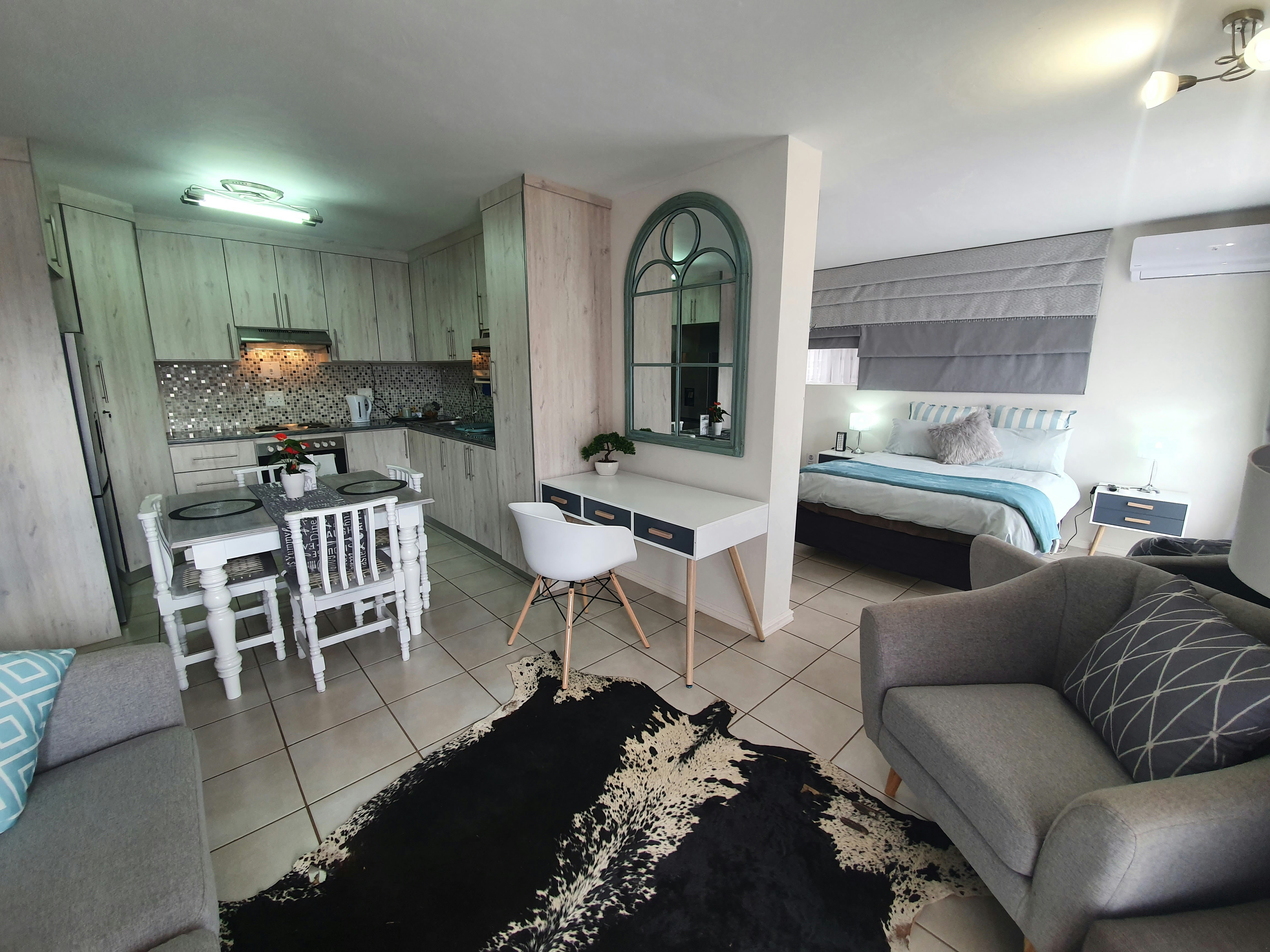 Unit 9 is a modern self-catering luxury flat that is furnished with a double bed and 2 single beds in an adjacent room. The unit has an en-suite bathroom, a full kitchen with basic appliances including a microwave, oven, stove, fridge and kettle, and an open-plan living area with a dining table and a sitting room with a Smart TV. It has a second bedroom with 2 single beds, making this unit ideal for a family of 4. This unit is next to the swimming pool and lapa with braai facilities.