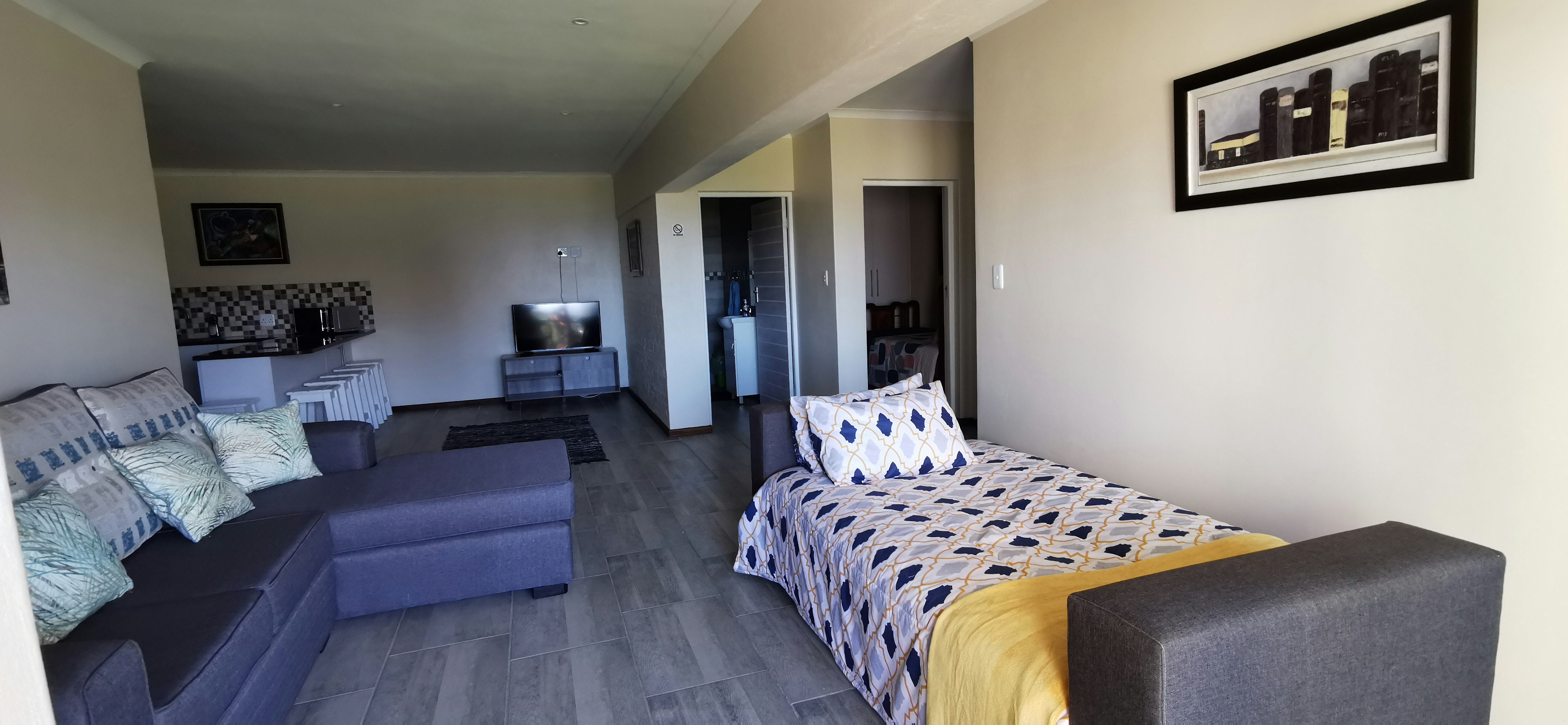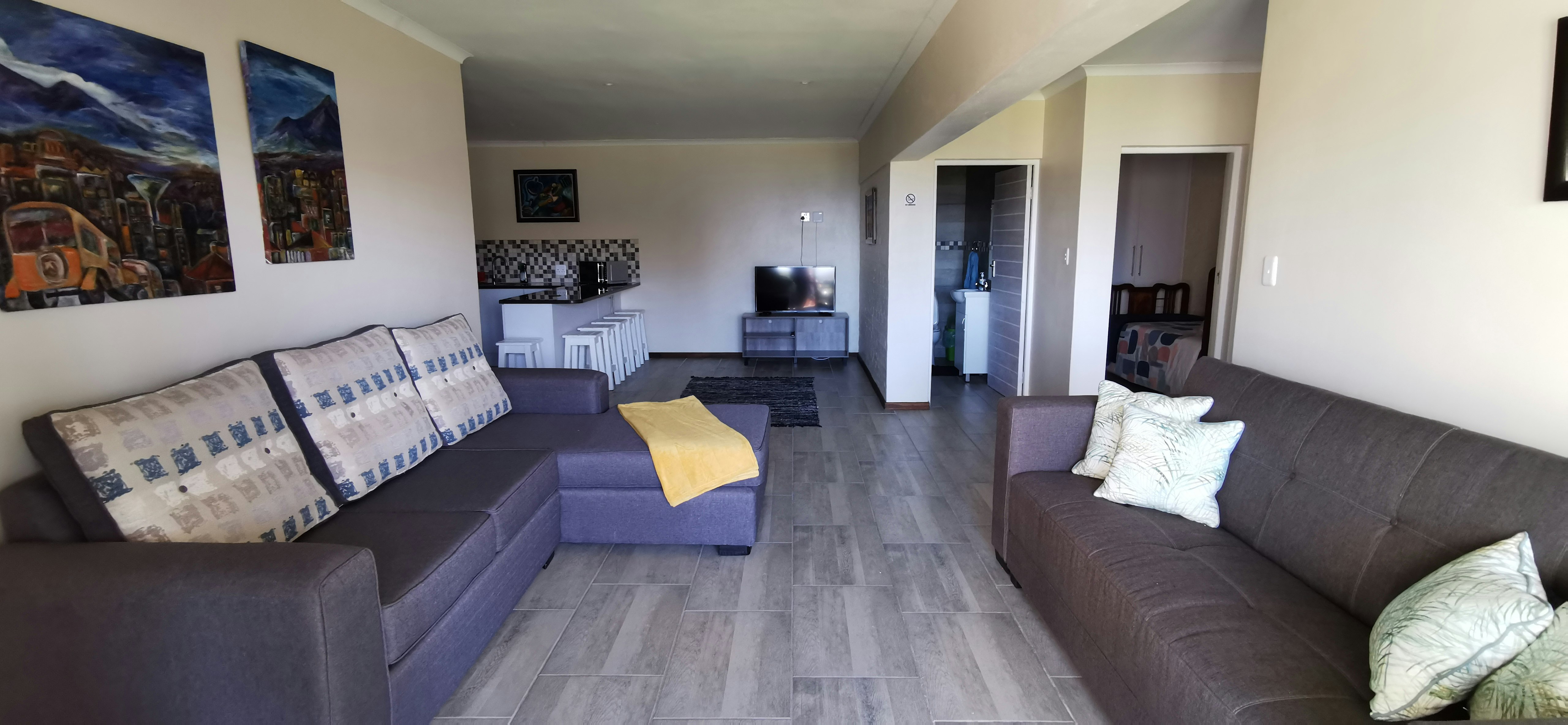 The open-plan main living area features a kitchen and a lounge space. The kitchen is fully equipped with a 2-plate stove, oven, microwave, fridge-freezer, cutlery and crockery as well as a breakfast bar with 6 stools. Leading from the kitchen is a lounge with comfortable seating, a smart TV as well as a single sleeper couch suitable for a child.