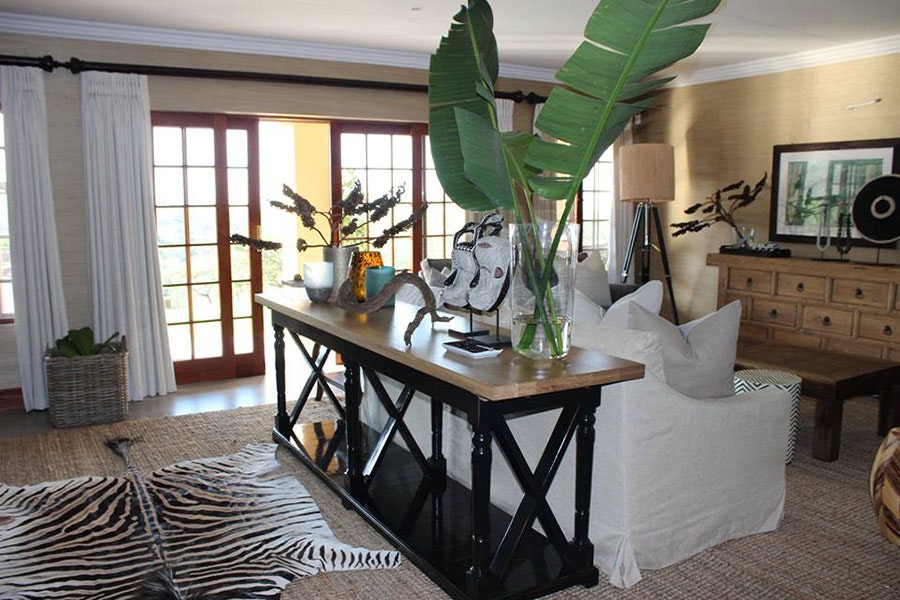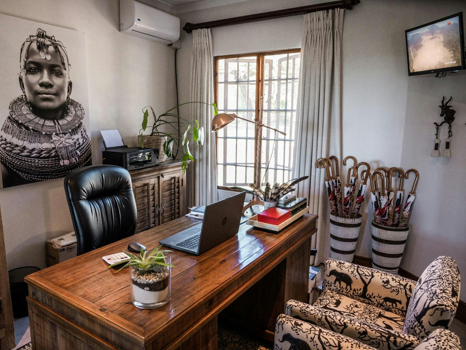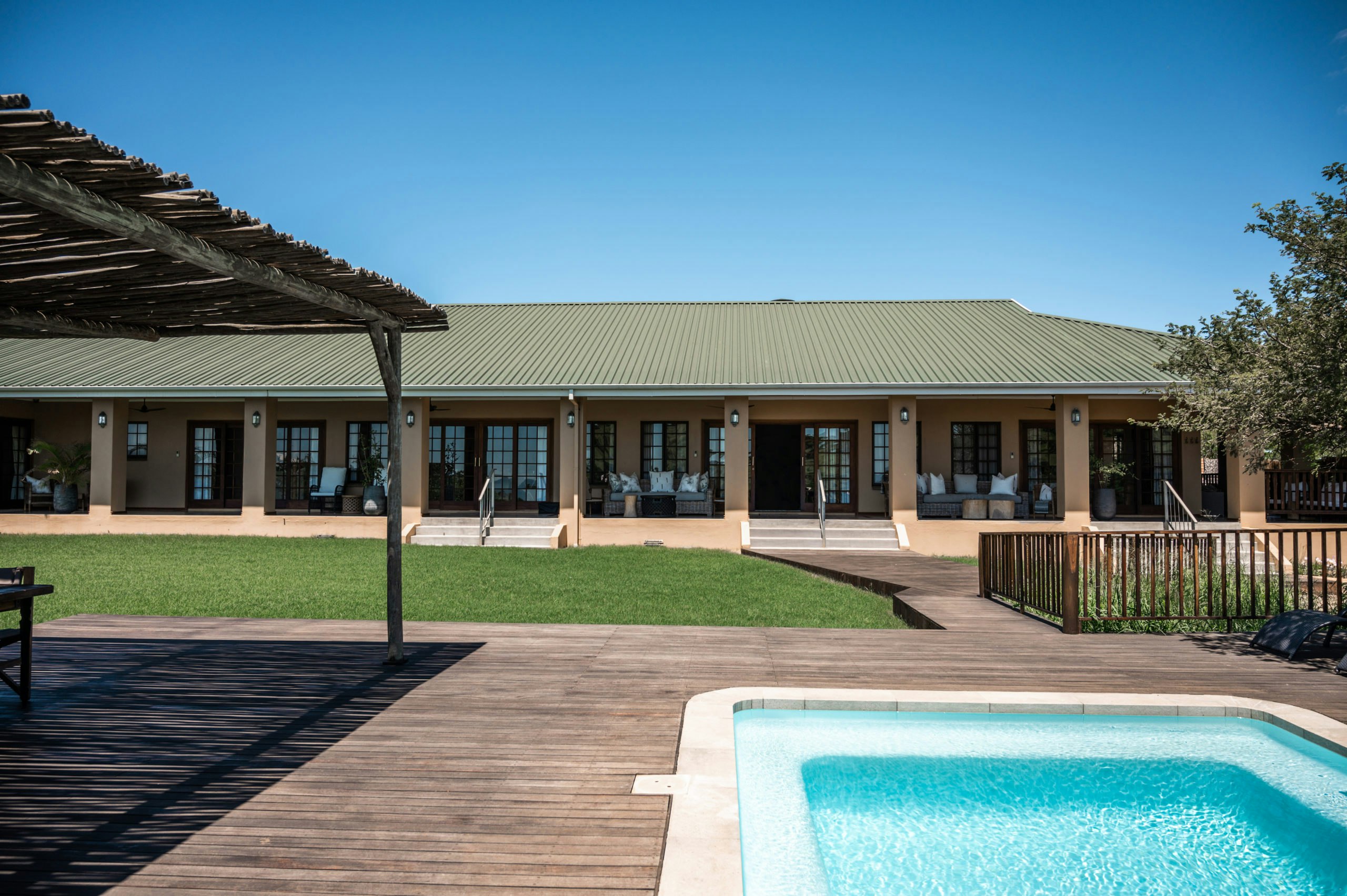 The lodge has an air-conditioned guest lounge and library with a TV with DStv, a fully licenced bar, and a spacious dining room. Wi-Fi is available in the lodge. Outside, there is a long covered patio with seating, a braai area with a fire pit, a grass lawn for children to play on, and a lovely swimming pool deck that has a covered area with seating.