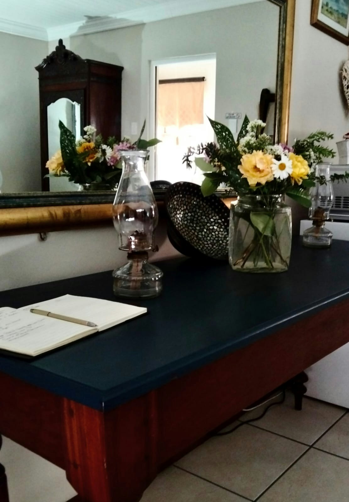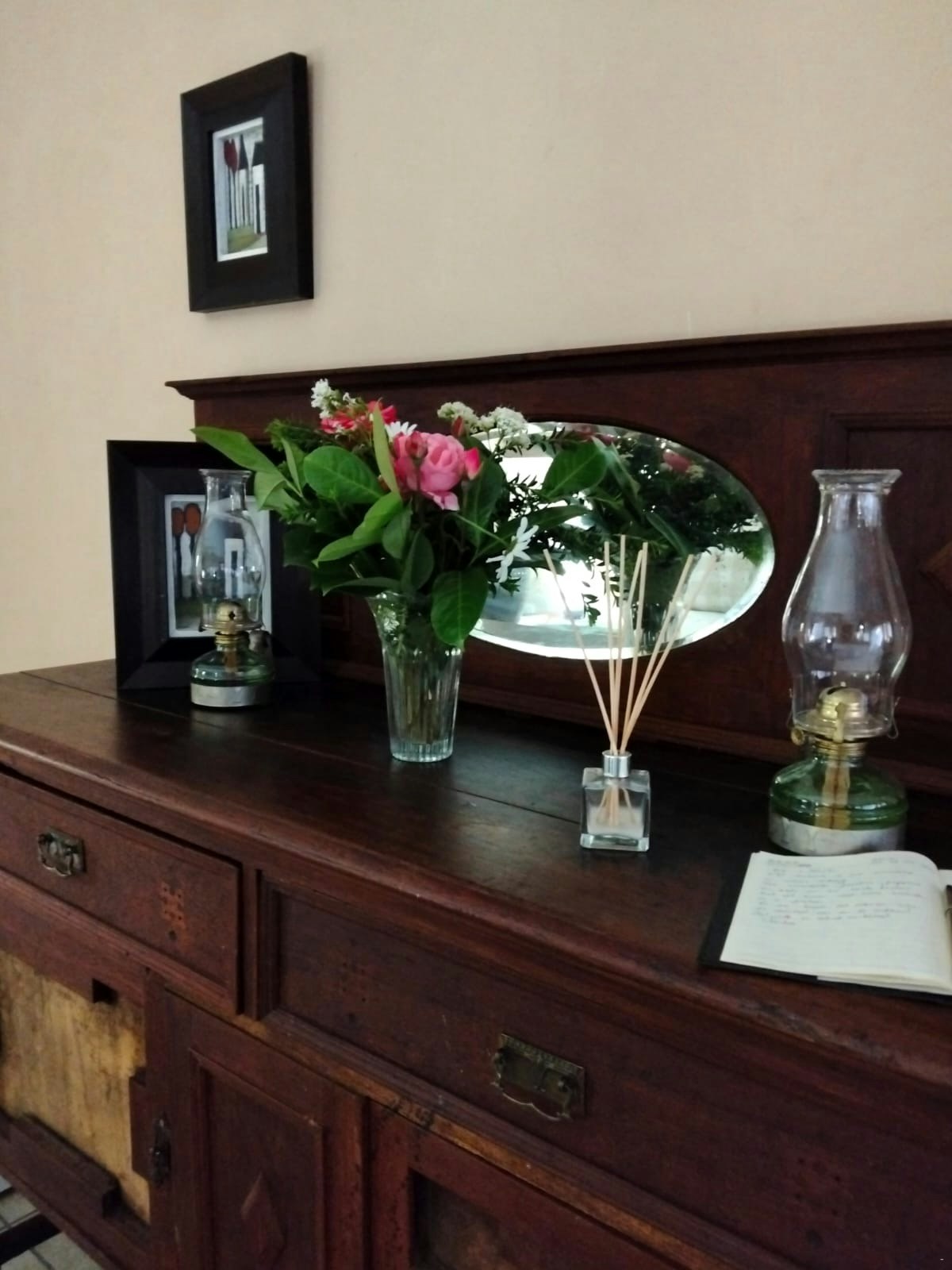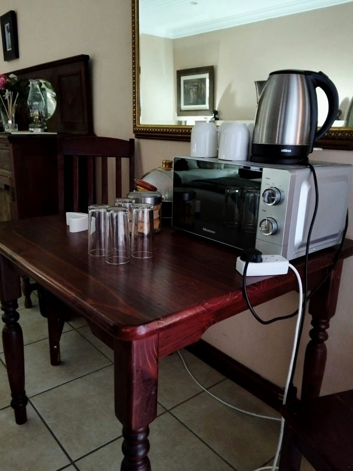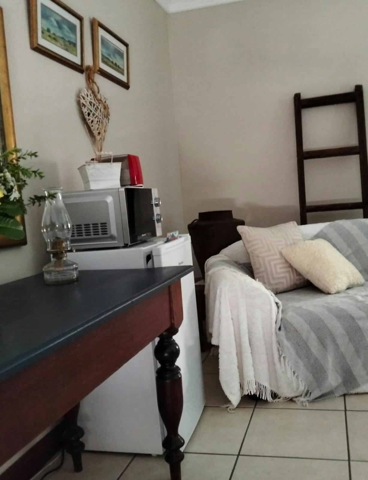 The living area includes a lounge with a TV, Smart Box, and Netflix. A central air-conditioning unit in the lounge circulates throughout the cottage. The open-plan layout consists of a kitchen, lounge, and dining area. The kitchen is well equipped for self-catering with a gas stove, oven, microwave, fridge, and washing machine. The dining area seats 6 guests, and the lounge is furnished with charming pieces and original paintings, creating a distinct Victorian atmosphere. The cottage also features beautifully restored wooden floors throughout.