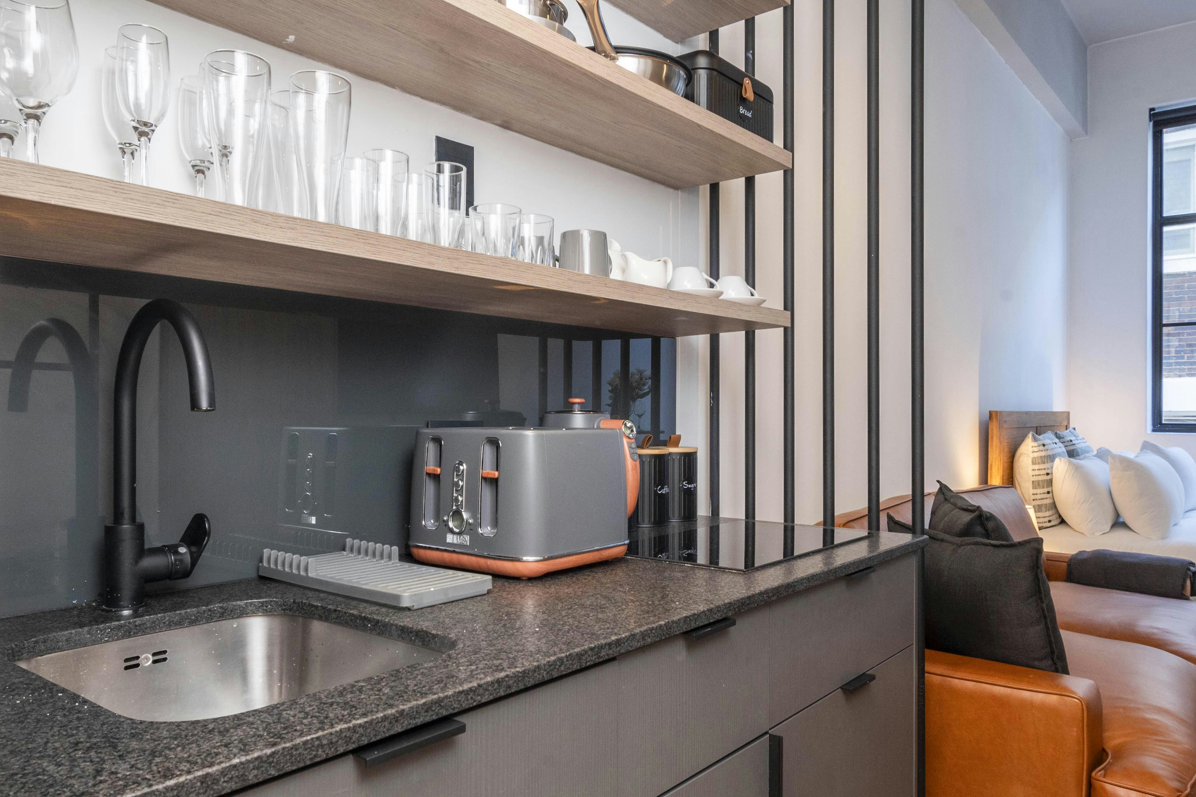 The living area offers cosy seating and a TV with streaming services, creating a perfect space to unwind. The kitchenette includes a fridge-freezer, induction stove, oven, microwave, and coffee- and tea-making facilities. Guests also have access to communal areas within the building, and a 24/7 concierge is available to assist with any needs during their stay.