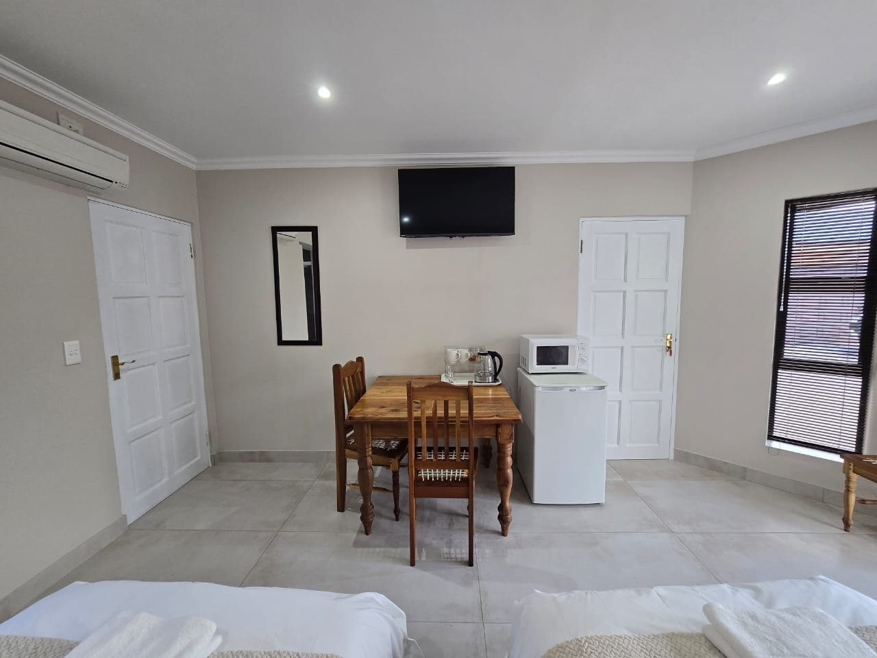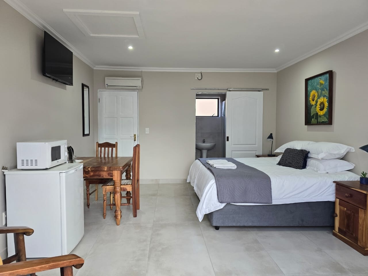 Die gastehuis bied 3 slaapkamers met lugversorging, elk met slaapplek vir 2 gaste. Elke kamer het 'n en suite-badkamer, 'n slim-TV met DStv en Netflix, 'n yskassie, 'n mikrogolfoond en tee- en koffiemaakgeriewe.