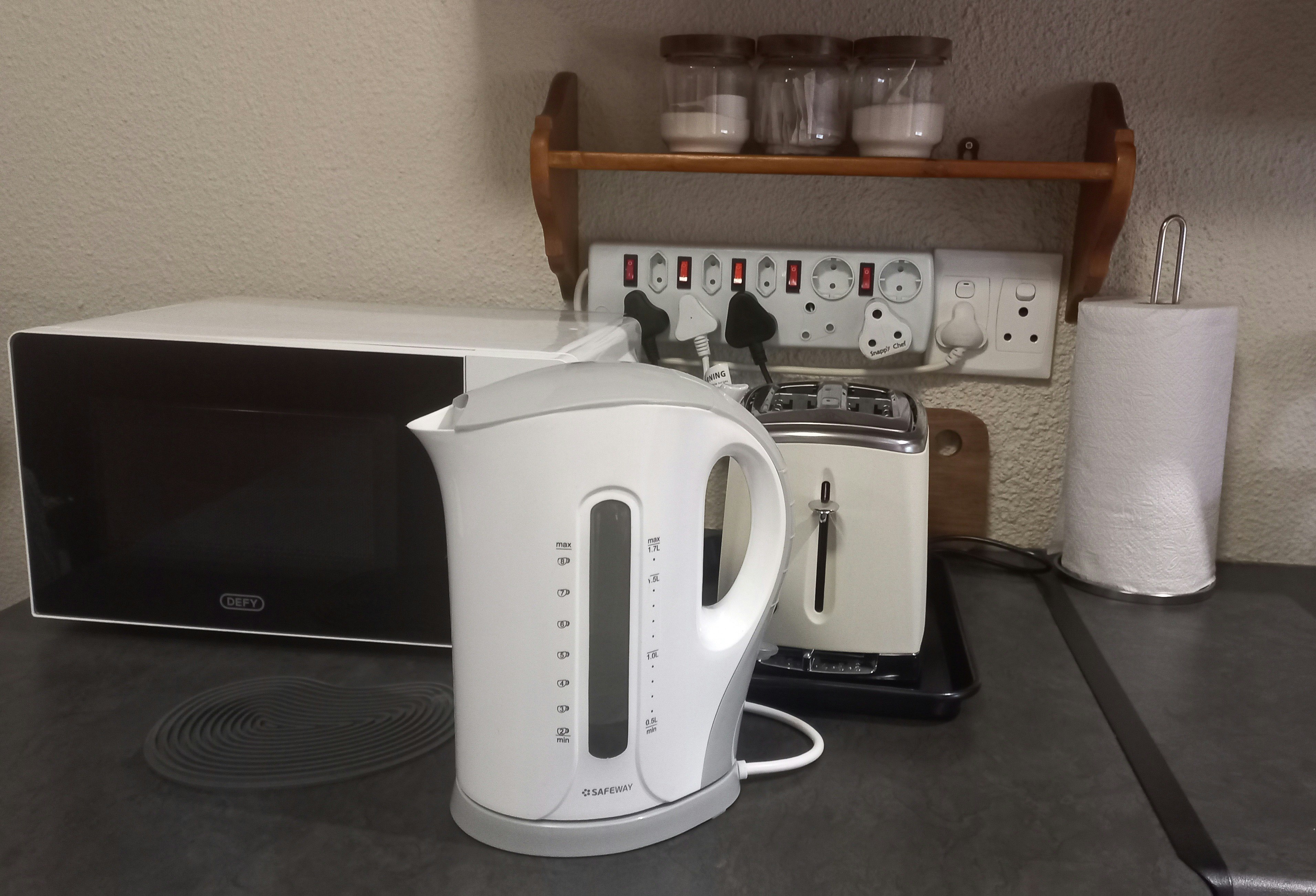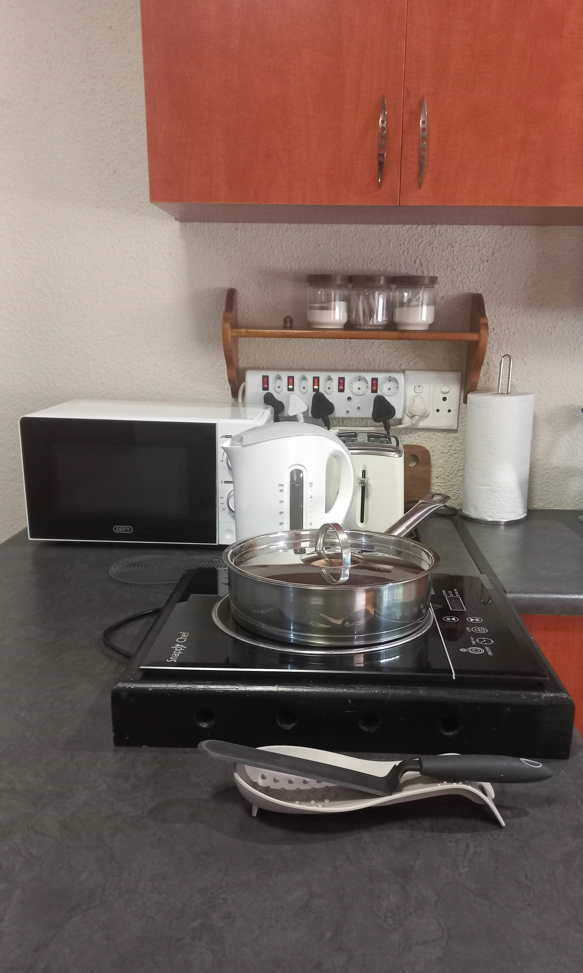 The living area features a fully equipped kitchenette with an induction stove-top, microwave, fridge-freezer, cutlery, crockery, and tea- and coffee-making facilities, as well as a breakfast bar with a stool. The apartment is well equipped for longer stays. Adjacent to the kitchen is a cosy seat, perfect for unwinding after a day of exploring. Free Wi-Fi is available.