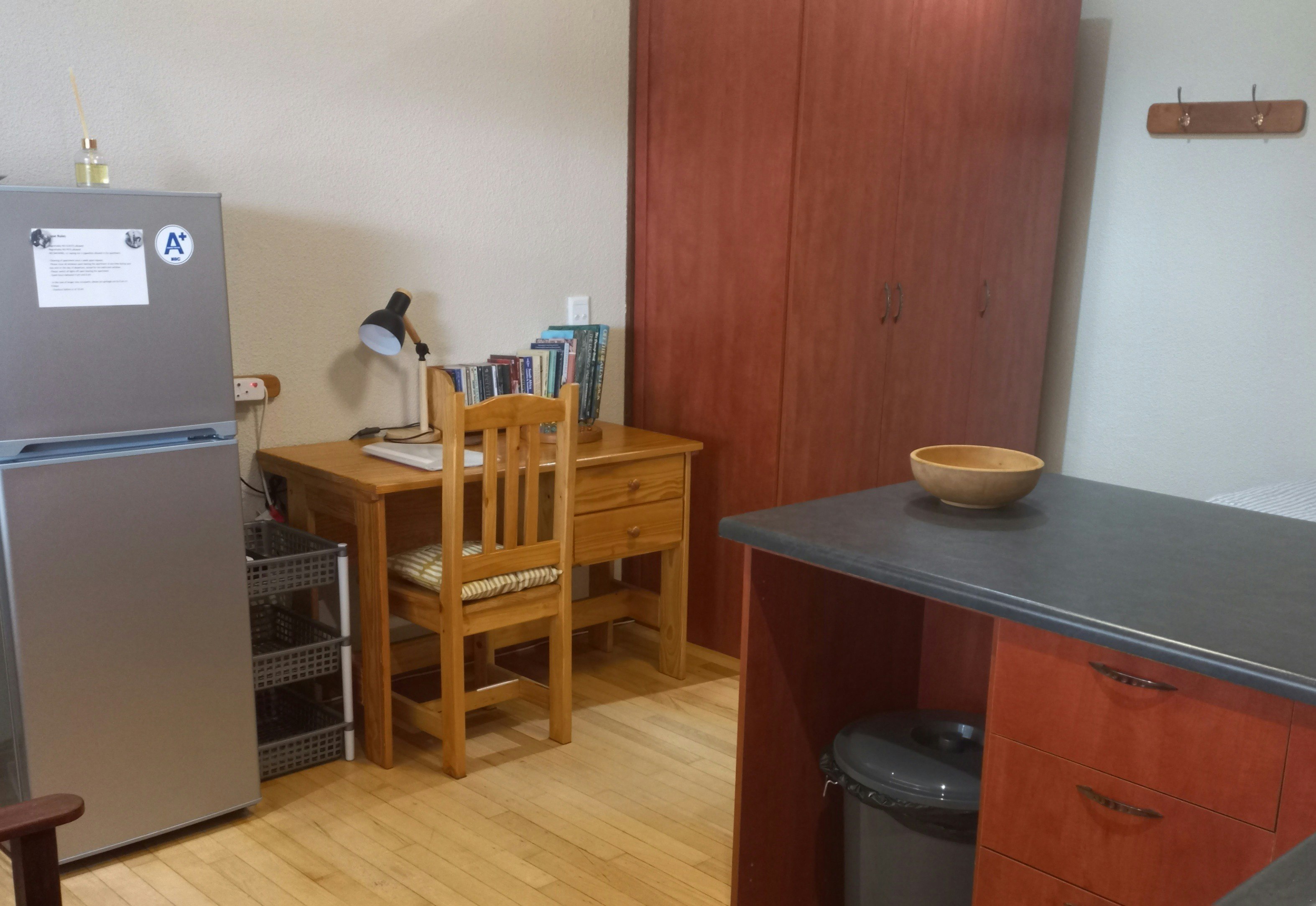 The unit features a dedicated work or study corner, making it ideally suited for guests attending conferences or classes.