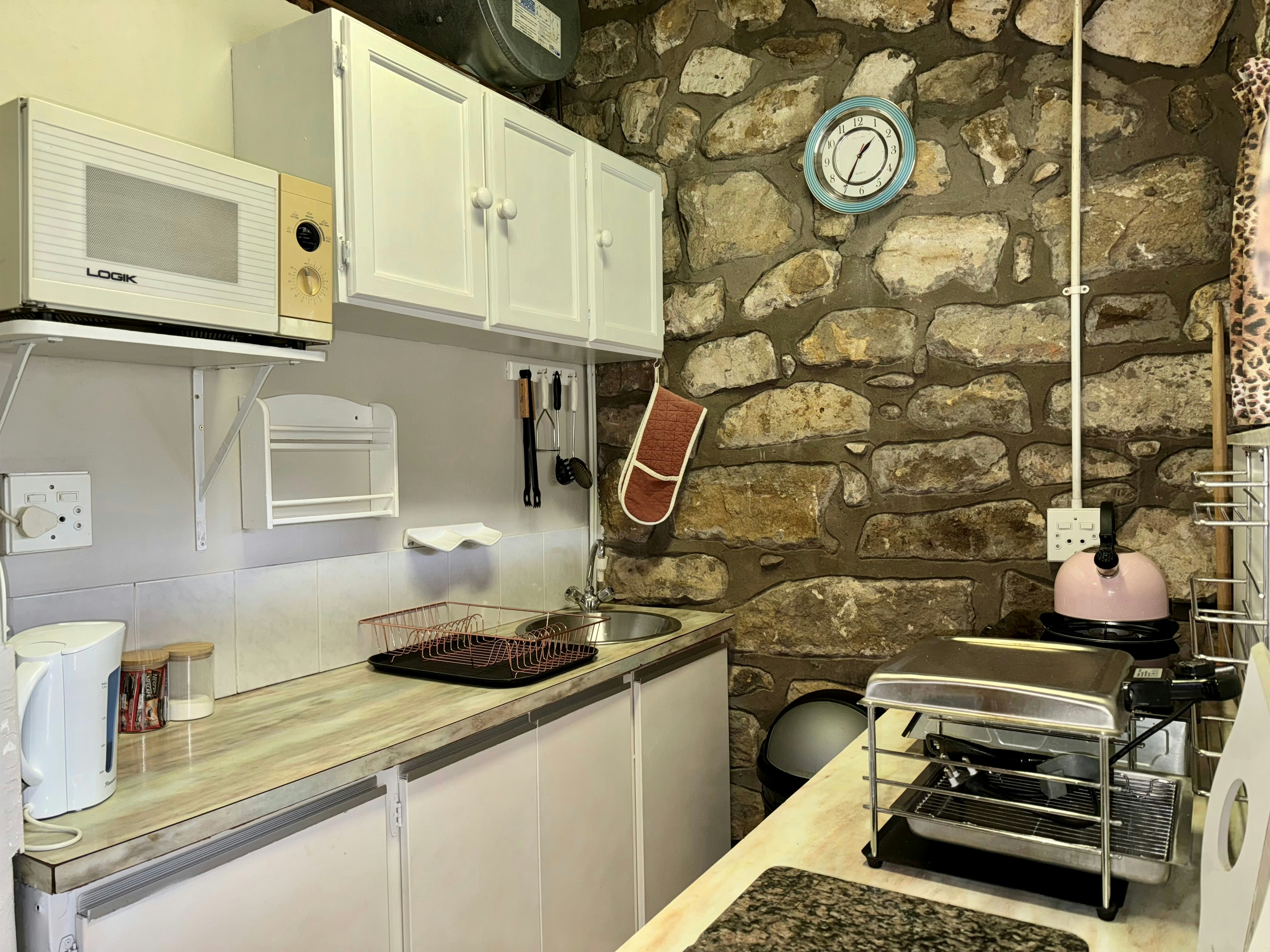 Die oopplan-leefarea beskik oor 'n kombuis met 'n gasstoof, roosterplaat, mikrogolf, yskassie, broodrooster, ketel, eetgerei en breekware. Die kombuis lei na 'n etenstafel met sitplek vir 4.
