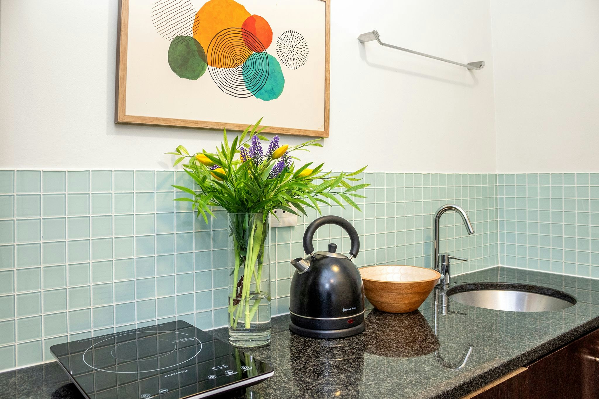 The unit also includes a well-equipped kitchenette, complete with an induction hob, microwave, kettle, and fridge-freezer. Guests can enjoy complimentary Wi-Fi throughout the apartment.