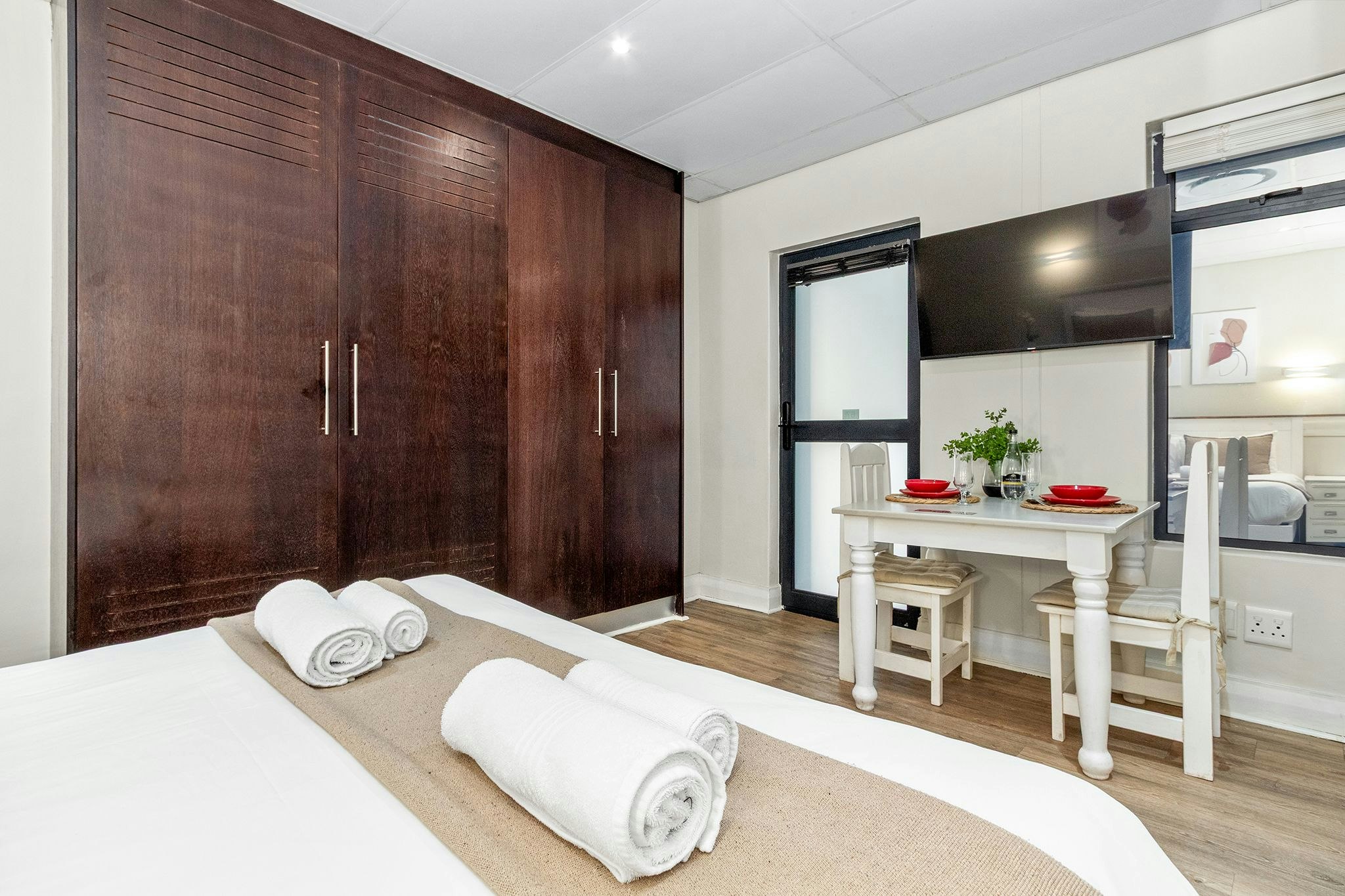 The apartment accommodates 2 guests and comprises 1 bedroom and 1 bathroom. The bedroom is furnished with a comfortable queen-size bed, a smart TV with streaming services, and a 2-seater dining table. The bathroom is fitted with a shower, toilet, and washbasin. Linen and bath towels are provided.
