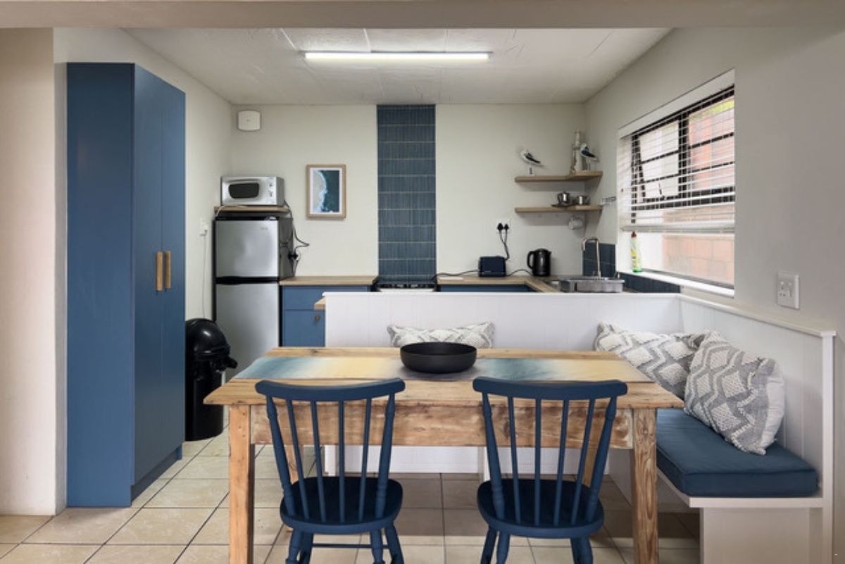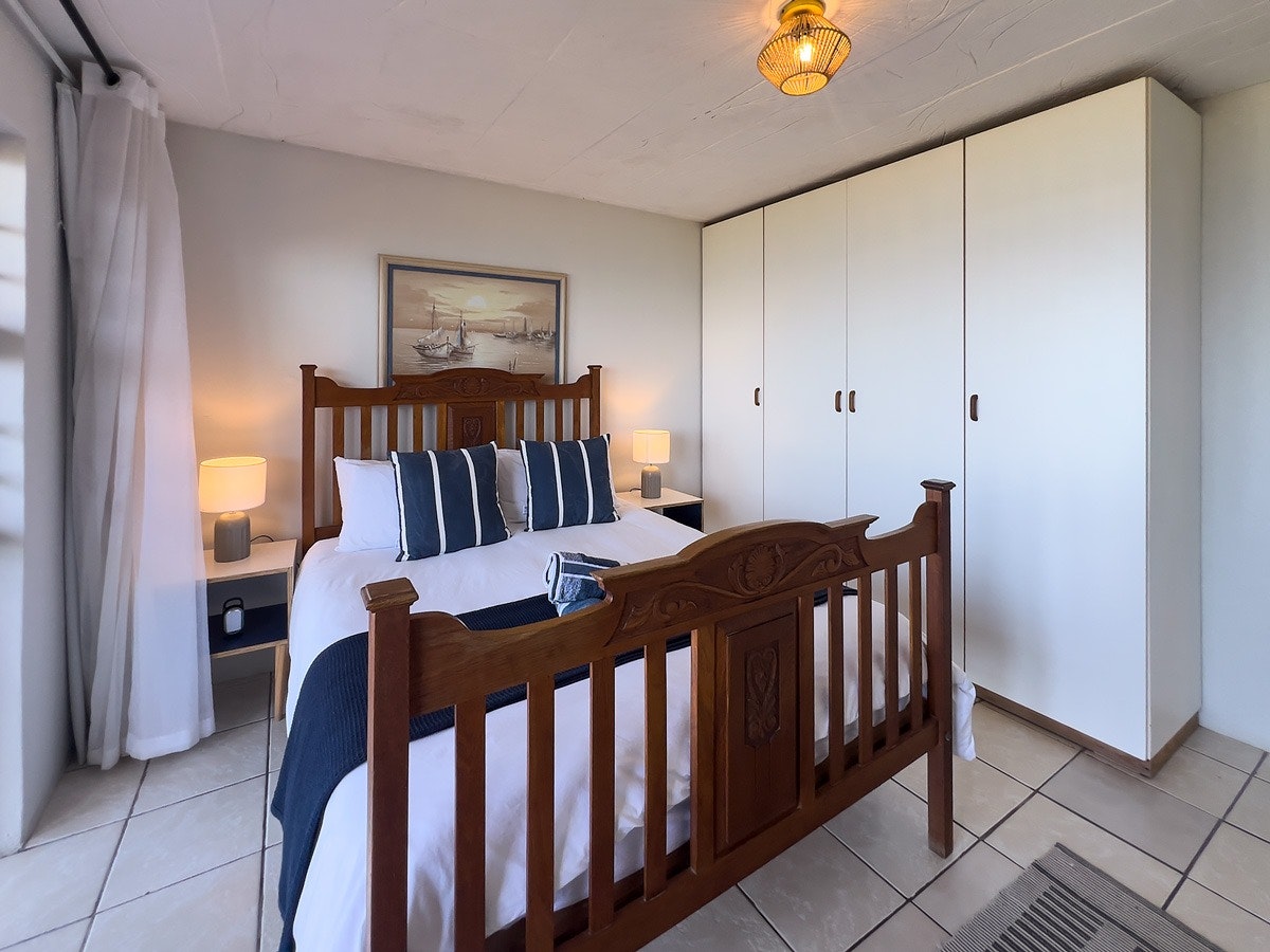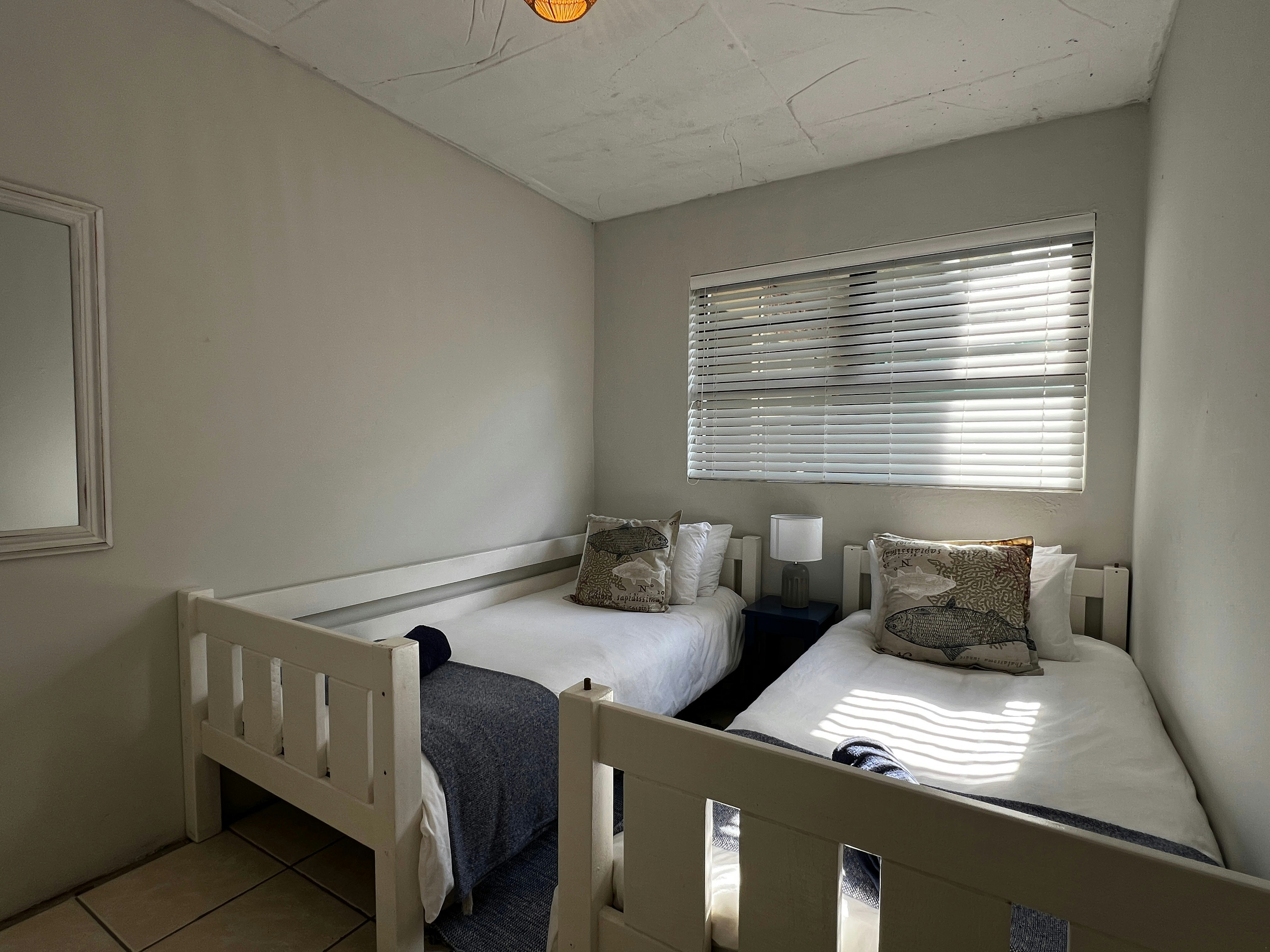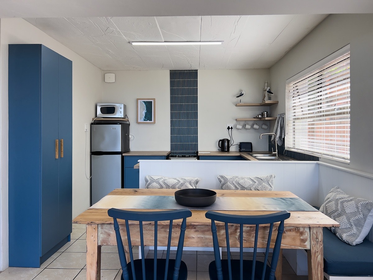 The open-plan kitchen is equipped with a fridge-freezer, gas stove, oven, microwave, cutlery and crockery, tea- and coffee-making facilities and a breakfast bar with stools. The cosy living room is furnished with comfortable seating and a TV with streaming services. The room opens onto a patio with outdoor furniture and a built-in braai and it overlooks the ocean.