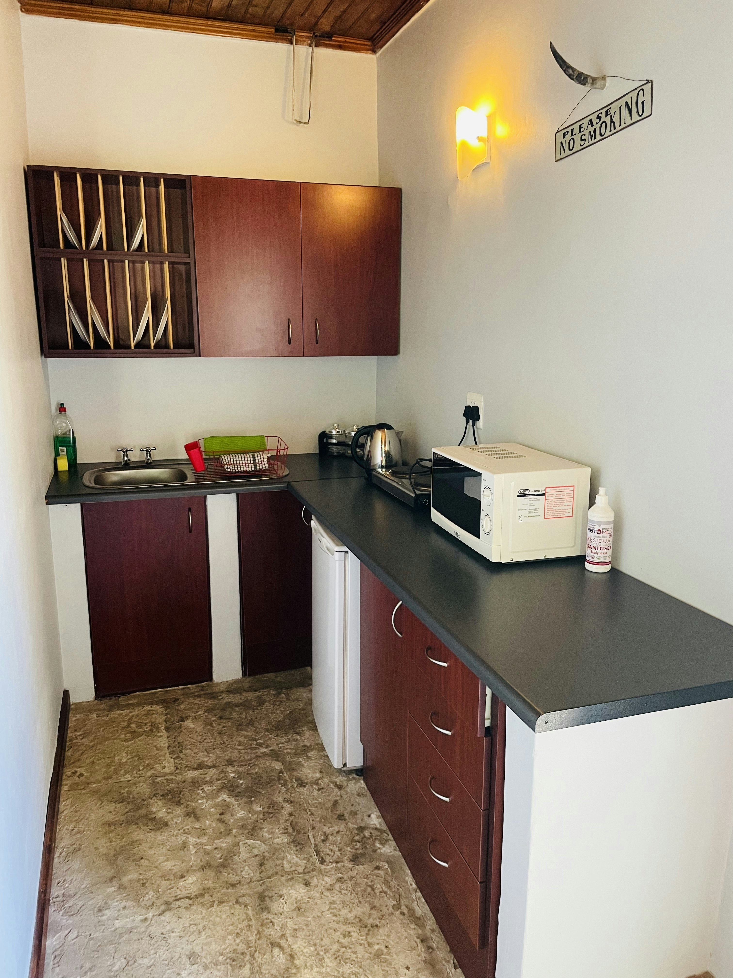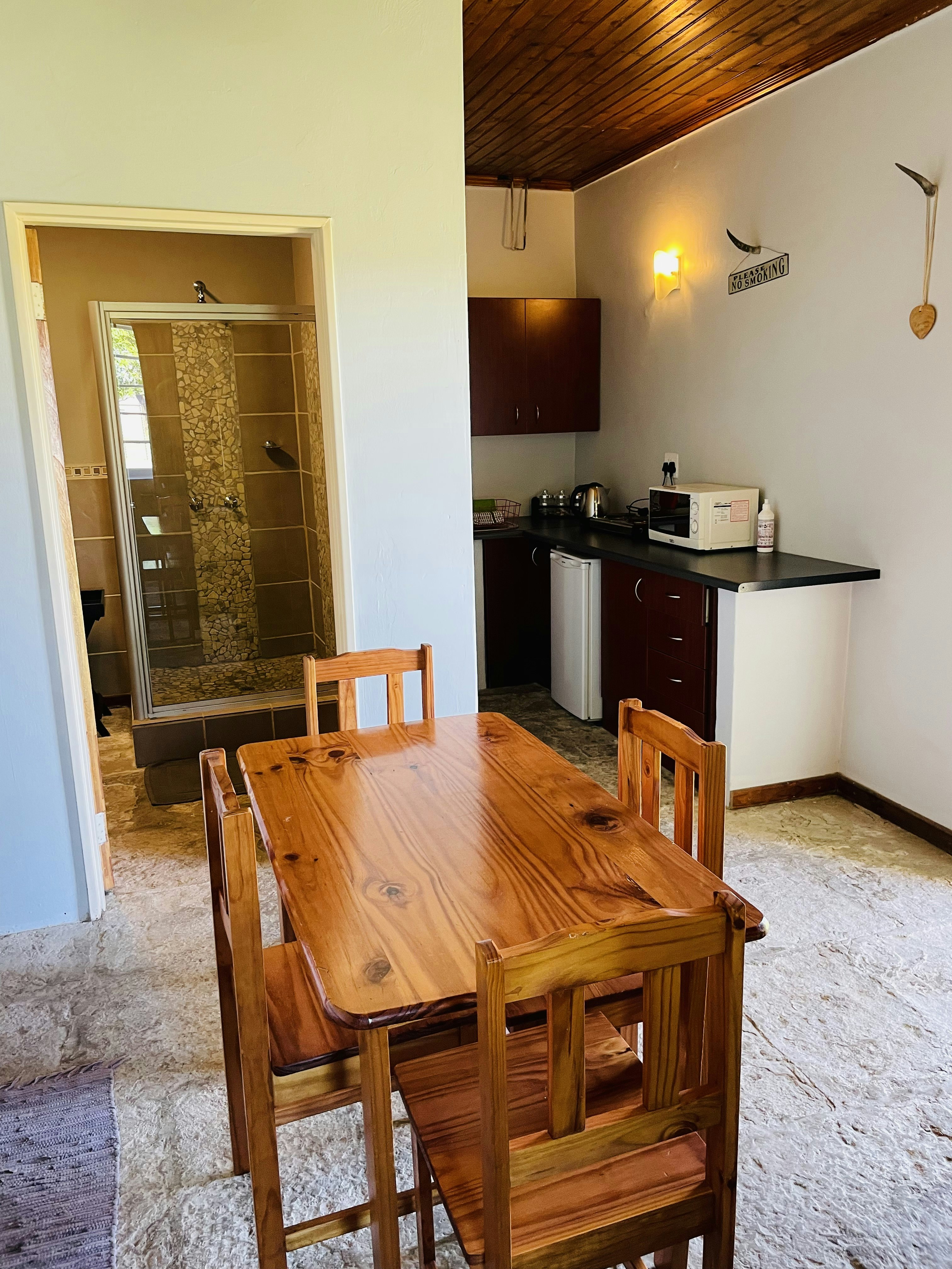 The self-catering cottage sleeps 3-4 people in an open-plan bedroom, with a double bed, a single bed. An extra bed can be provided.. The unit features a fully equipped kitchenette, a bathroom with a toilet and shower and an outdoor braai area. Dinner and breakfast can be arranged on request. There is easy view TV, guests are welcome to bring their own DStv card.