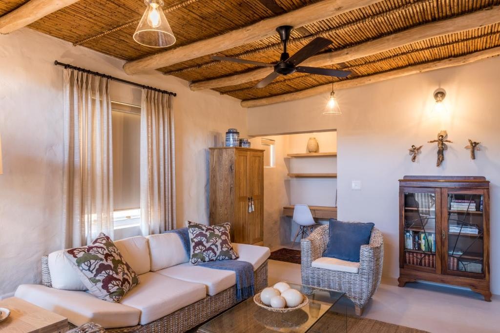 The Karoo-style Elfen House comprises 2 air-conditioned bedrooms and 2 bathrooms. Amenities include a flat-screen TV with DStv channels, Wi-Fi internet access, and a wood-burning combustion stove for use in winter. The delightful courtyard, complete with a pool, braai facility, outdoor shower, and daybed, is the perfect spot to relax and enjoy leisurely days in the Karoo.
