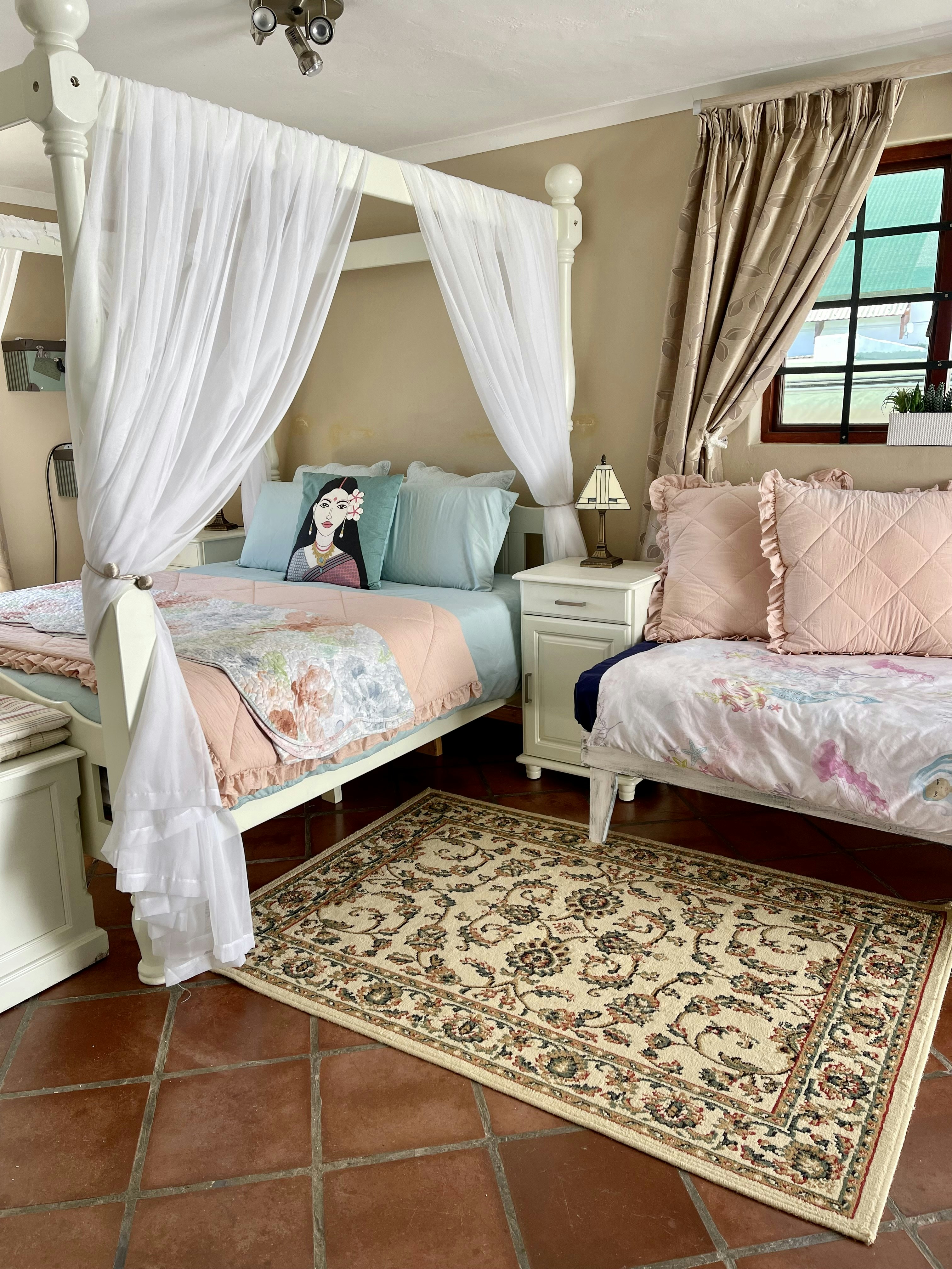 The self-catering apartment can comfortably accommodate 2 adults and 1 child and comes equipped with a common area and en-suite bathroom. The common area features a queen-size bed and a child mattress. The en-suite bathroom is fitted with a shower, toilet, and wash basin. The apartment boasts an open-plan layout and includes a dining table and a kitchenette. The kitchenette is equipped with a fridge, microwave, and kettle. Guests can enjoy a meal at the 2-seater dining table.