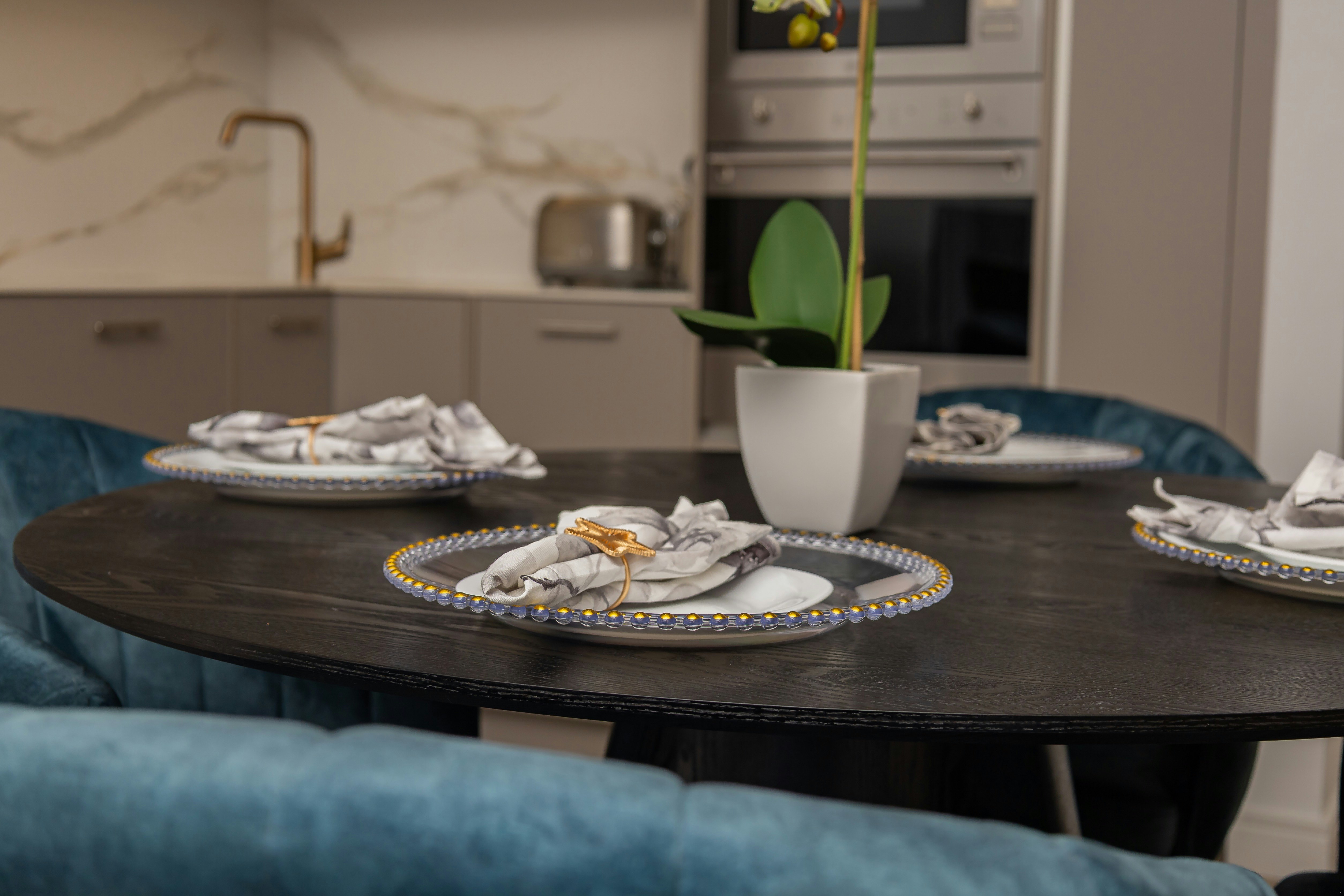 The kitchen is fitted for self-catering and includes a stove, oven, fridge-freezer, microwave, cutlery, and crockery. The living area features comfortable seating, a dining table, and a TV.