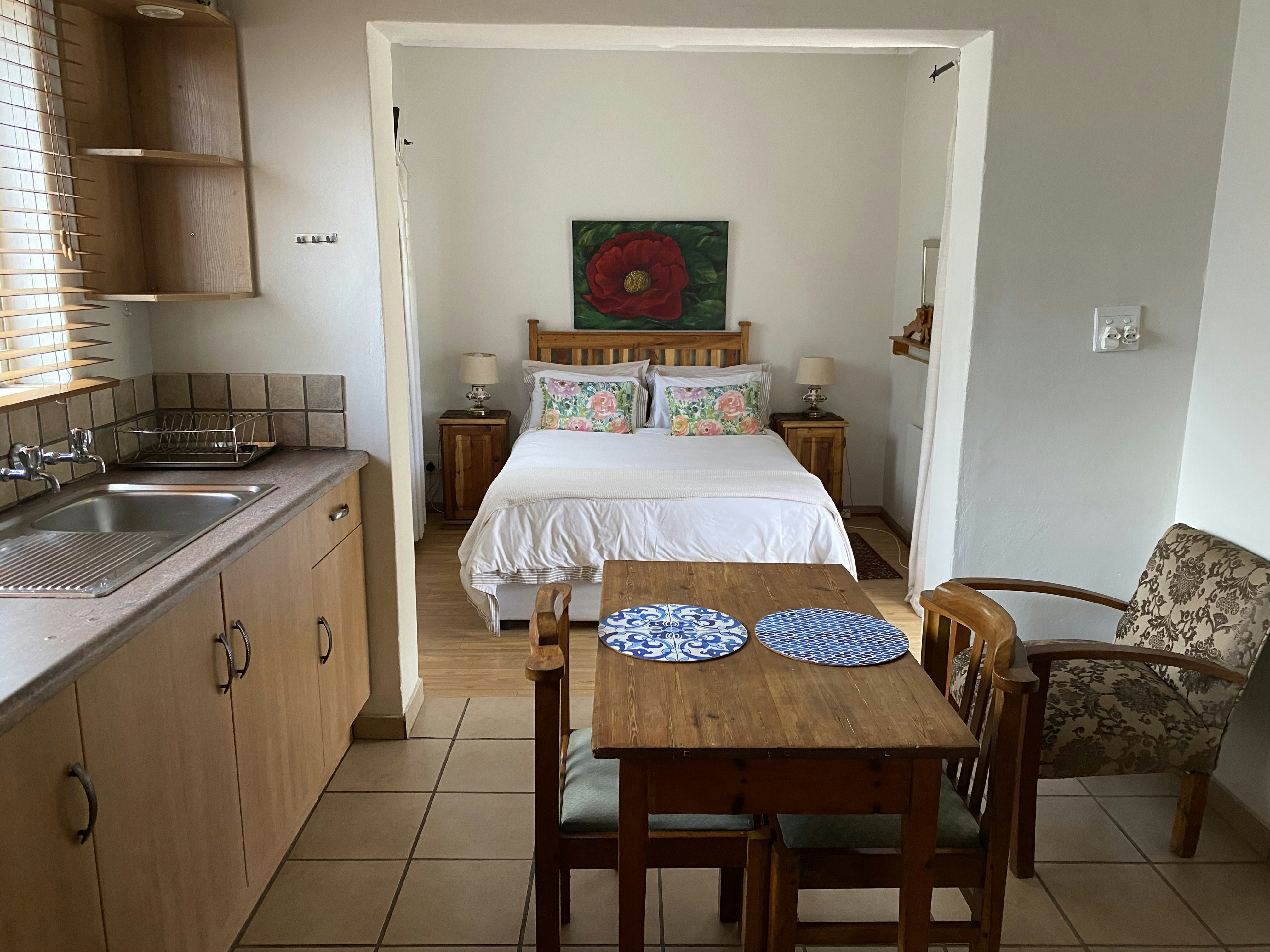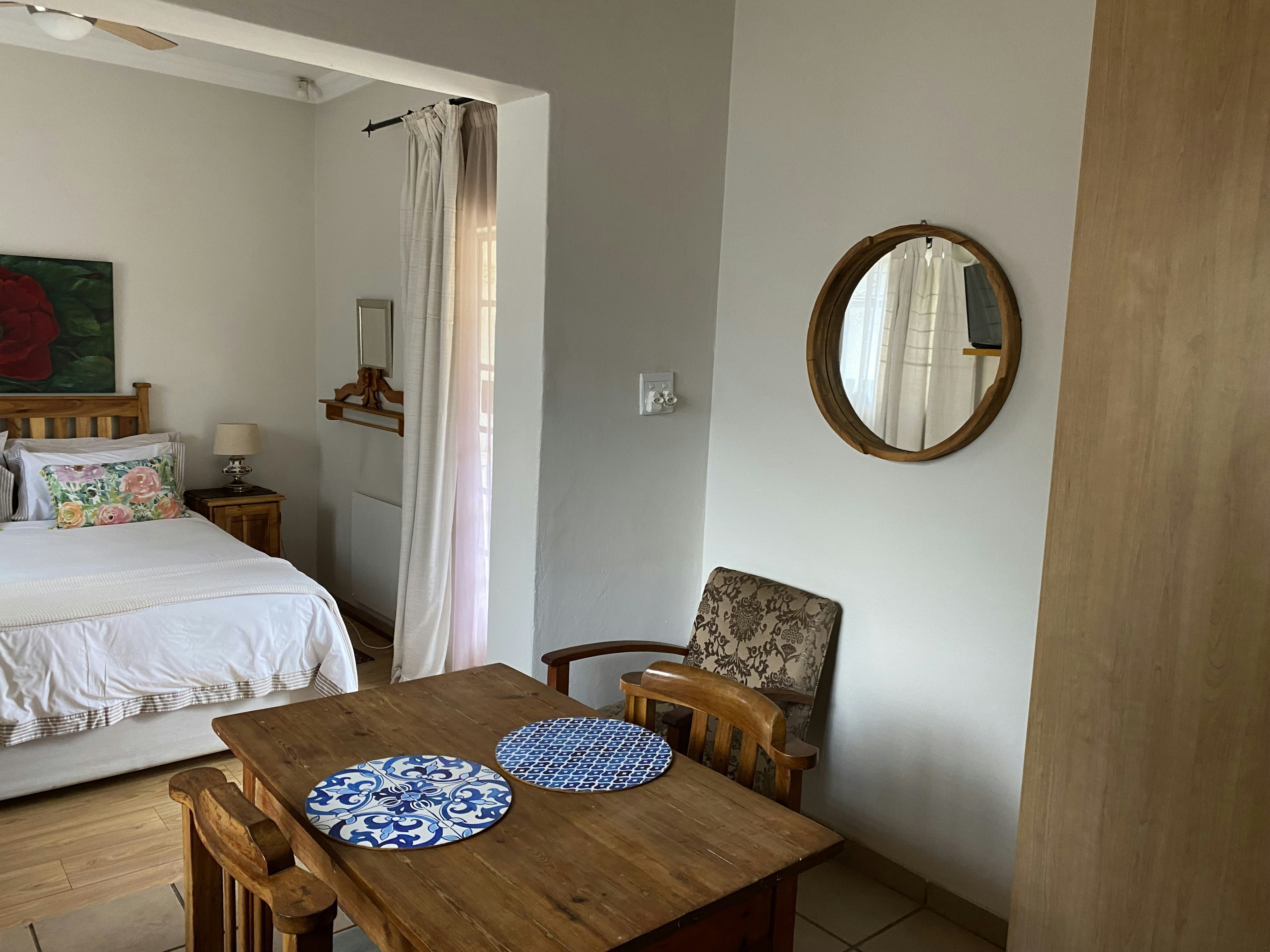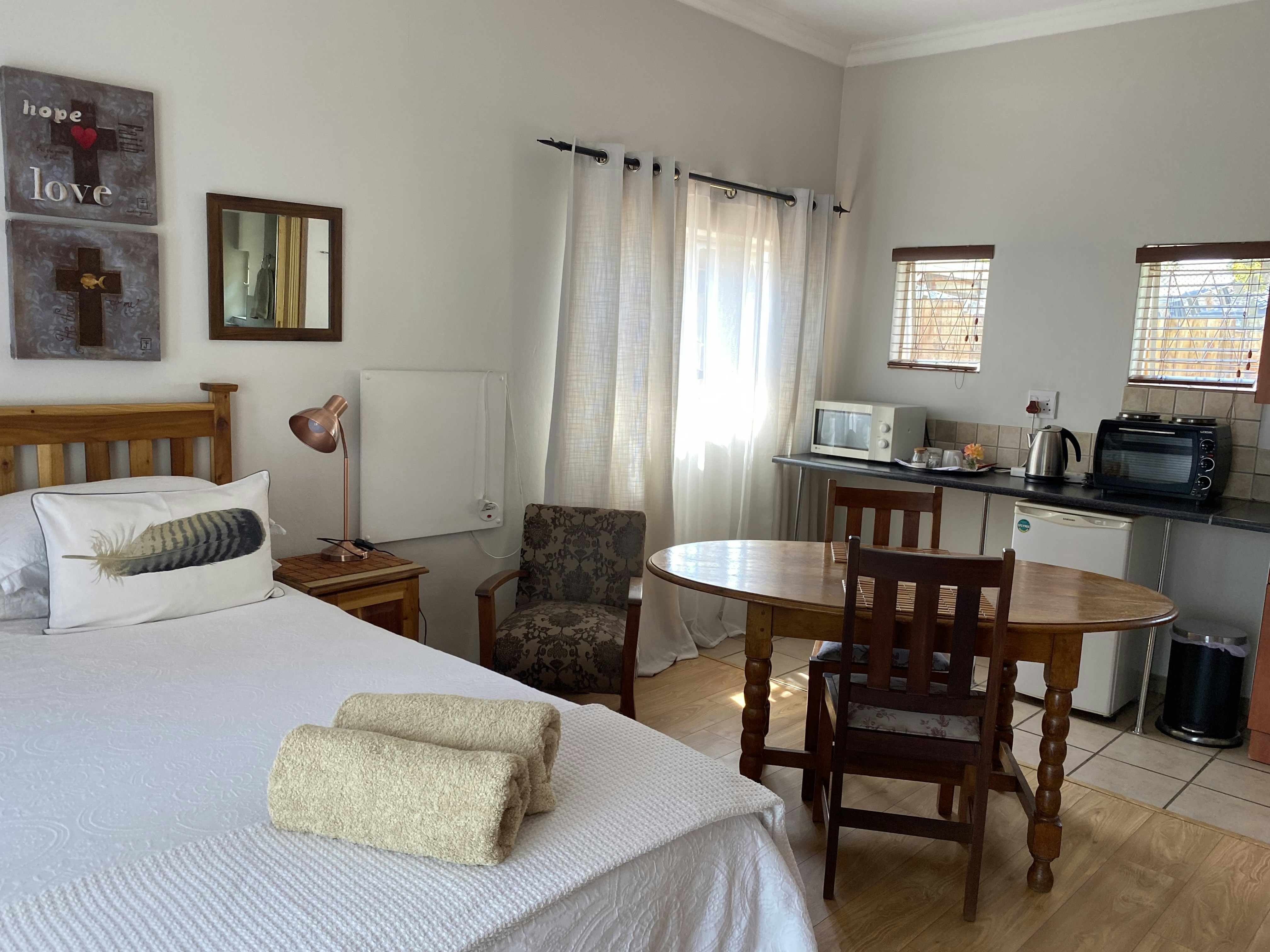 Accommodation is offered in 2 self-catering units that are located in a lush, well-established suburb. Each unit comprises a spacious bedroom with a queen-size extra-length bed, and en-suite bathroom that is fitted with a shower only and an open-plan, kitchenette equipped with an air fryer, microwave and bar fridge. Quality linen and TVs with the full DStv bouquet are provided. Free Wi-fi is available. Elverams has solar energy therefore there are fewer restrictions during loadshedding.