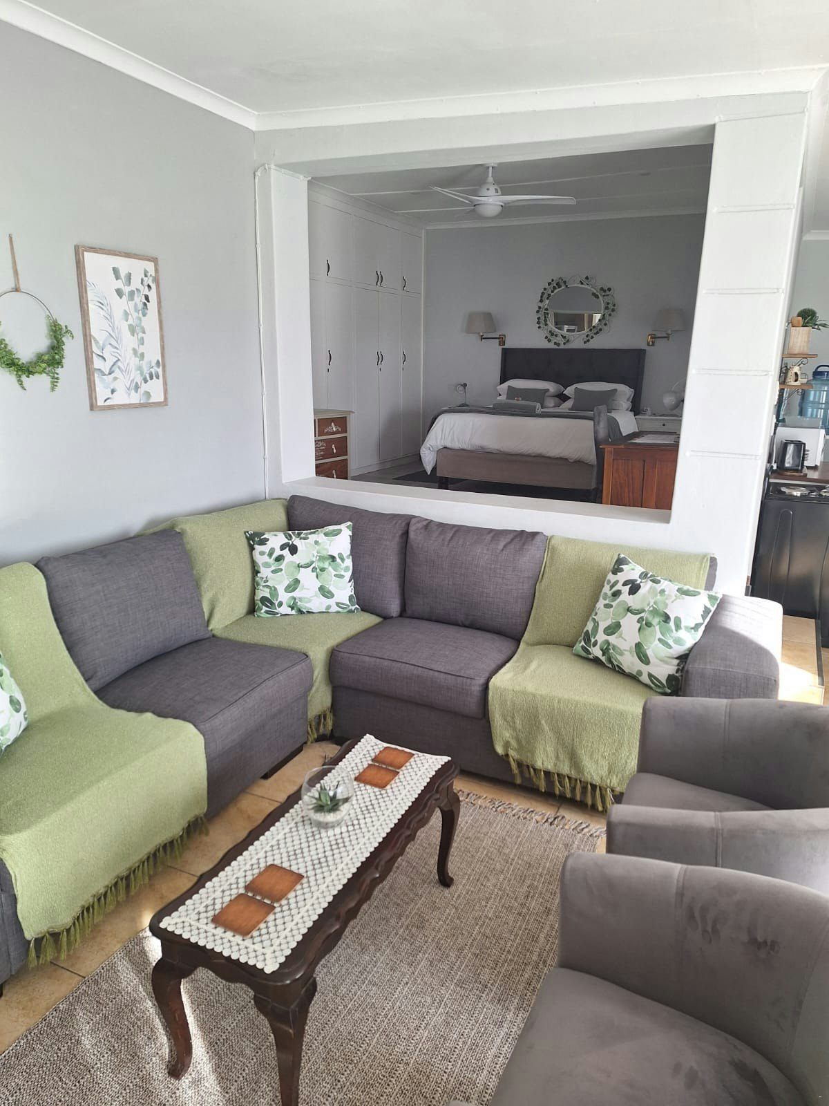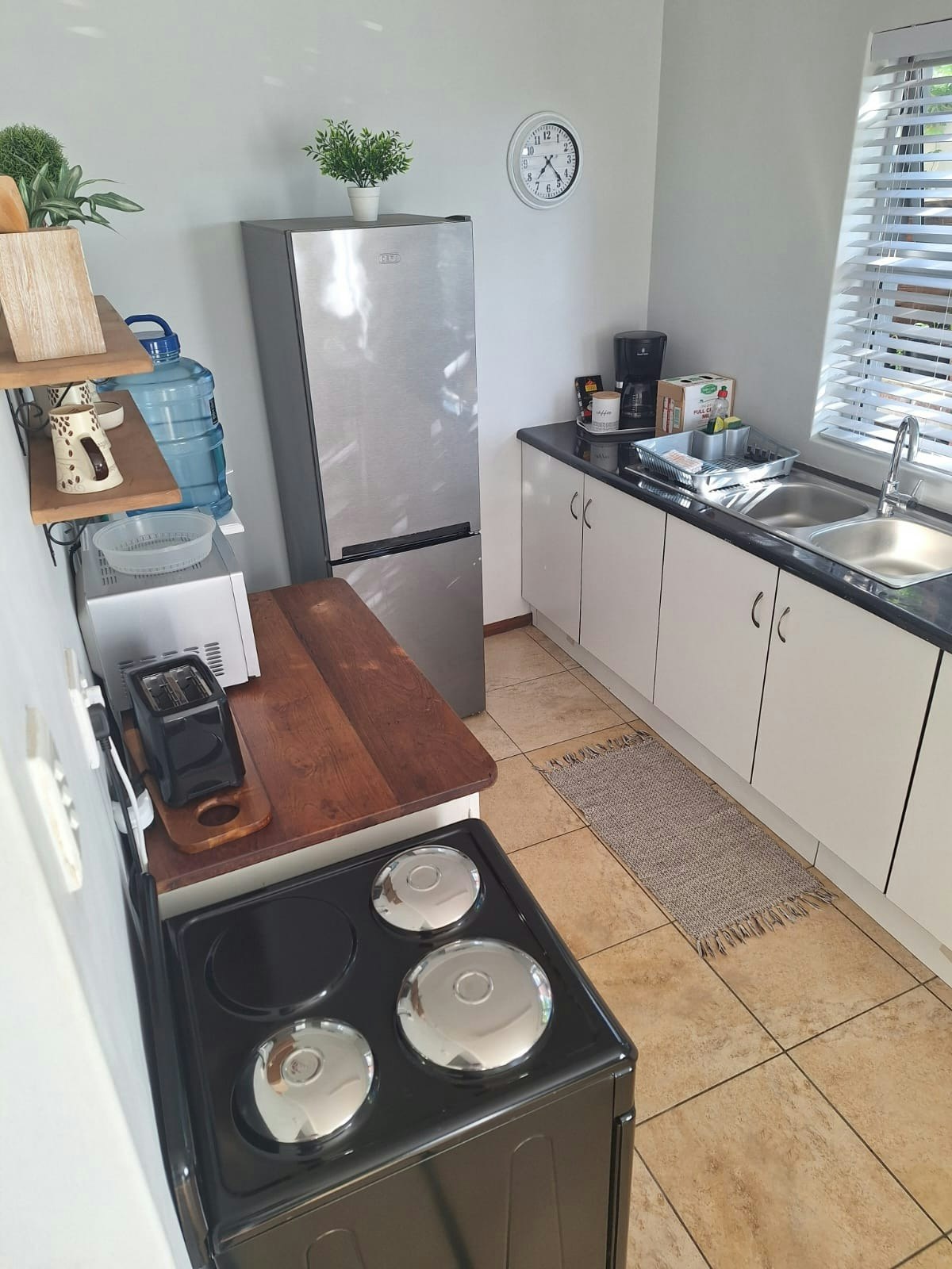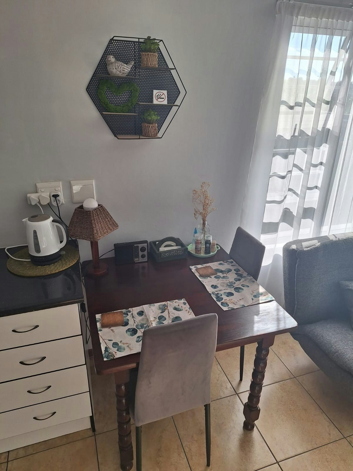 The main living area features a kitchen and a lounge area with comfortable seating and a TV with a full selection of DStv channels and Netflix. Access to free uncapped Wi-Fi is available. The kitchen is fully equipped with a stove, oven, microwave, fridge-freezer, cutlery and crockery as well as a 2-seater dining table.