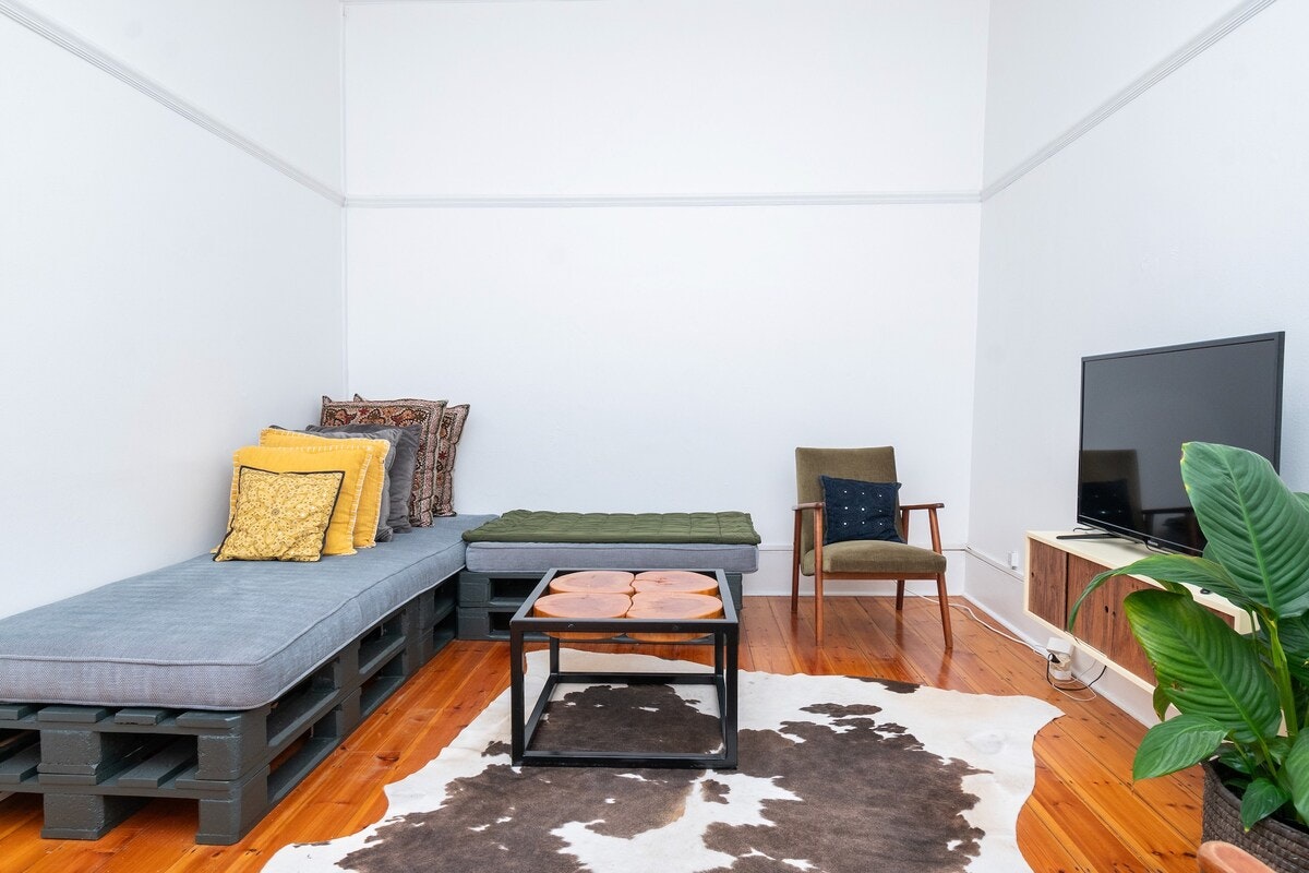 The open-plan living area features comfortable seating, a TV, a dining table, and a fully-equipped kitchen. The kitchen includes a fridge-freezer, stove, oven, microwave, and coffee- and tea-making facilities. Guests can unwind on the balcony or in the private courtyard downstairs.