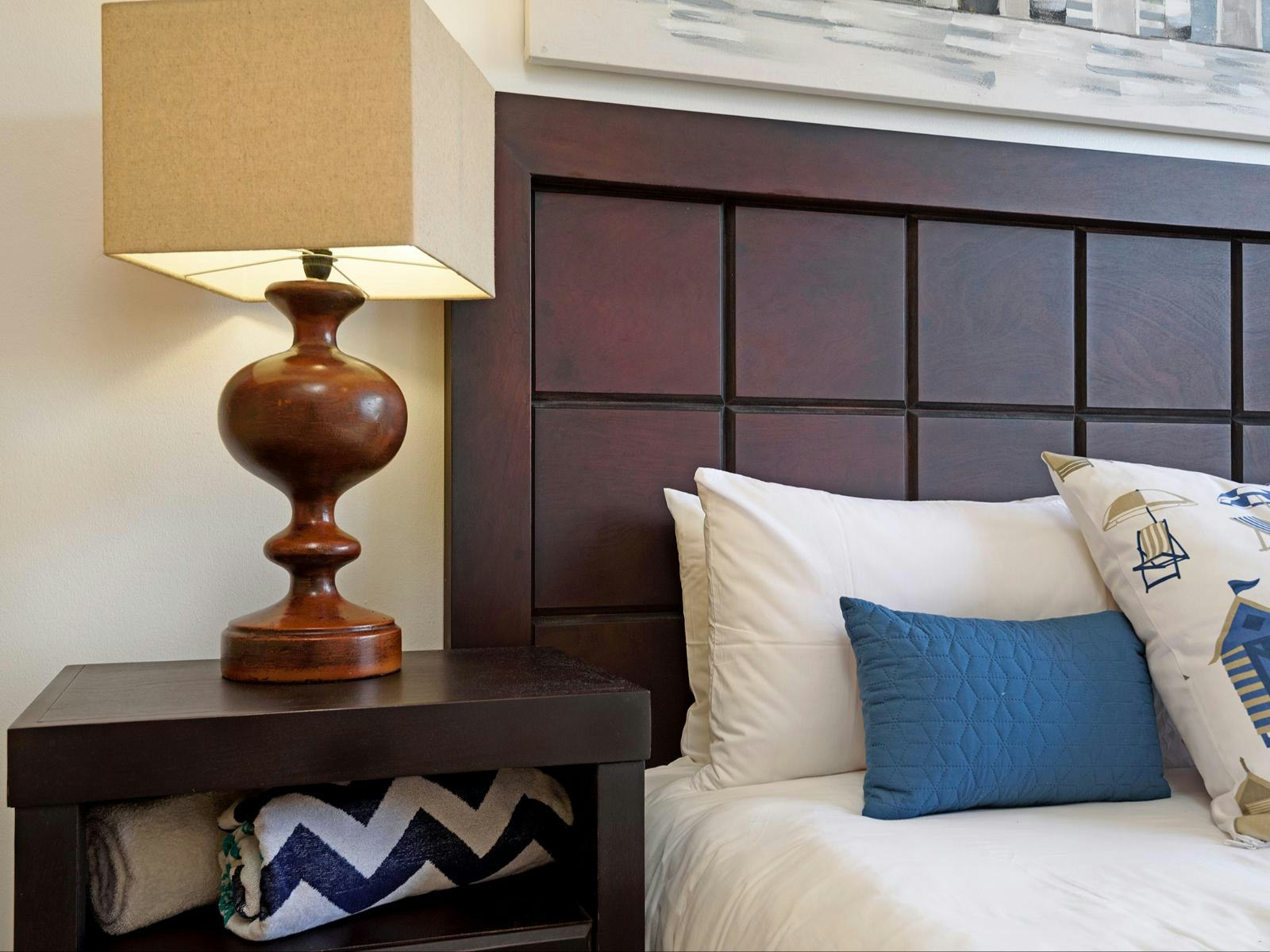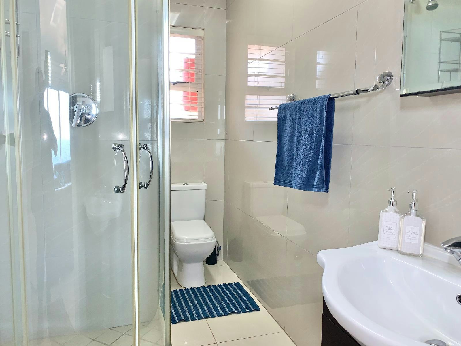 Guests enter into an open-plan air-conditioned living area and kitchen, which offers floor-to-ceiling picture windows offering uninterrupted views of the beach and ocean. The fully equipped kitchen contains a dishwasher, a coffee machine, a washing machine, a fridge, and other necessary appliances. The adjacent lounge has a lovely bar counter and bar stools; there is a flat-screen Smart TV which is connected to a dedicated fibre line so that guests can conveniently log into and watch their personal DStv package, and other preferred subscriptions with ease via Google Chromecast.
